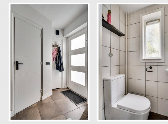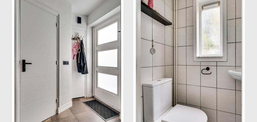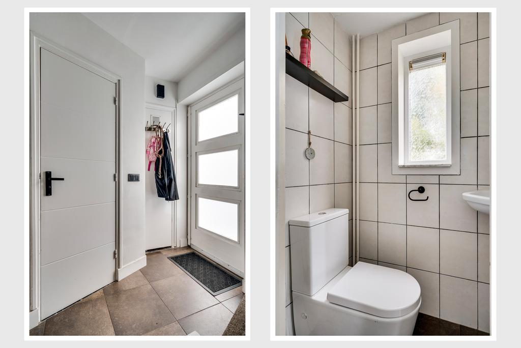 Vanaf de rustige straat ziet u de mooie voortuin, de oprit met garage en de buitentrap naar de voordeur. In de hal zijn de meterkast, de toiletruimte met fonteintje en de trap naar de eerste verdieping. De donkere tegelvloer in de hal en toiletruimte, met tegels in groot formaat, is uitgevoerd in een fraaie kleurstelling.