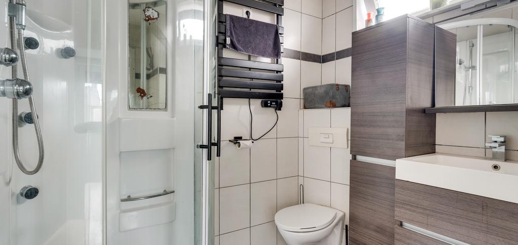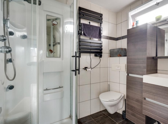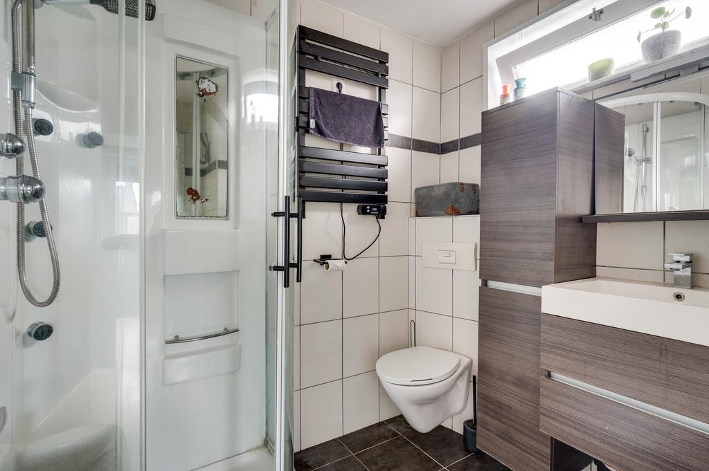 De badkamer (circa 3,8 m2) is ingedeeld met een wastafelmeubel, wandcloset, zwarte wandradiator en een ruime douche met zitje en wandstralen. Het raam zorgt voor lichtinval en een goede mogelijkheid tot ventilatie.