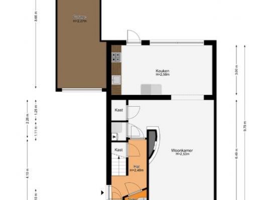 Links van de keuken is de diepe garage van circa 8,66 meter x 2,95/2,55 meter. Met een oppervlakte van circa 23 m2 is dit een perfecte ruimte voor de fietsen, auto en een werkbank met gereedschap. Aan de voorzijde, naar de oprit voor twee auto’s, is een elektrisch bedienbare sectionaalpoort geplaatst.