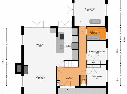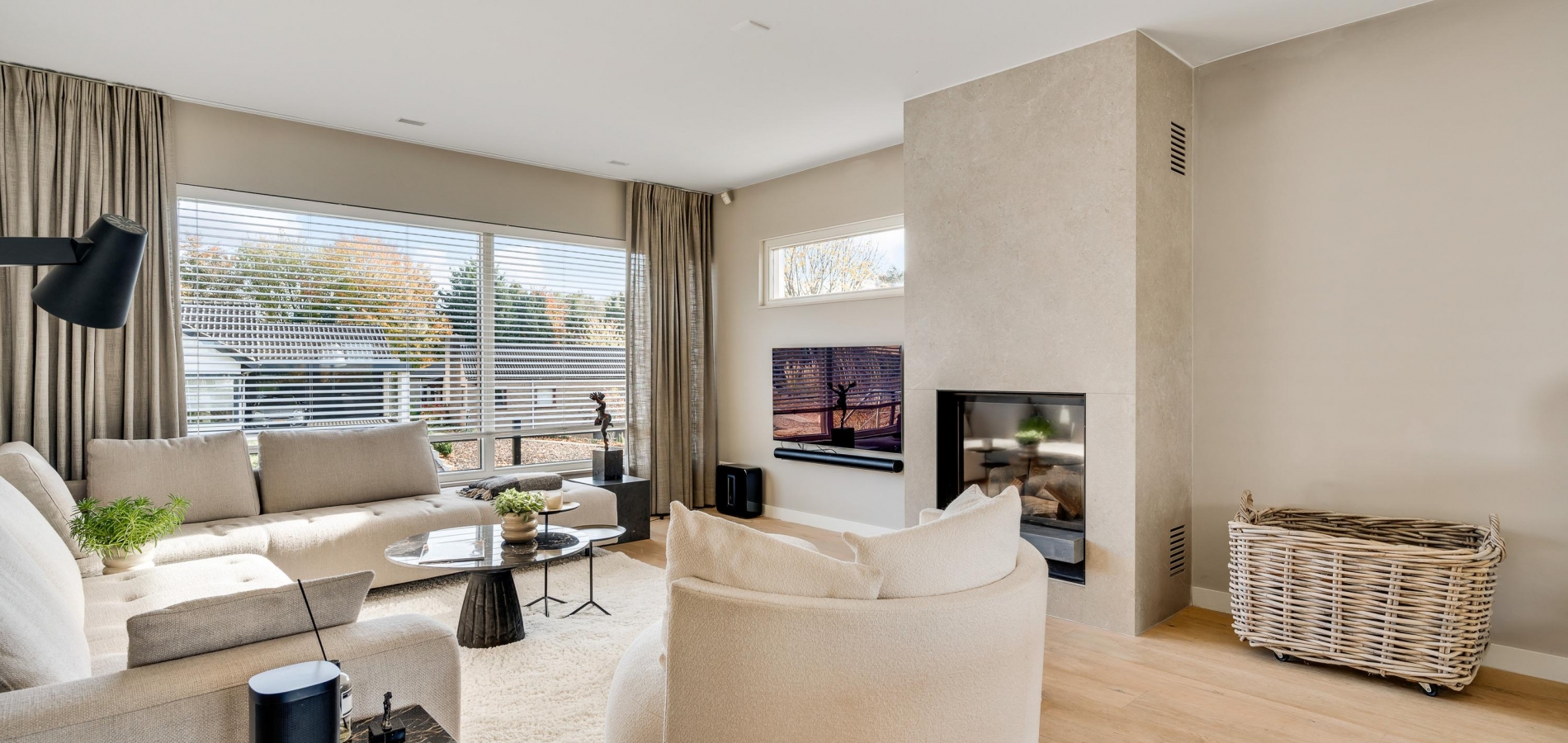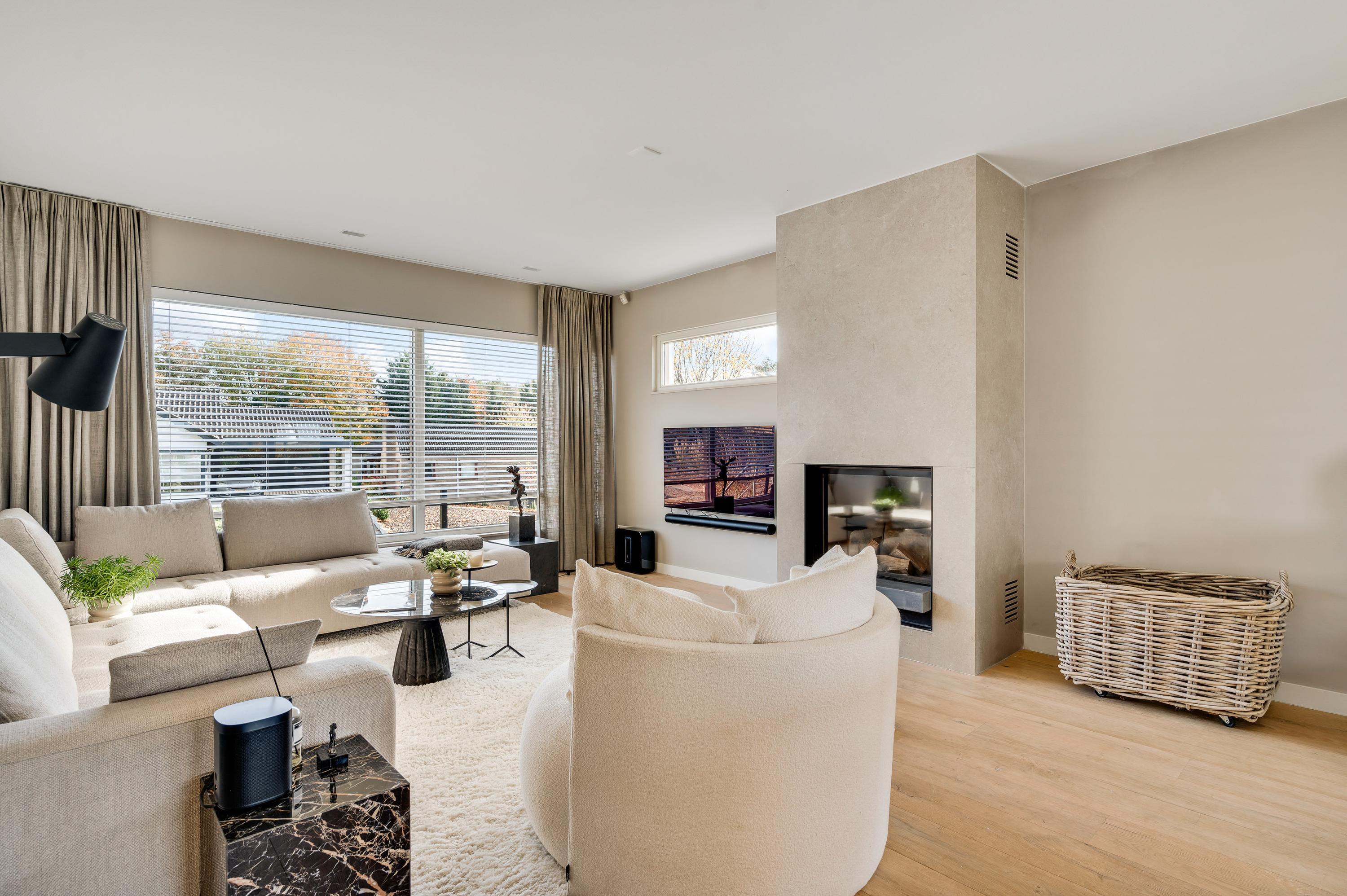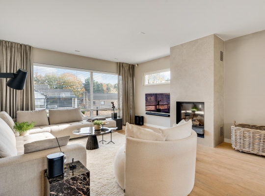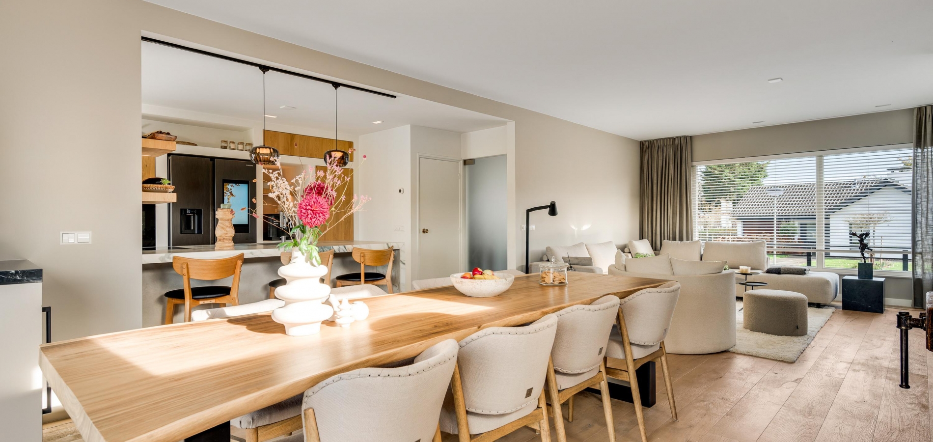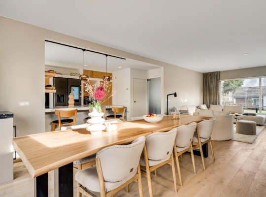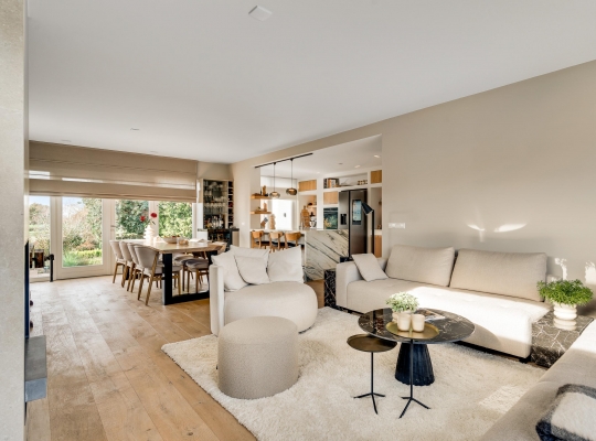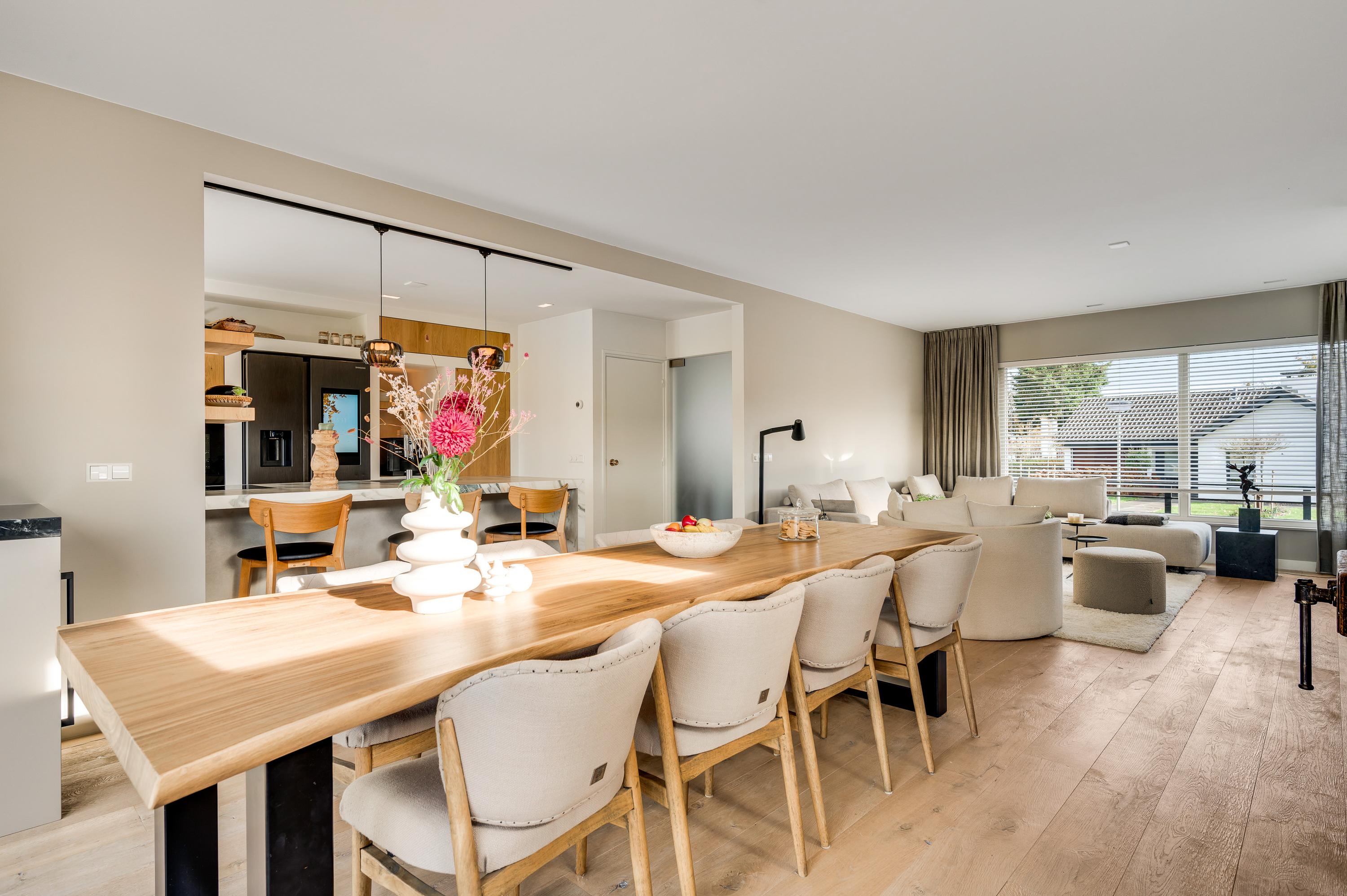 De woon-/eetkamer (circa 9,04 x 4,49) heeft lichtinval vanaf drie zijden, een schouw met open haard met elektrische glasdeur te openen met afstandsbediening en een aangename sfeer. Het zitgedeelte is aan de voorzijde en aan de achterzijde, bij het eetgedeelte, ziet u openslaande deuren naar de tuin.