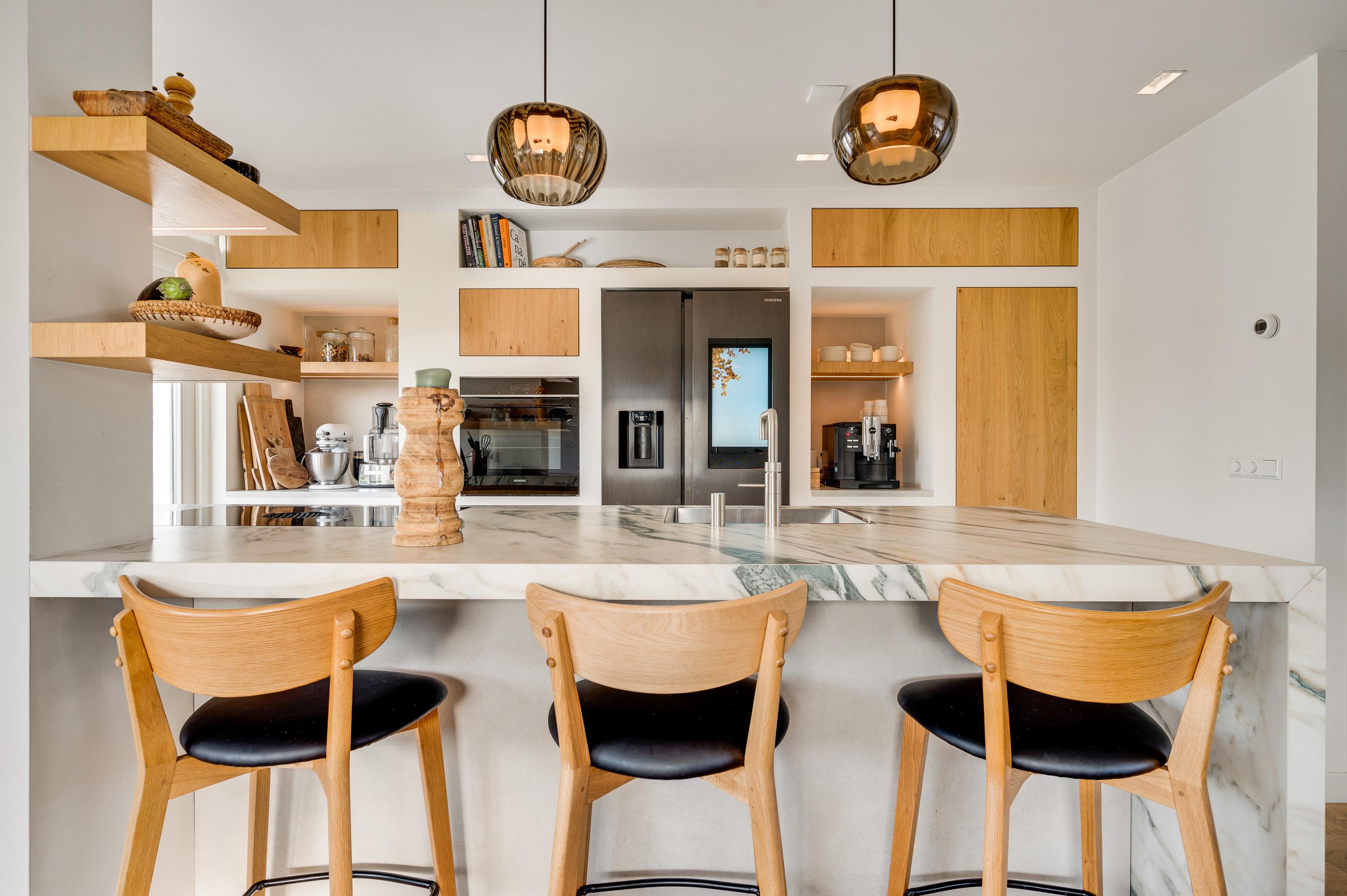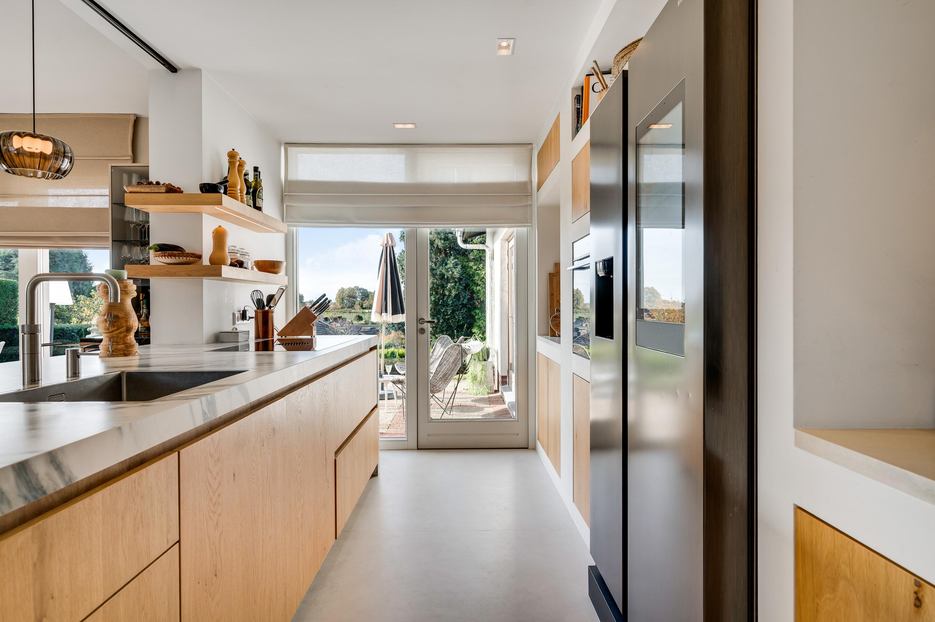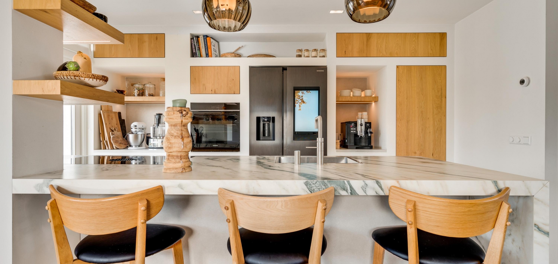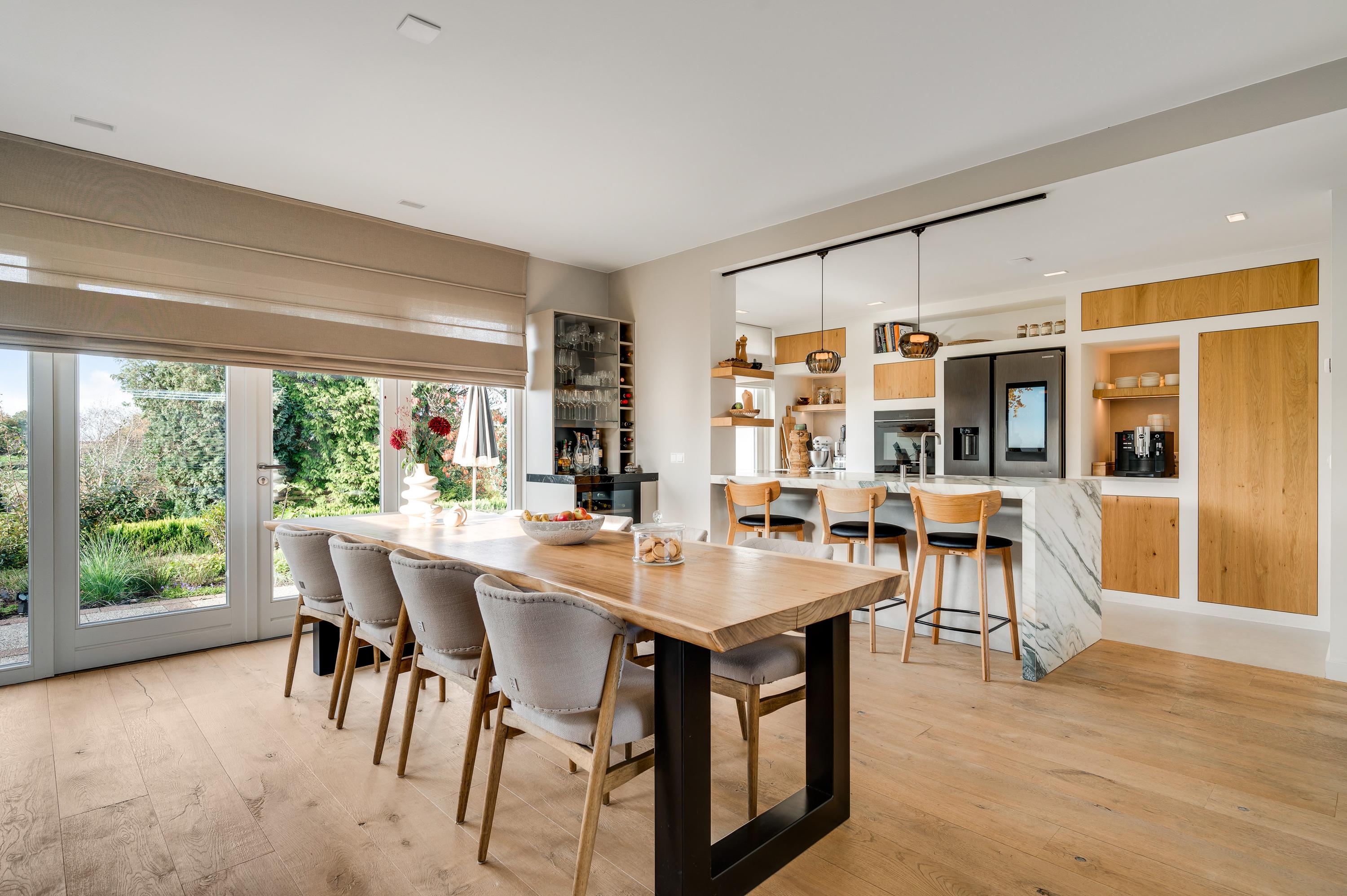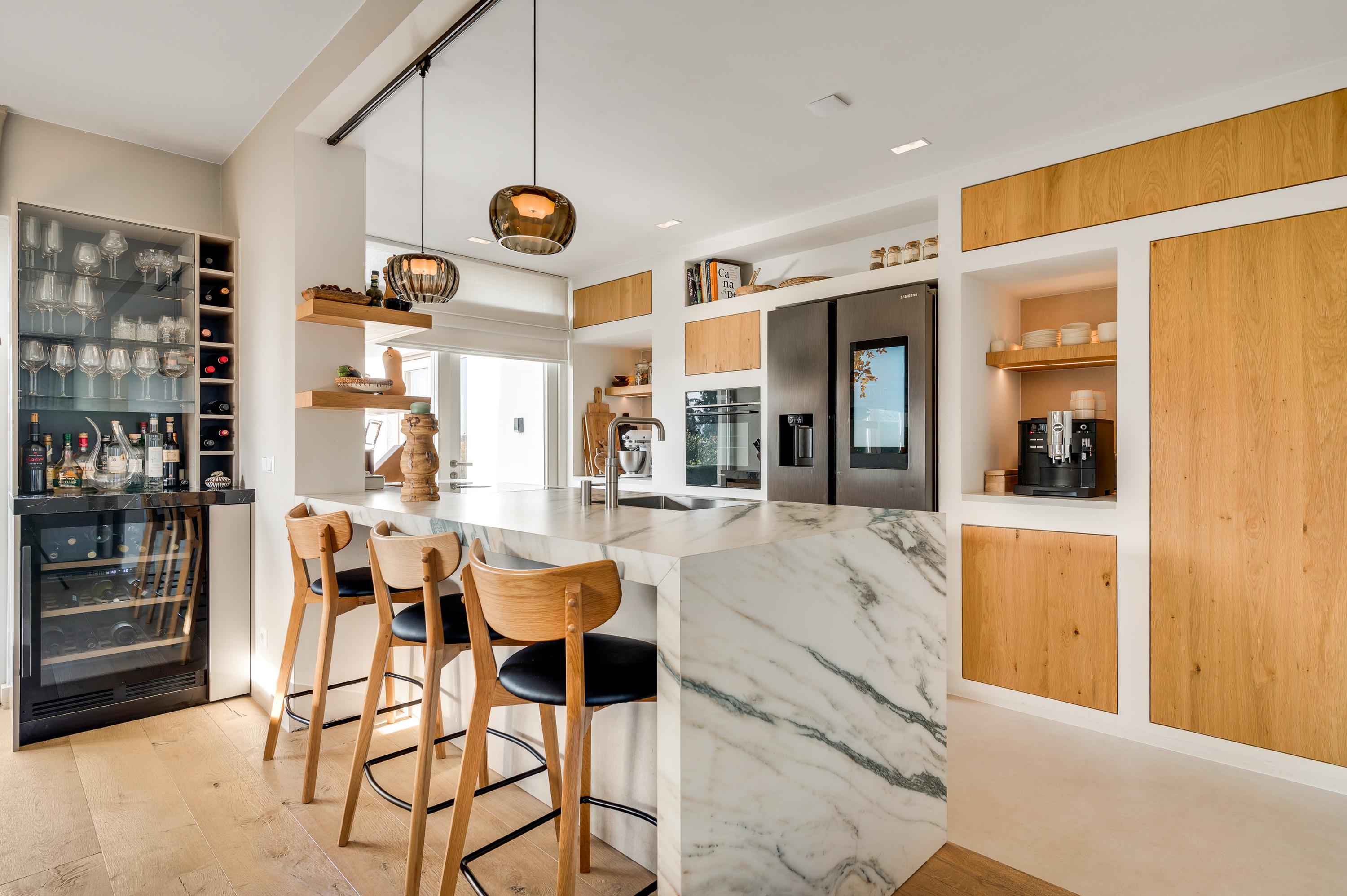 Uw oog valt op de prachtige keuken (circa 4,39 x 2,70) met een groot eiland en een kastenwand. Fraaie elementen zijn het gebruik van marmer en hout, de koffiecorner en de zitgelegenheid aan het eiland. De Bora inductie kookplaat met afzuiging, een Quooker, combi-oven en vaatwasser zijn ingebouwd. Blikvanger is de French-door Family Hub koel-/vriescombinatie van Samsung. Deze koelkast heeft een water-/ijsdispenser en een groot touchscreen waarop het weer, de klok, het nieuws zichtbaar zijn. Andere mogelijkheden zijn het weergeven van je agenda en notities, het streamen van muziek en het raadplegen van recepten. Met ingebouwde camera’s kunt u zelfs vanuit de supermarkt in de koelkast kijken!
