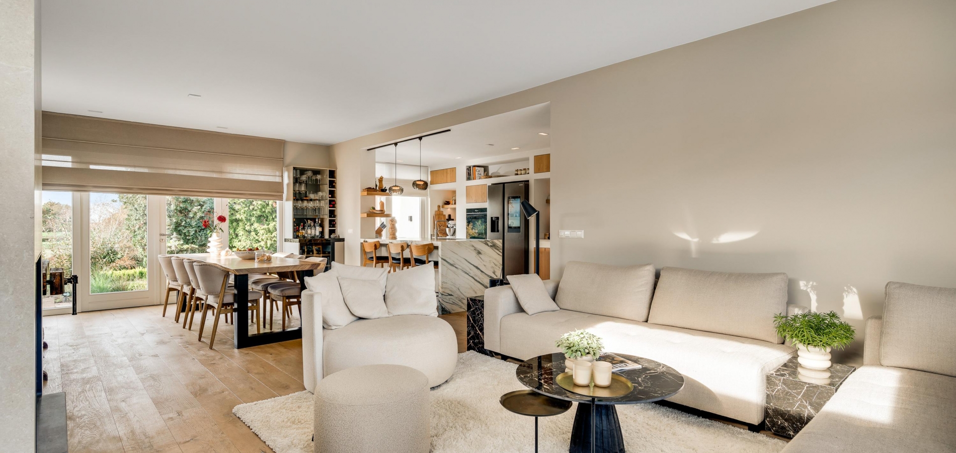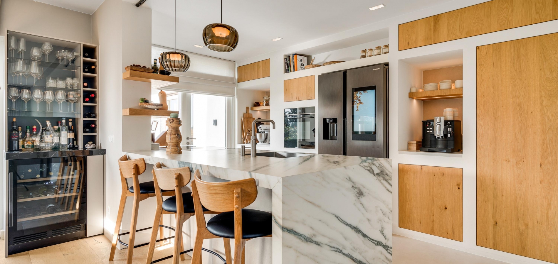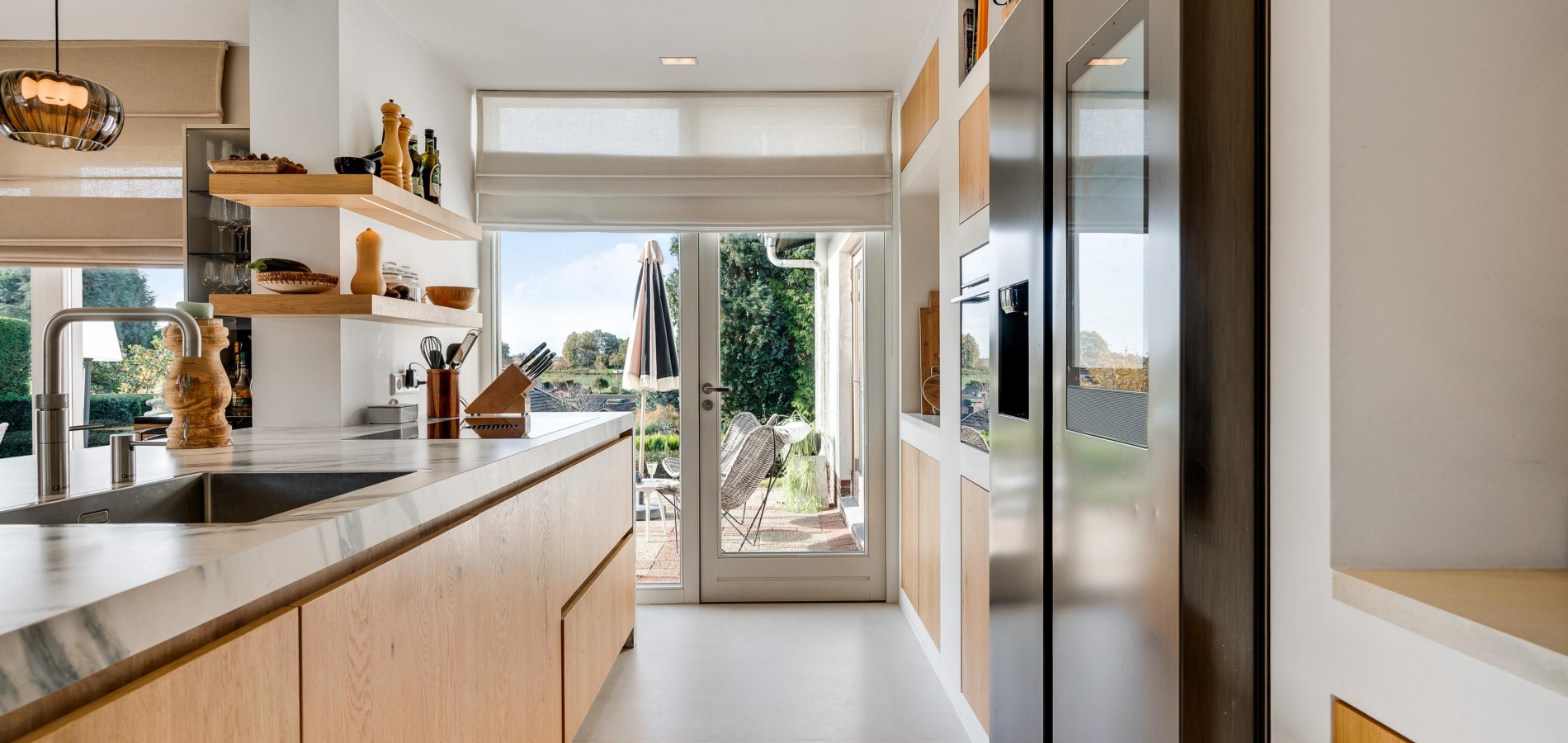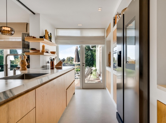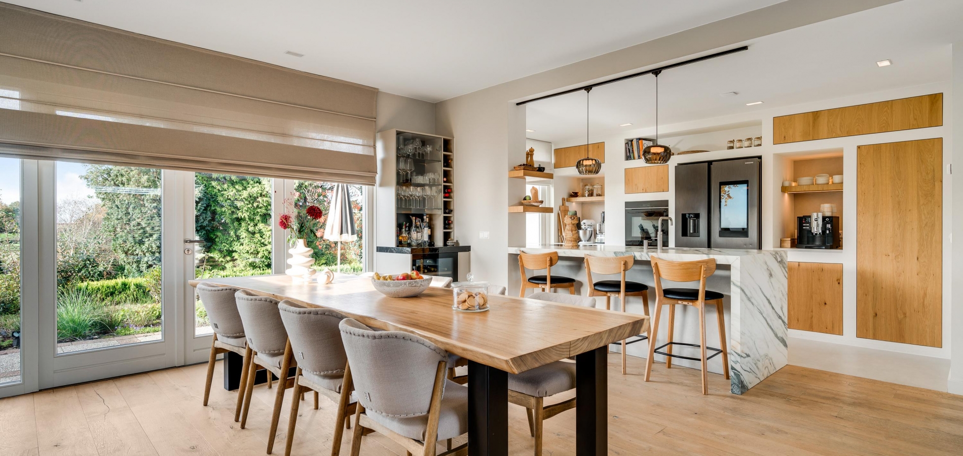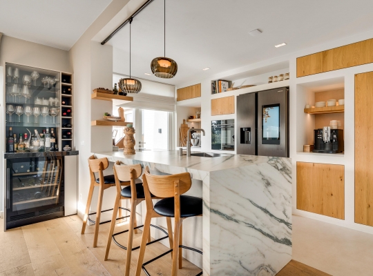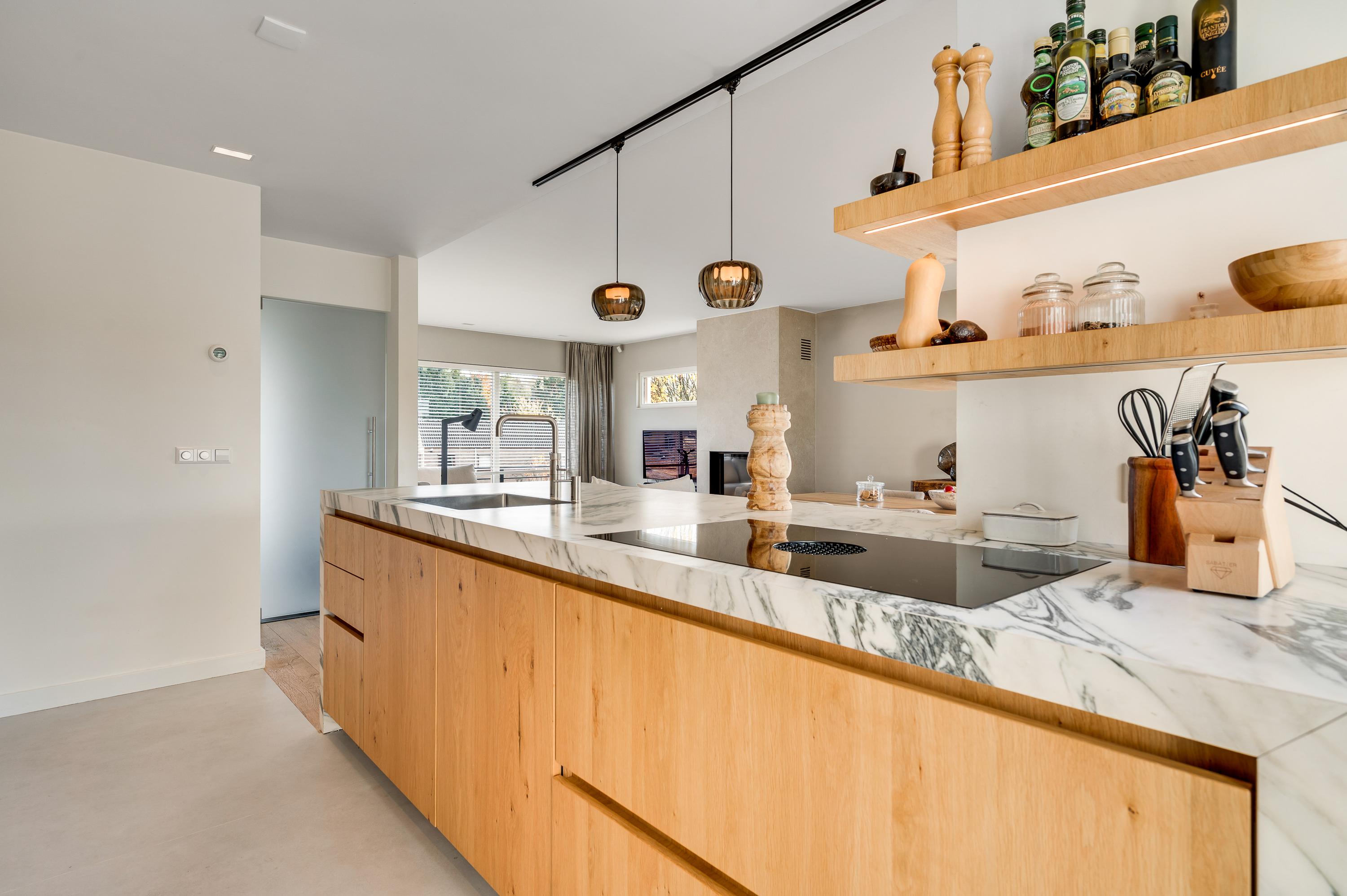 Uw oog valt op de prachtige keuken (circa 4,39 x 2,70) met een groot eiland en een kastenwand. Fraaie elementen zijn het gebruik van marmer en hout, de koffiecorner en de zitgelegenheid aan het eiland. De Bora inductie kookplaat met afzuiging, een Quooker, combi-oven en vaatwasser zijn ingebouwd. Blikvanger is de French-door Family Hub koel-/vriescombinatie van Samsung. Deze koelkast heeft een water-/ijsdispenser en een groot touchscreen waarop het weer, de klok, het nieuws zichtbaar zijn. Andere mogelijkheden zijn het weergeven van je agenda en notities, het streamen van muziek en het raadplegen van recepten. Met ingebouwde camera’s kunt u zelfs vanuit de supermarkt in de koelkast kijken!