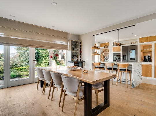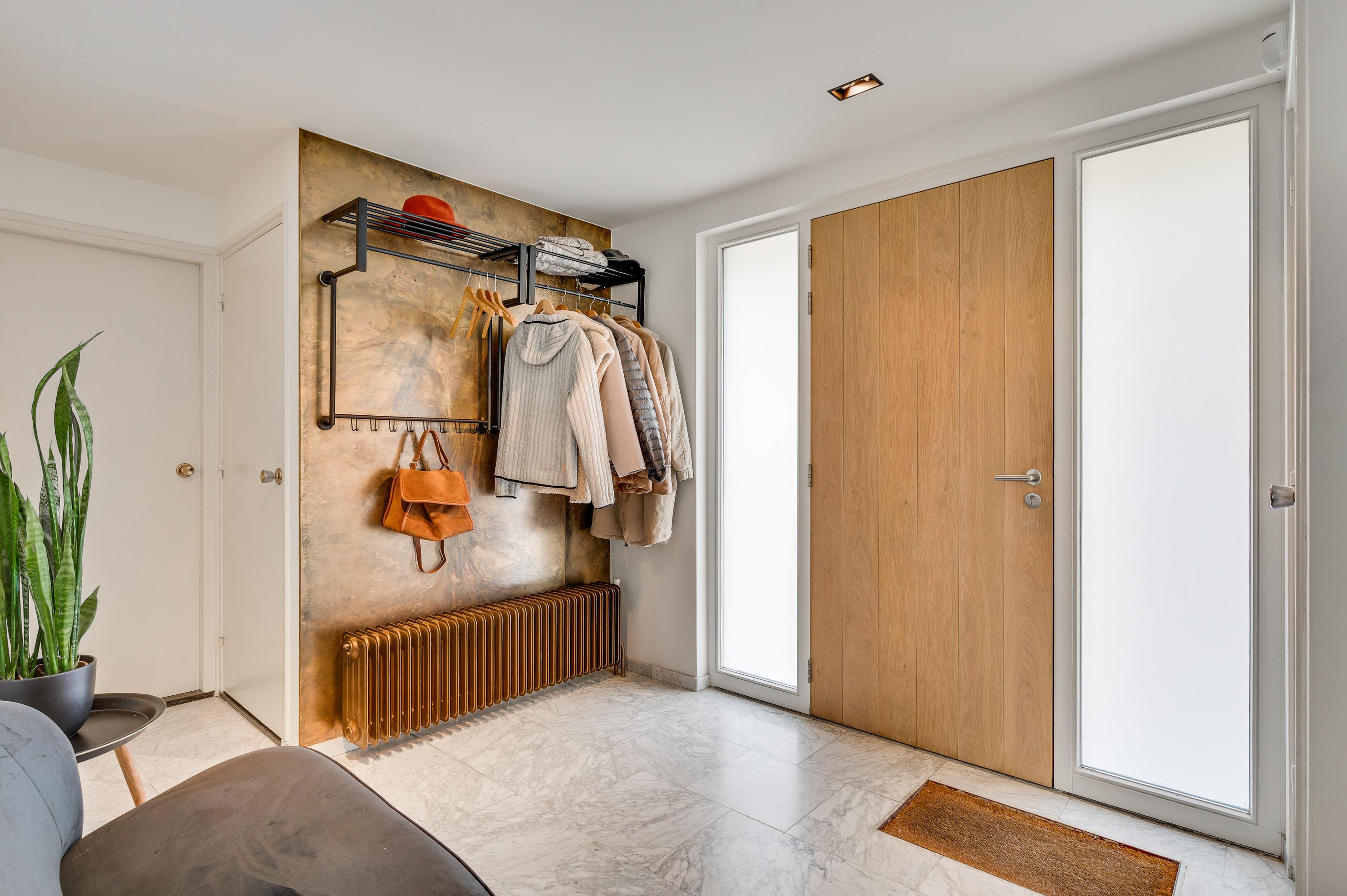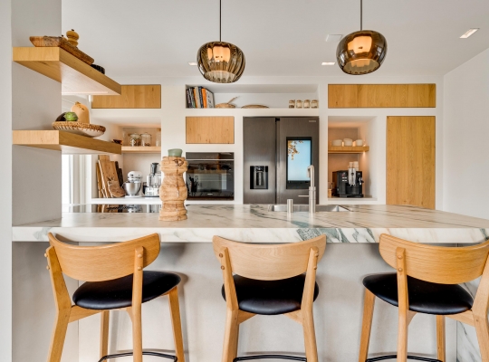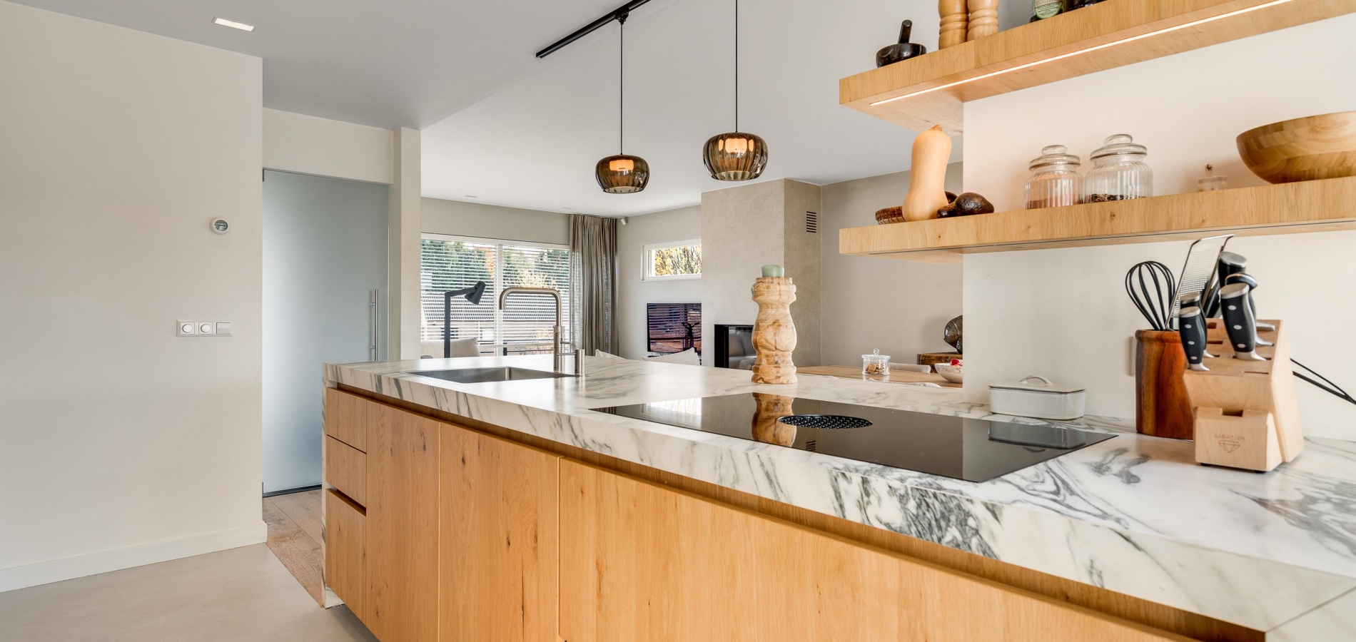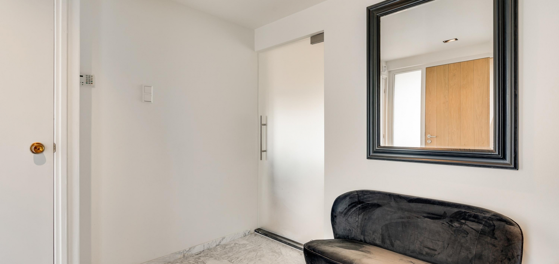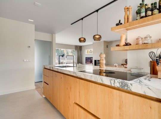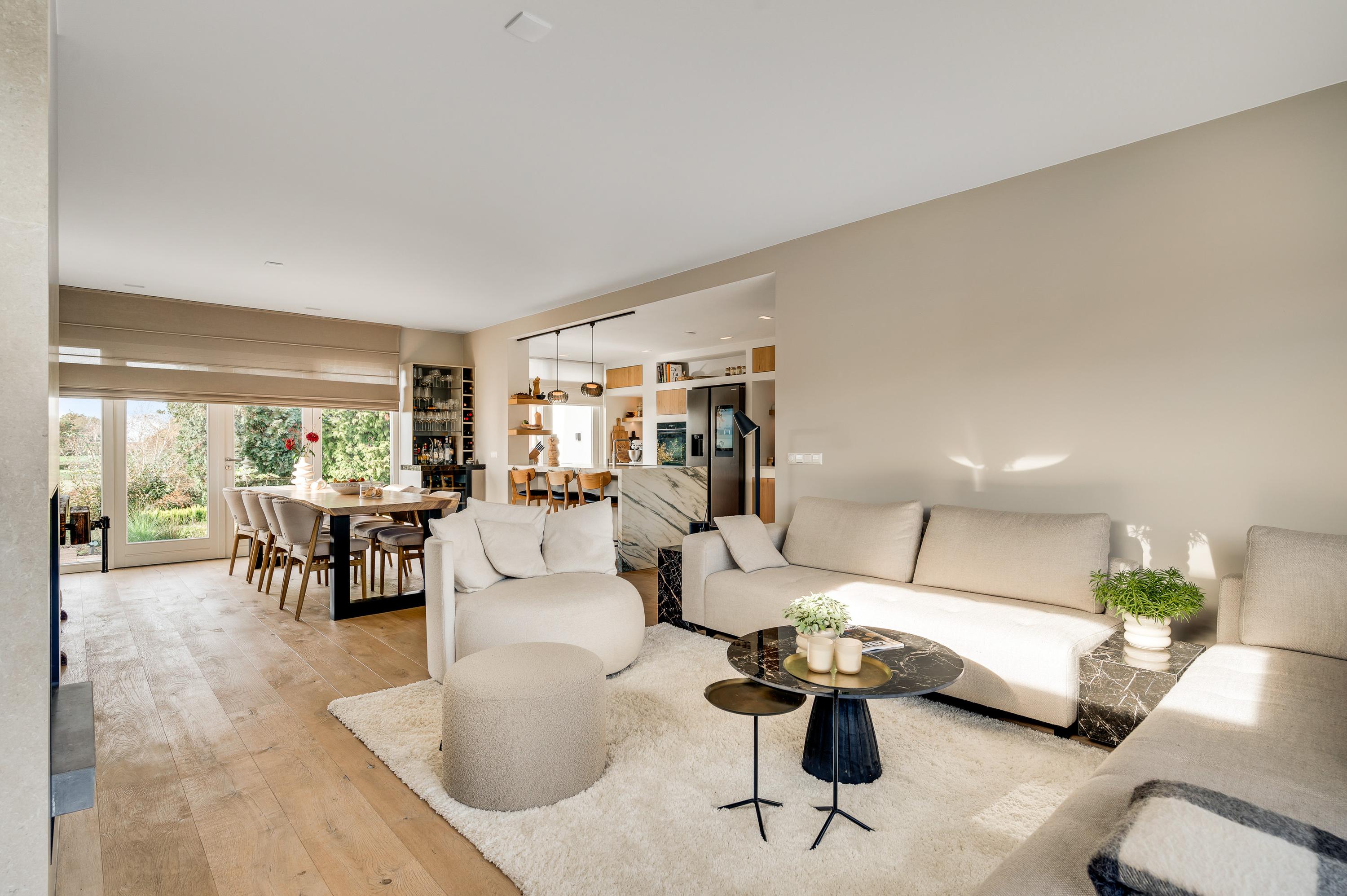 Uw oog valt op de prachtige keuken (circa 4,39 x 2,70) met een groot eiland en een kastenwand. Fraaie elementen zijn het gebruik van marmer en hout, de koffiecorner en de zitgelegenheid aan het eiland. De Bora inductie kookplaat met afzuiging, een Quooker, combi-oven en vaatwasser zijn ingebouwd. Blikvanger is de French-door Family Hub koel-/vriescombinatie van Samsung. Deze koelkast heeft een water-/ijsdispenser en een groot touchscreen waarop het weer, de klok, het nieuws zichtbaar zijn. Andere mogelijkheden zijn het weergeven van je agenda en notities, het streamen van muziek en het raadplegen van recepten. Met ingebouwde camera’s kunt u zelfs vanuit de supermarkt in de koelkast kijken!