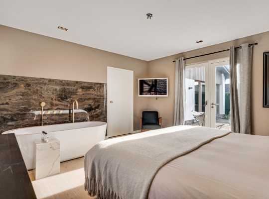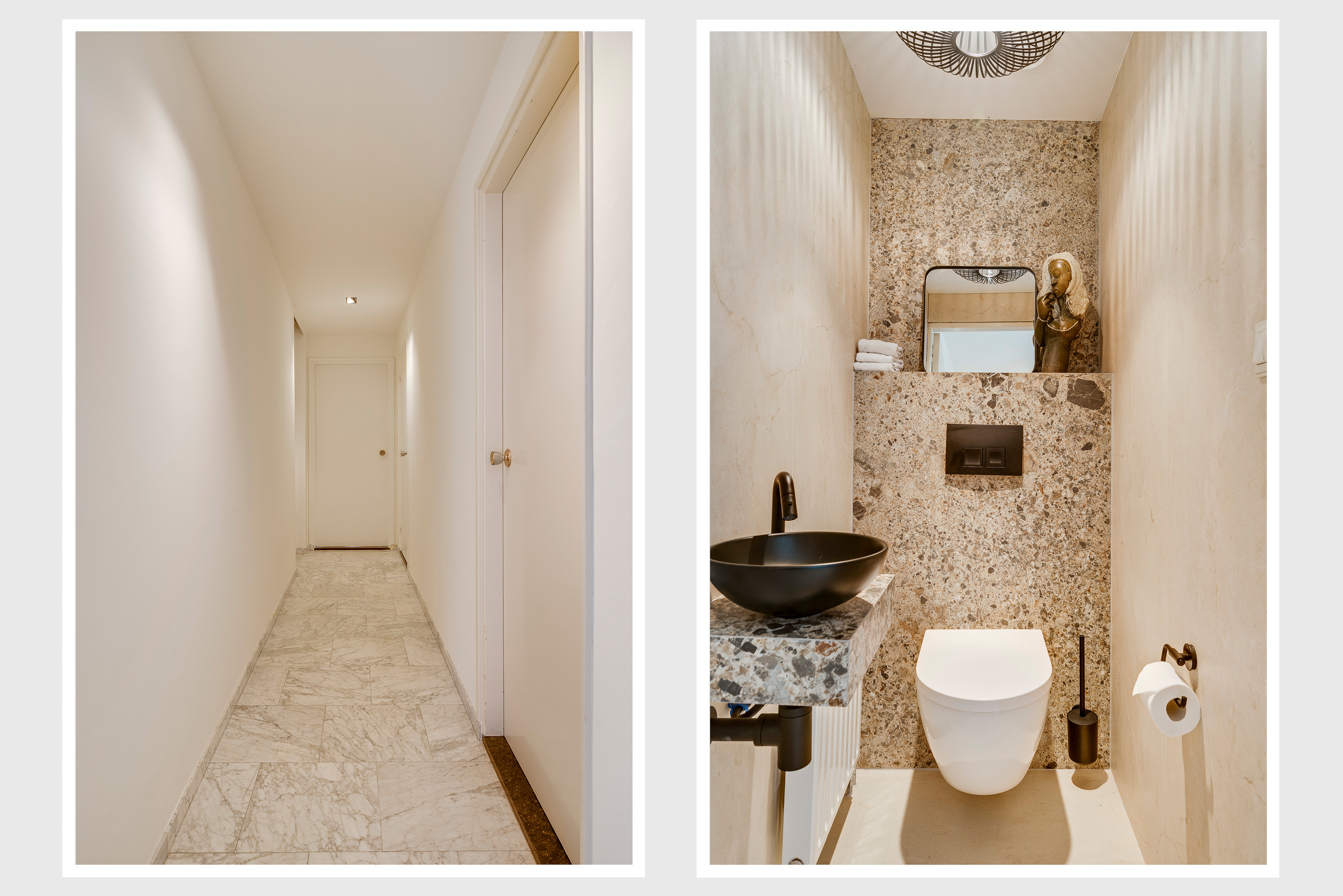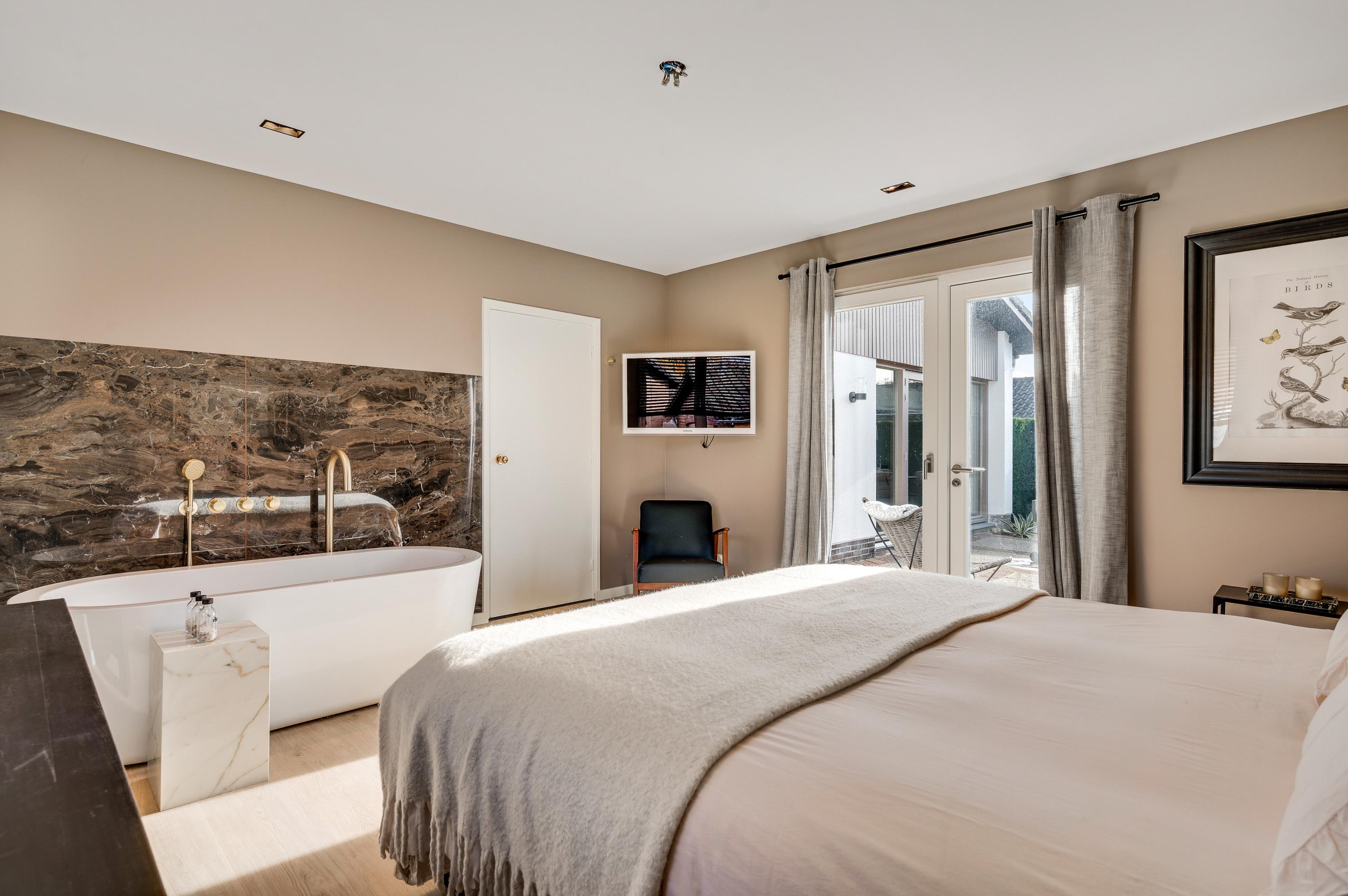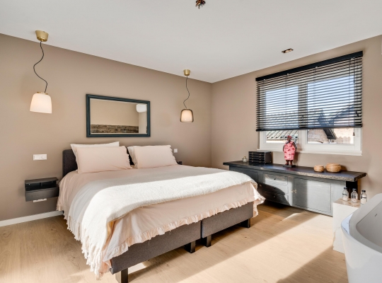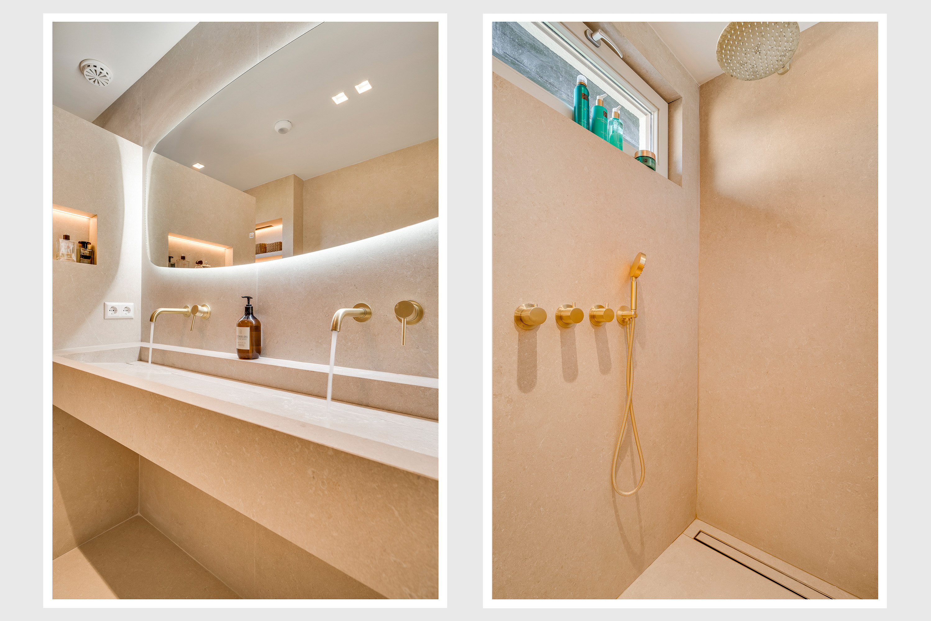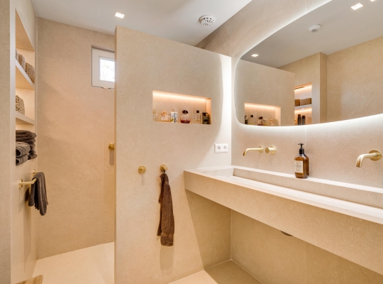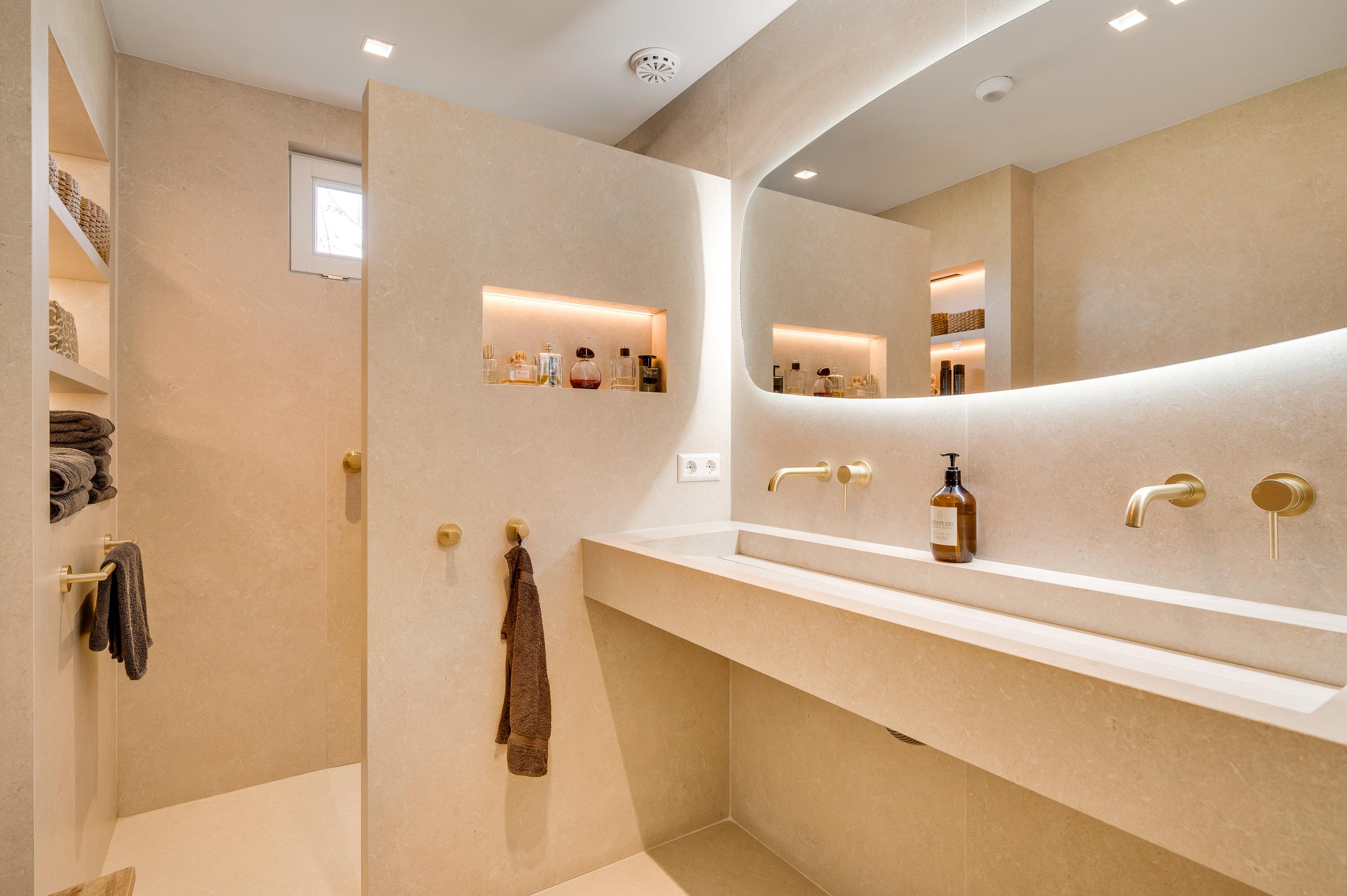 De badkamer (circa 2,57 x 1,74) is stijlvol en het toppunt van luxe. U heeft de beschikking over een royale inloopdouche, een open kast met vakken en een maatwerk wastafel in dezelfde kleur als de wanden en vloer. Alles klopt: van de kleur van de kranen tot de spiegel en verlichting.