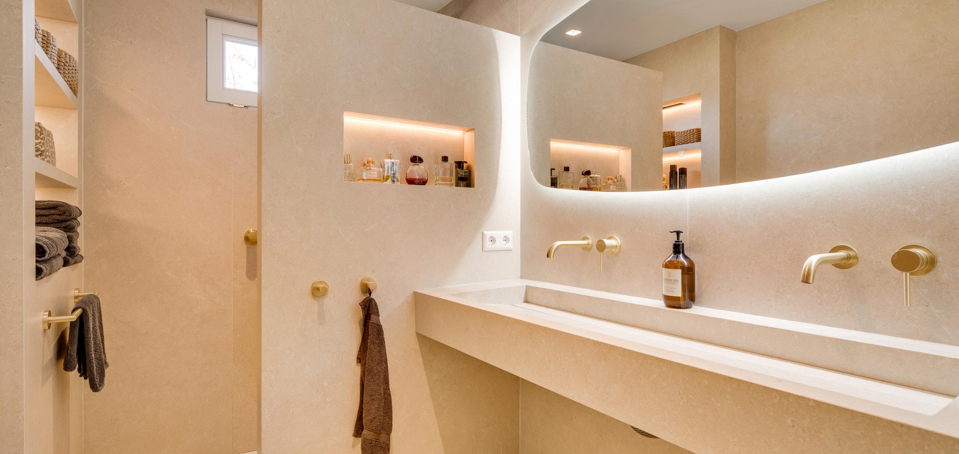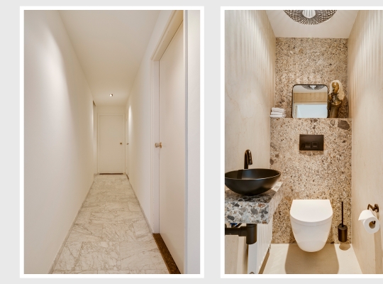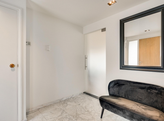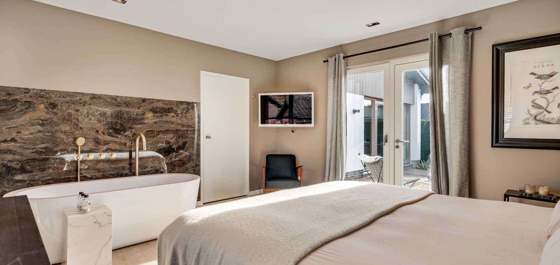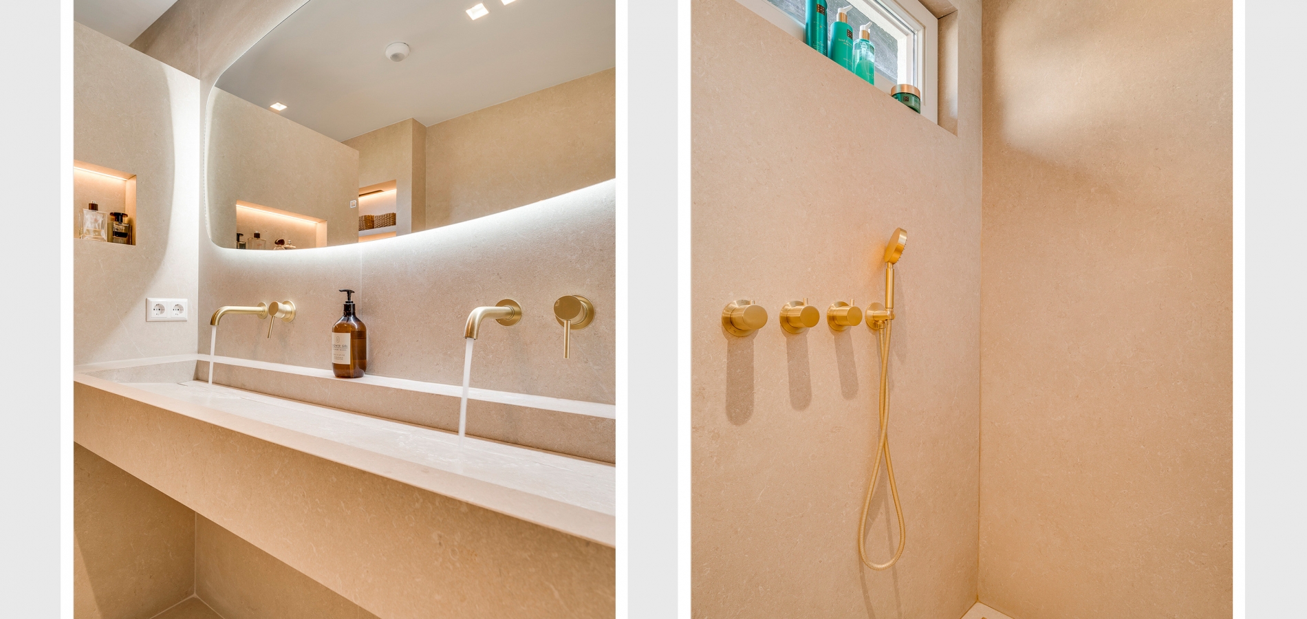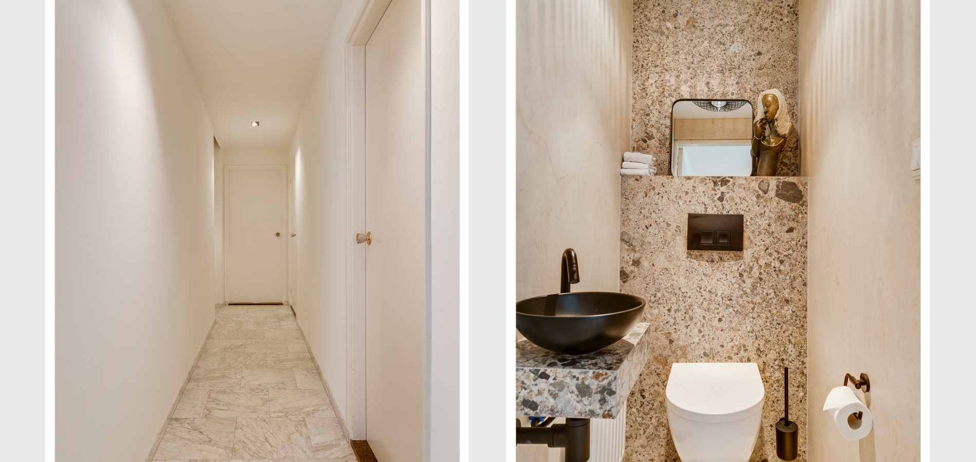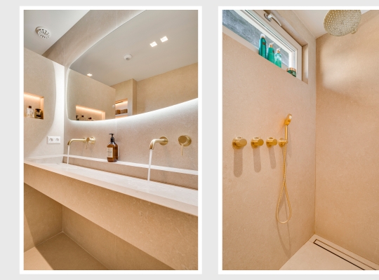 De badkamer (circa 2,57 x 1,74) is stijlvol en het toppunt van luxe. U heeft de beschikking over een royale inloopdouche, een open kast met vakken en een maatwerk wastafel in dezelfde kleur als de wanden en vloer. Alles klopt: van de kleur van de kranen tot de spiegel en verlichting.