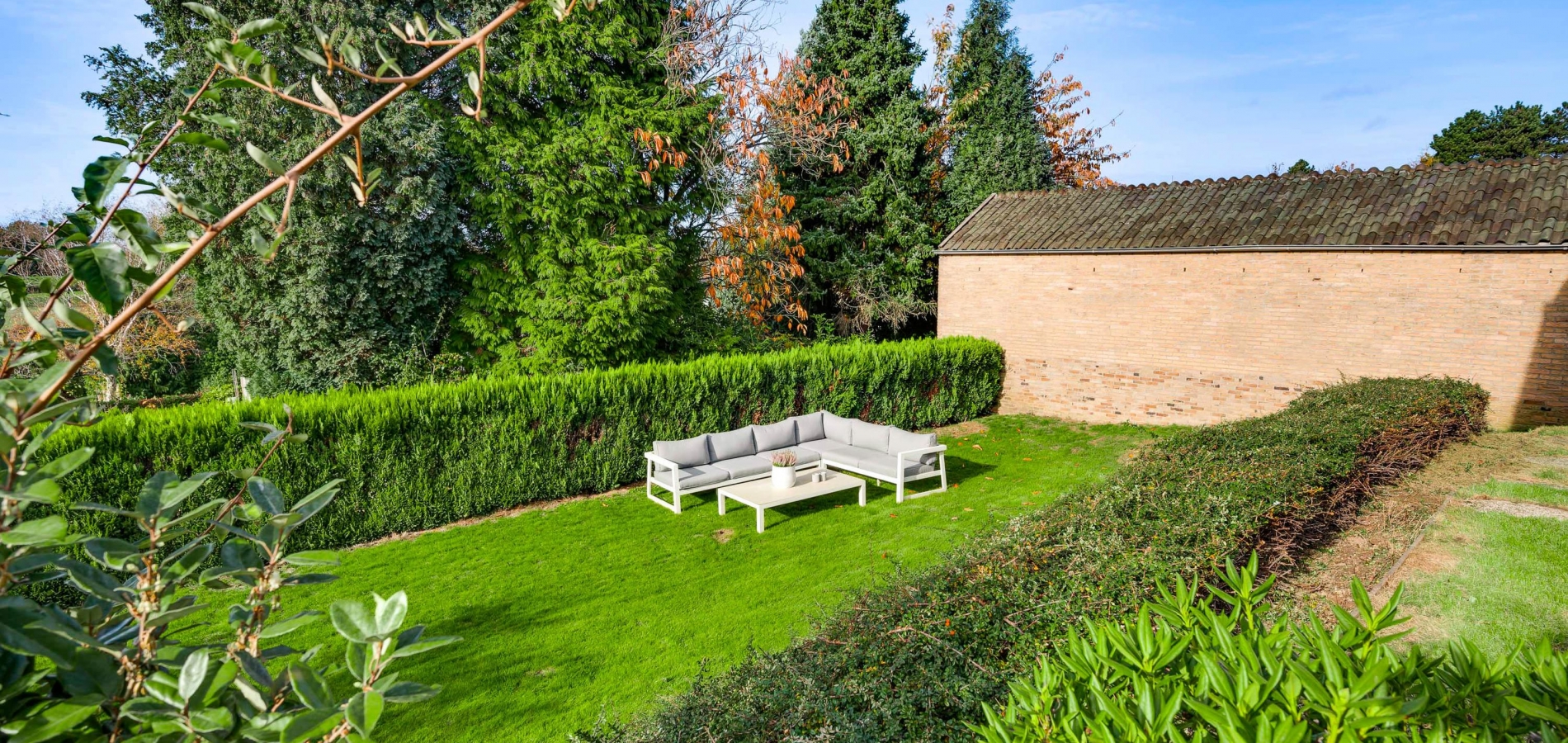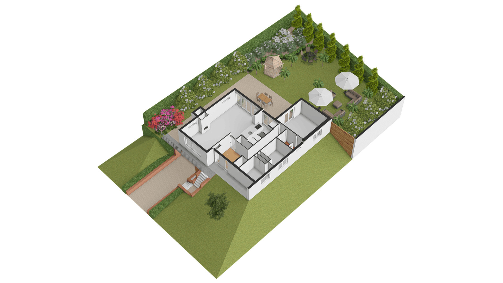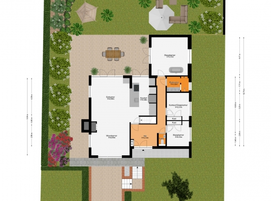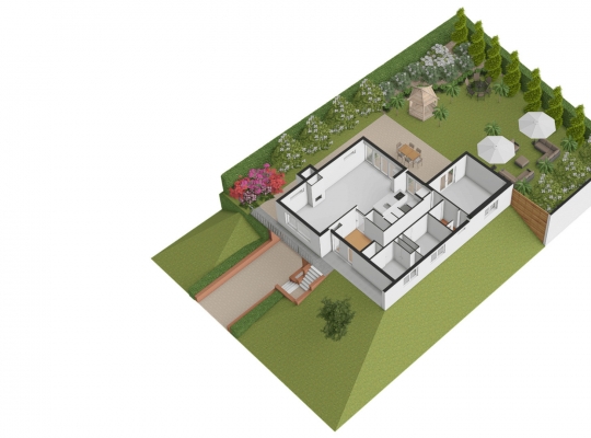Rondom de bungalow ligt een royale tuin met gevarieerde, merendeels groenblijvende beplanting en gras. De achtertuin met groot terras heeft een uitstekende zonligging (west) en aan de linkerzijde is een eigen achterom, via het bordes boven de garage.