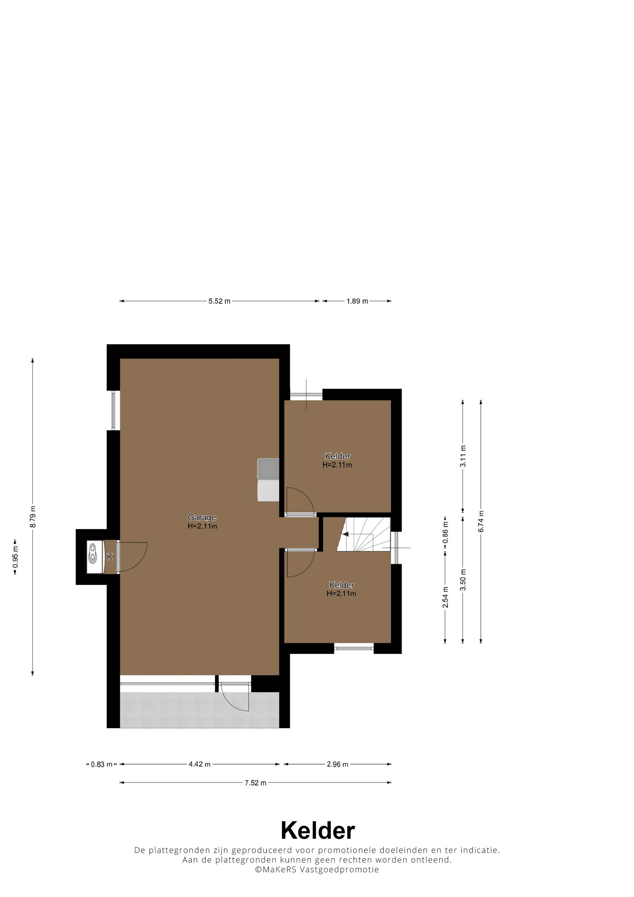 Het souterrain heeft een eigen entree aan de kant van de oprit, waar meerdere auto’s kunnen staan. Niet alleen op de oprit, maar ook in de garage (circa 8,79 x 4,42) is ruimte voor de auto, motor en (kinder)fietsen. De wasmachine en droger kunnen in de garage staan, waar de wasruimte bovendien binnendoor te bereiken is. In een kast bevindt zich de opstelling van de HR-ketel (Nefit Ecomline HR, eigendom). In kelder I (circa 2,96 x 2,54) is de trap naar de begane grond en kelder II (circa 2,96 x 3,11) heeft een deur in de achtergevel. Niet alleen als berging, maar ook als wijnkelder zijn deze ruimtes heel geschikt.