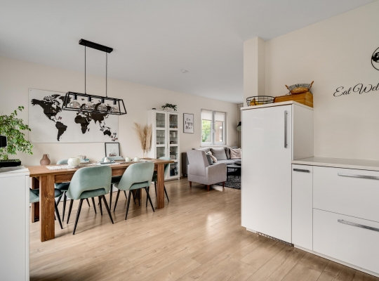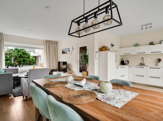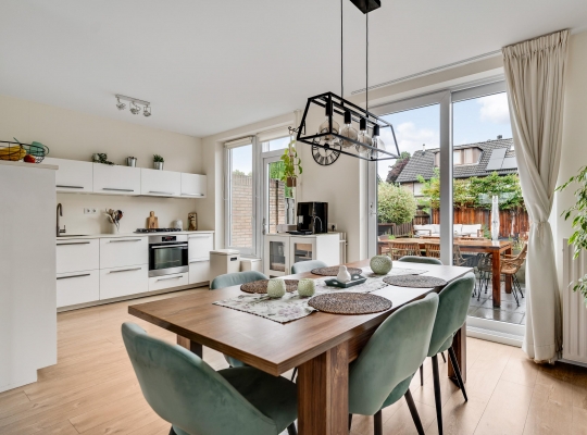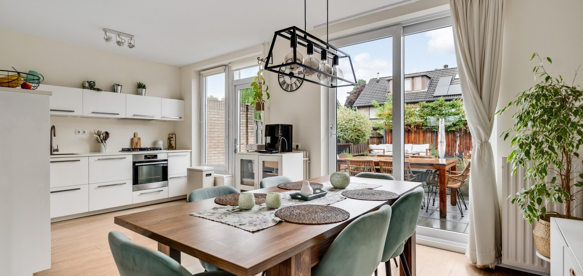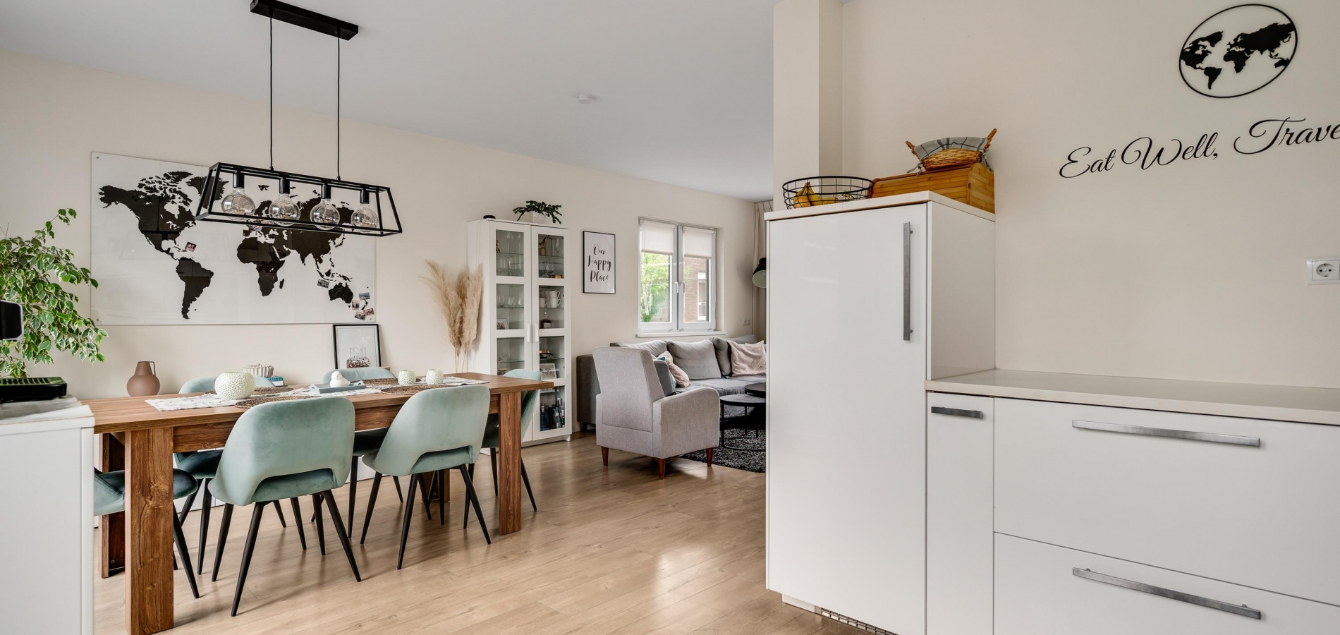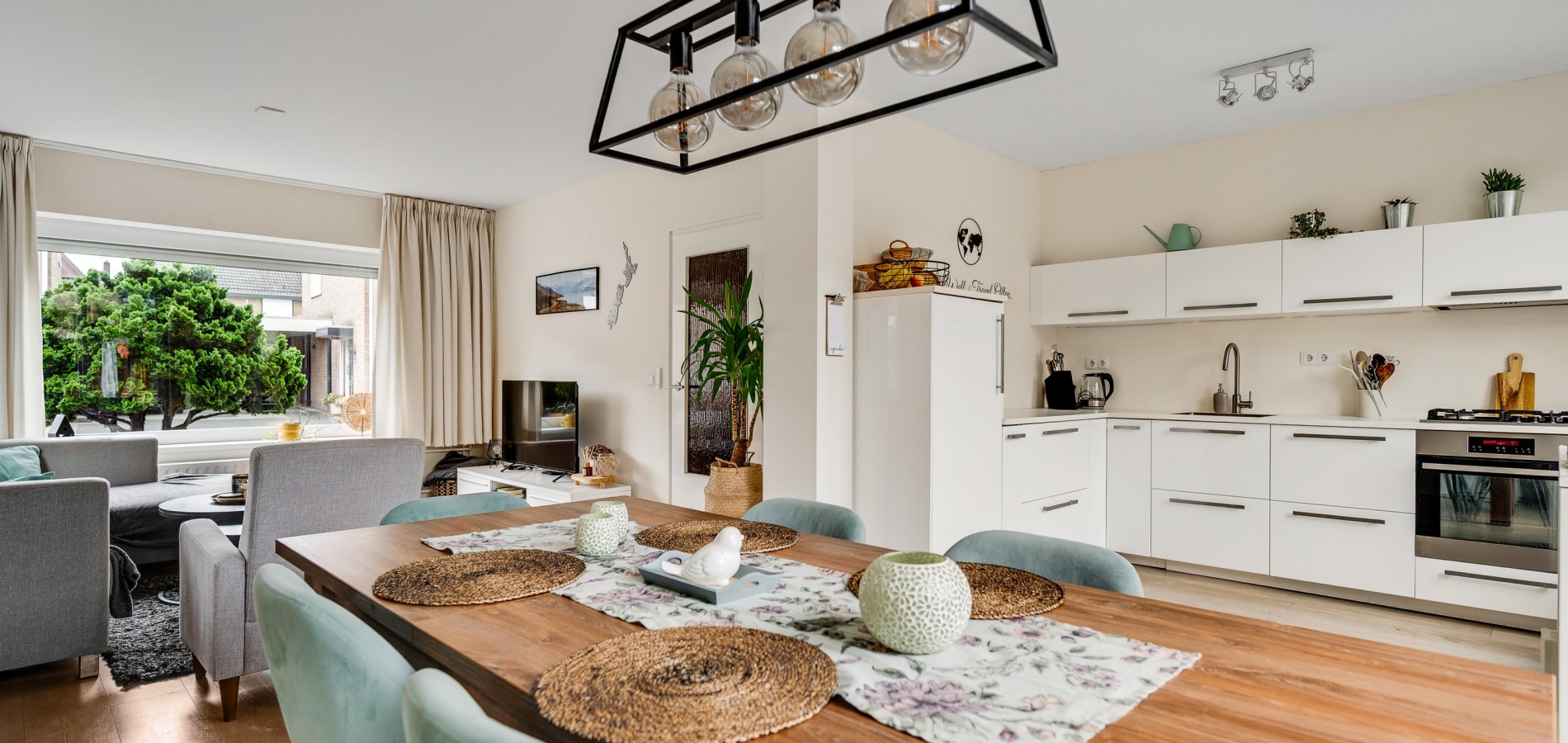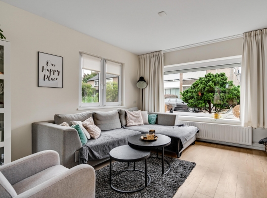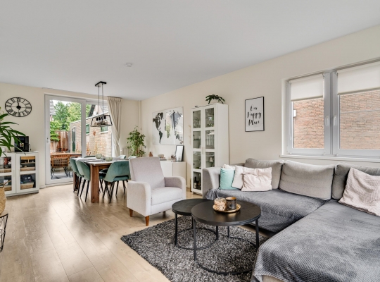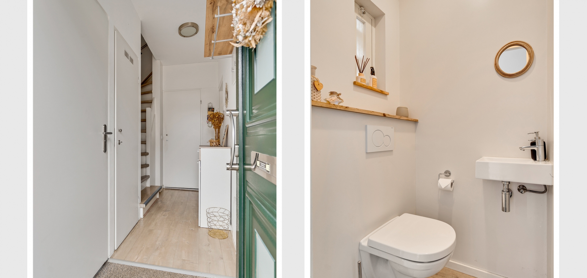 Achter de donkergroene voordeur is de ruime hal die, net als de rest van de woning, smaakvol is verbouwd. U ziet de trapopgang met een bergkast, de meterkast en de toiletruimte met fonteintje. Aan het einde van de hal loopt u rechtsaf de woonkamer (circa 7,47 x 3,82) in. Het zitgedeelte is aan de voorzijde en het eetgedeelte aan de achterzijde, bij de schuifpui naar het terras in de achtertuin.