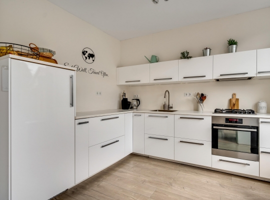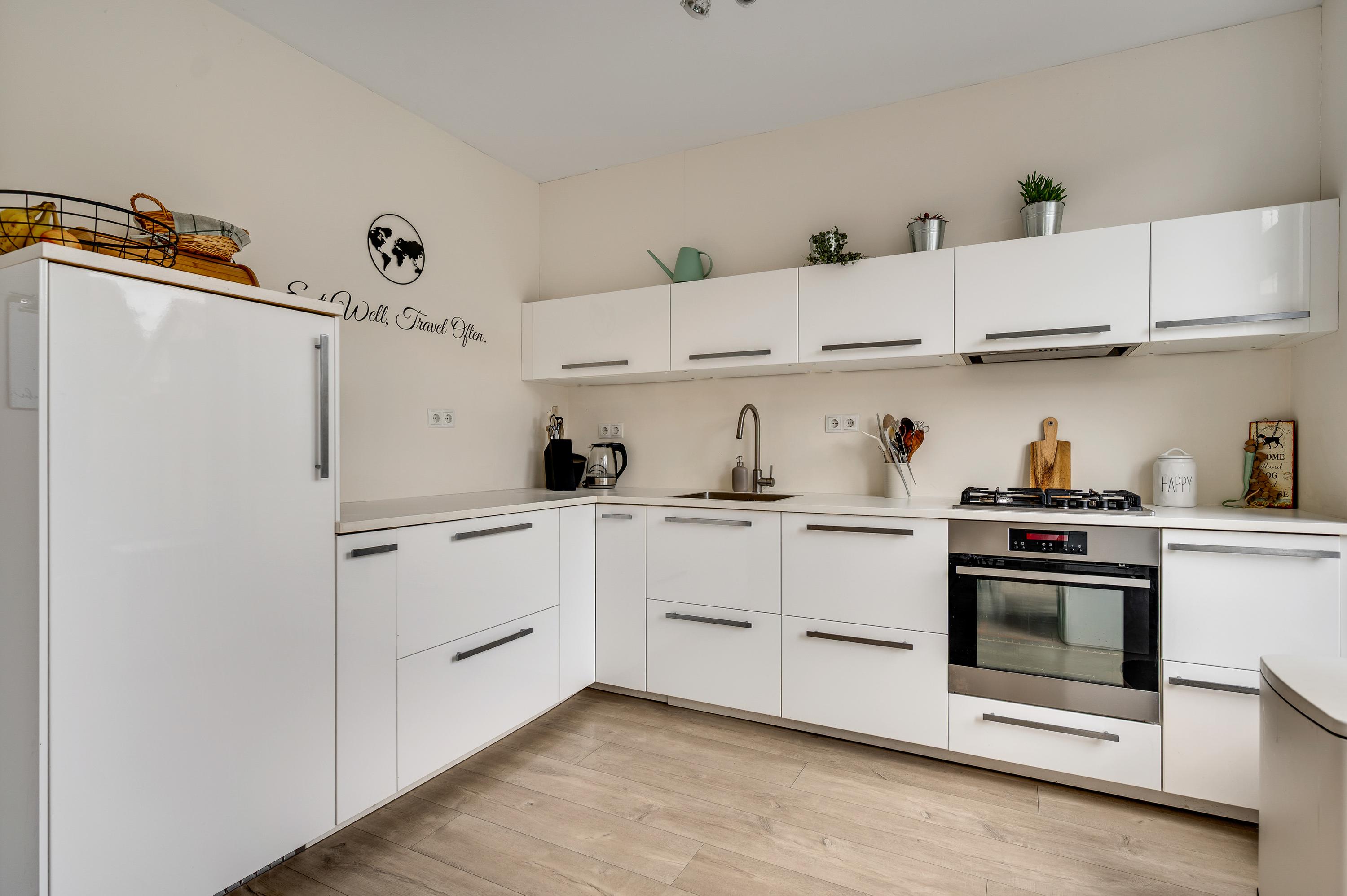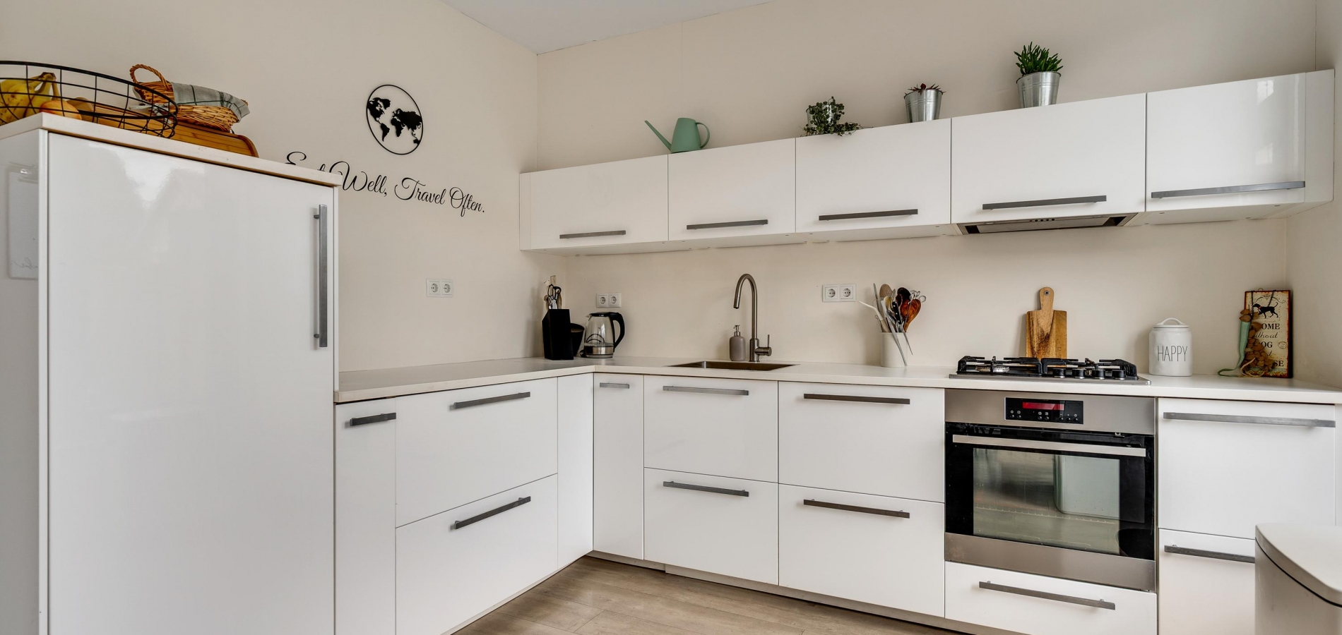 De open keuken (circa 3,14 x 2,11) is ingedeeld met een royale, lichte hoekopstelling. Vele lades en kasten bieden volop bergruimte en alle apparatuur is ingebouwd: een gaskookplaat, afzuigkap, heteluchtoven, koelkast met vriesvak en een vaatwasser.