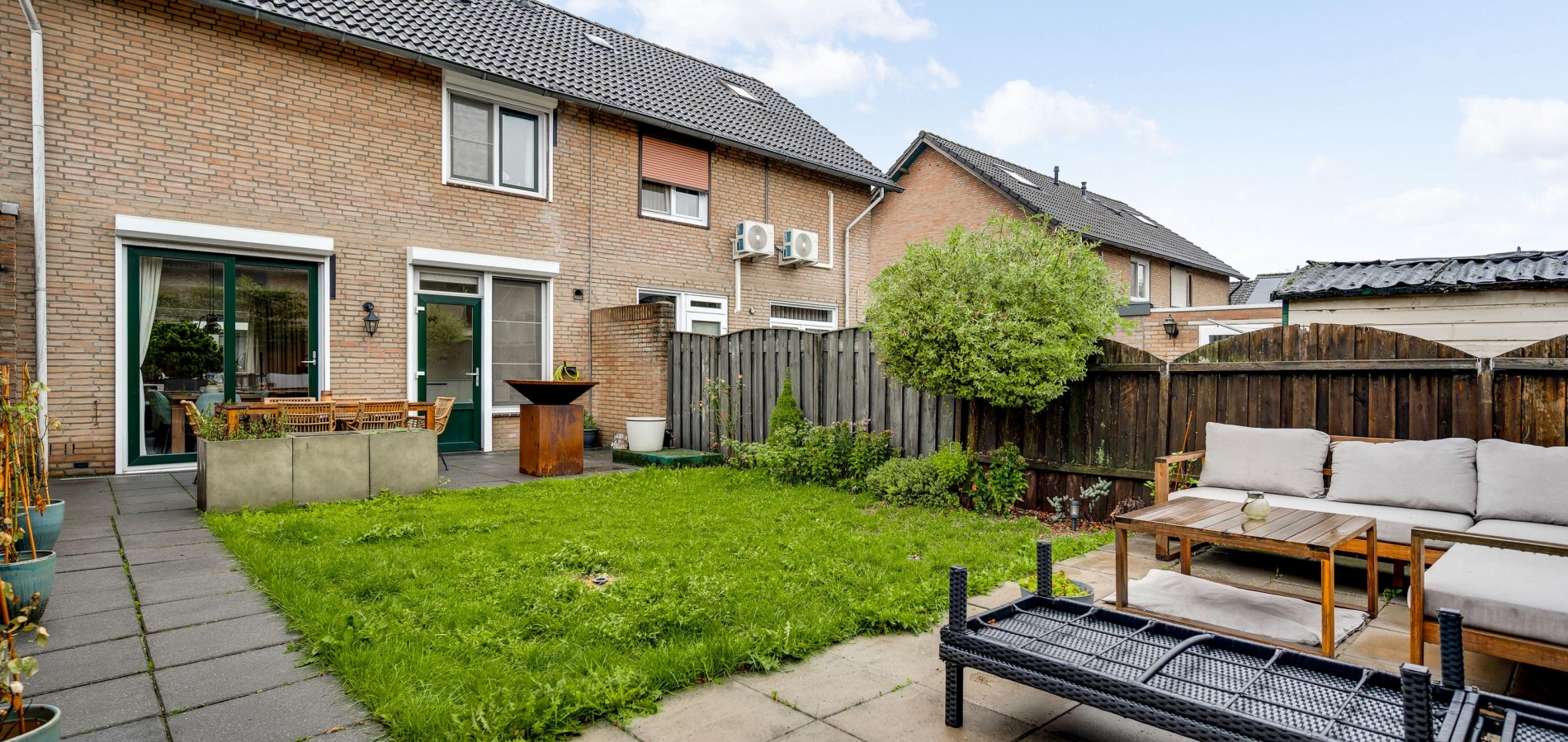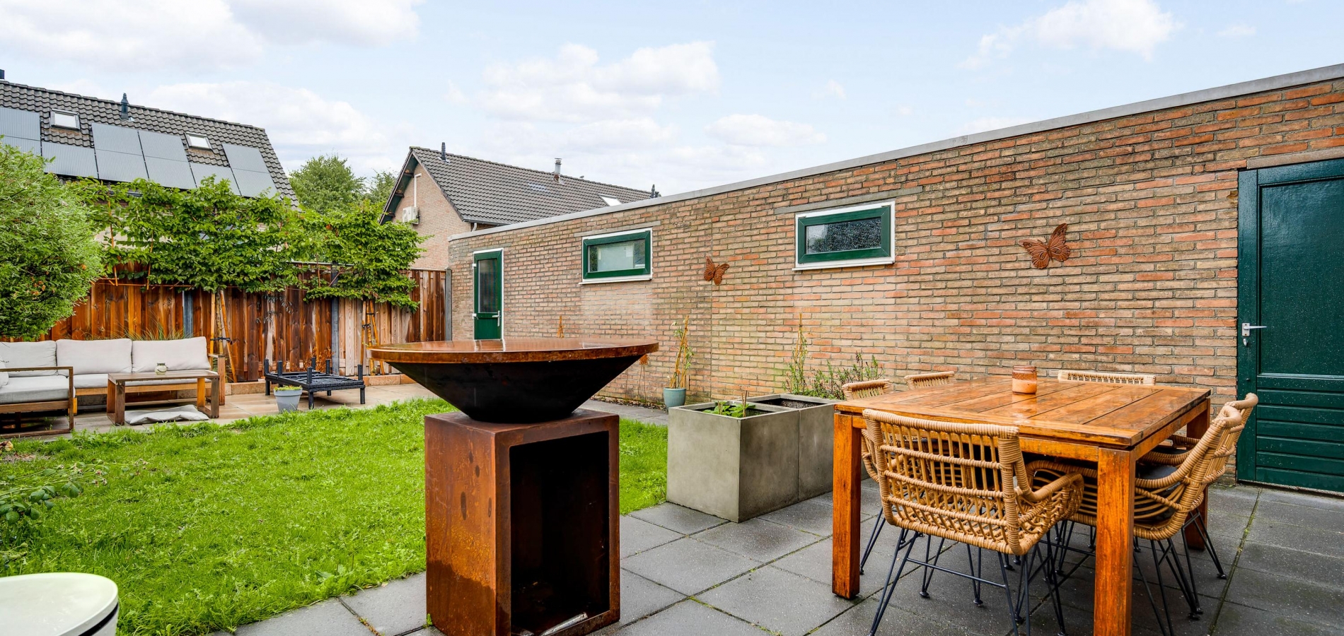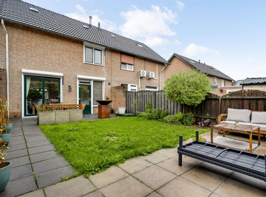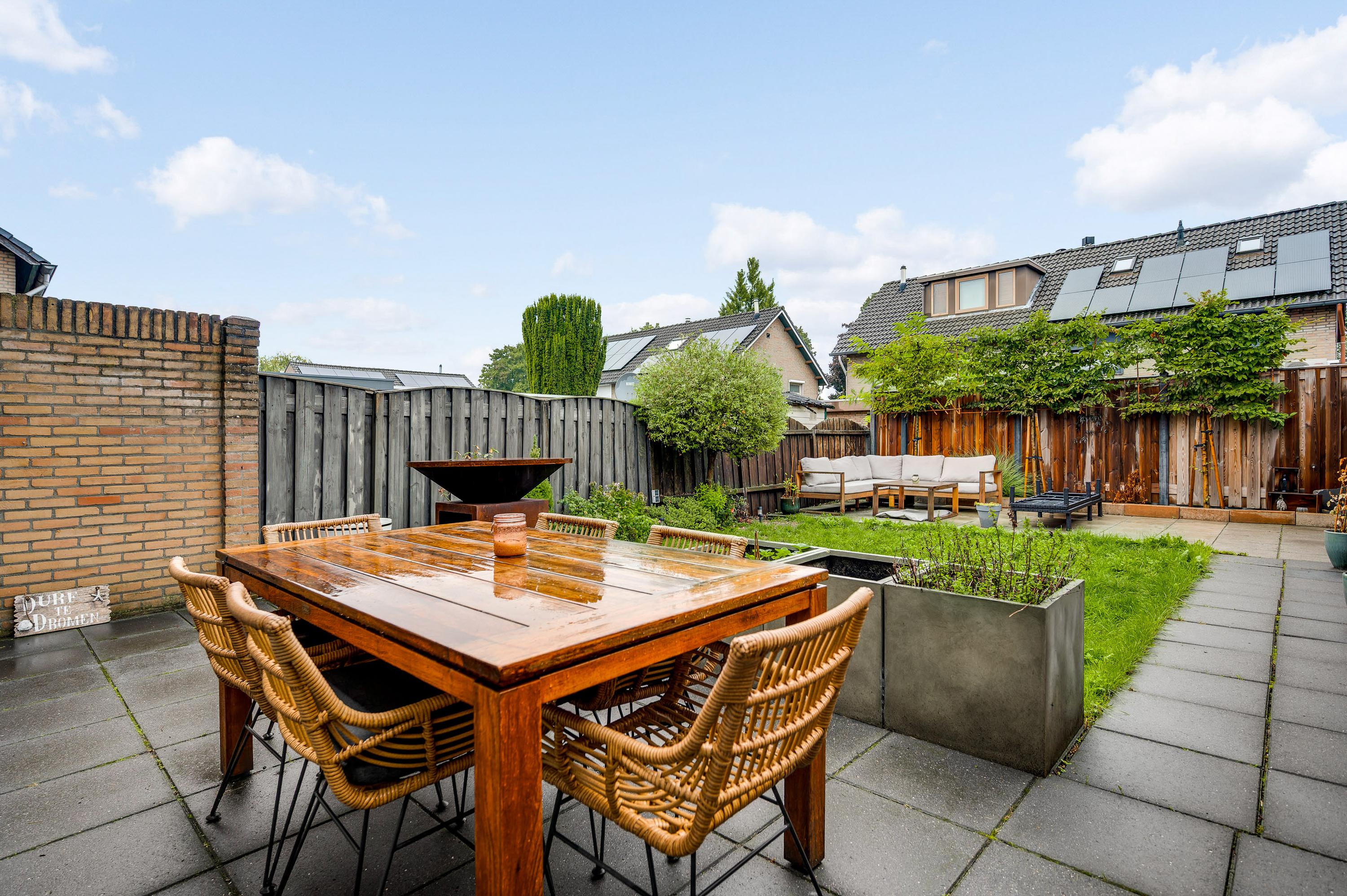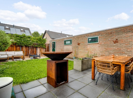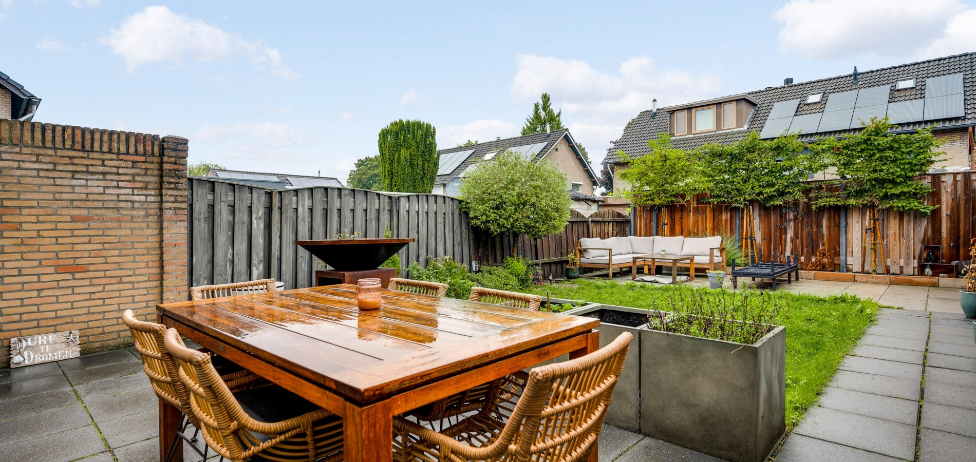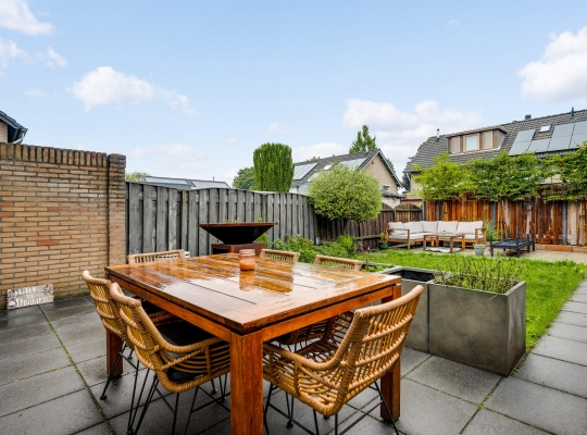 De achtertuin is ingedeeld met groen en twee terrassen, waardoor u de hele dag in de zon kunt zitten. Leibomen en een houten schutting zorgen voor privacy, en aan de kant van het woonhuis is een poort naar de oprit. Hier is ruimte voor minimaal twee auto’s. De lage boom in de voortuin zorgt ervoor dat er weinig inkijk in huis is.