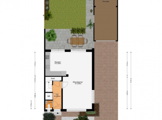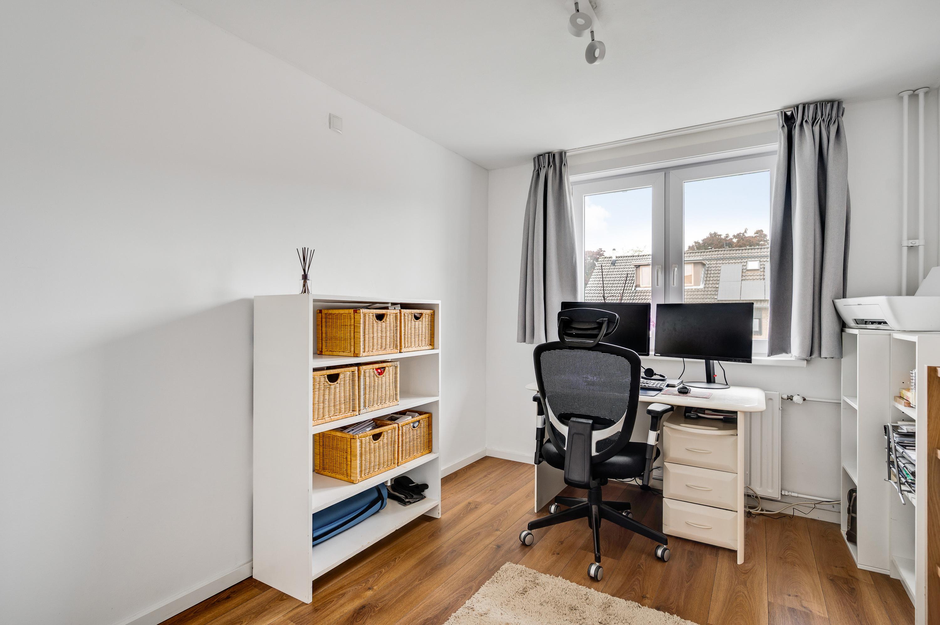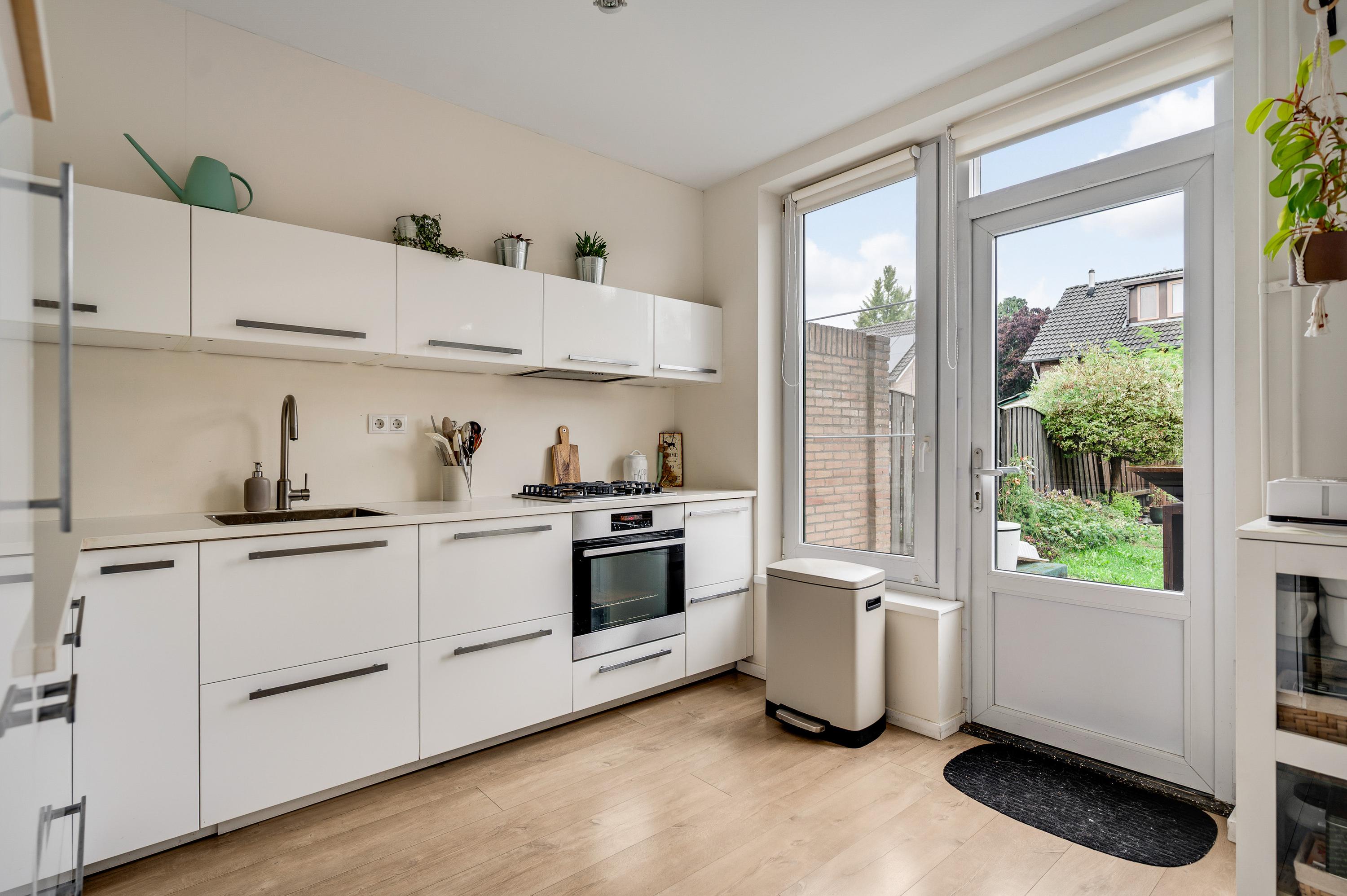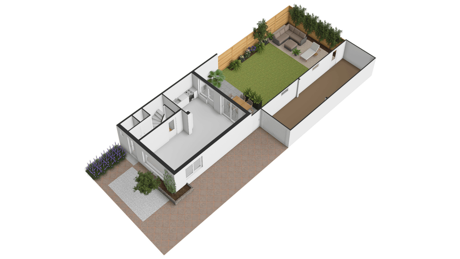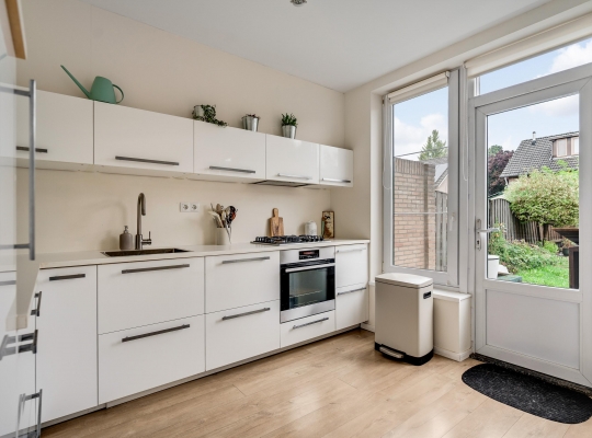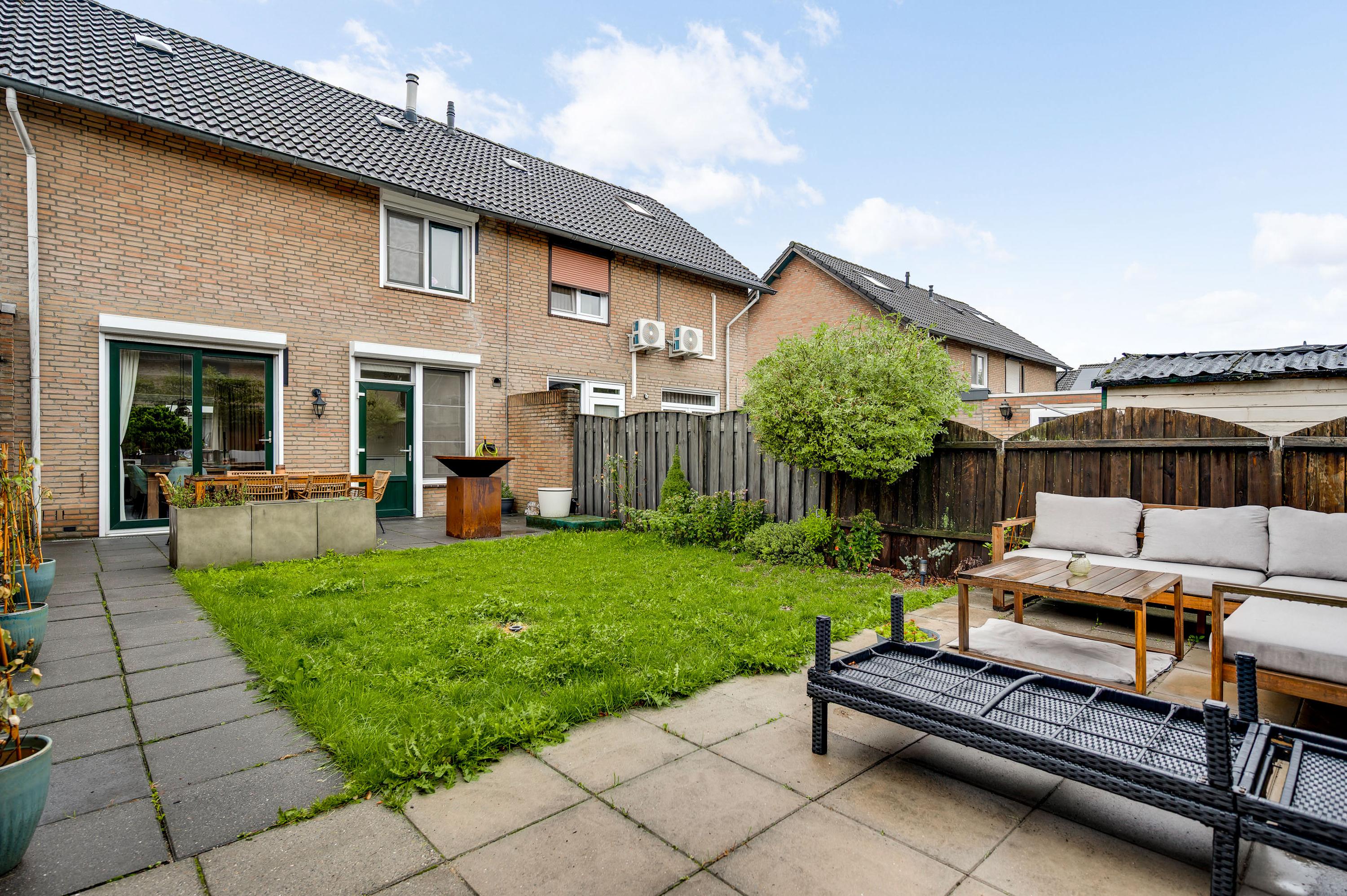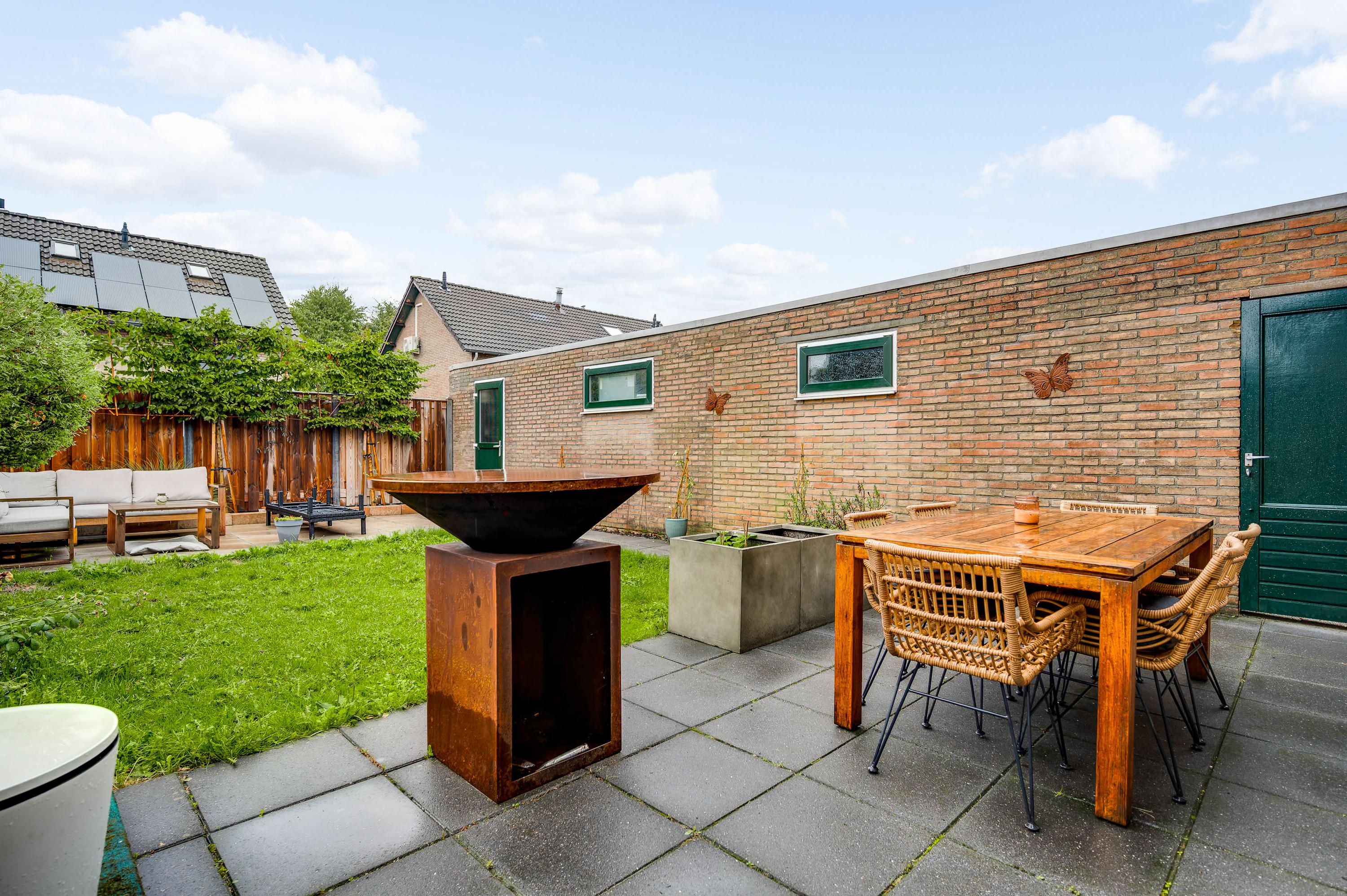 De achtertuin is ingedeeld met groen en twee terrassen, waardoor u de hele dag in de zon kunt zitten. Leibomen en een houten schutting zorgen voor privacy, en aan de kant van het woonhuis is een poort naar de oprit. Hier is ruimte voor minimaal twee auto’s. De lage boom in de voortuin zorgt ervoor dat er weinig inkijk in huis is.