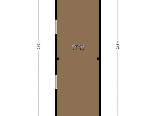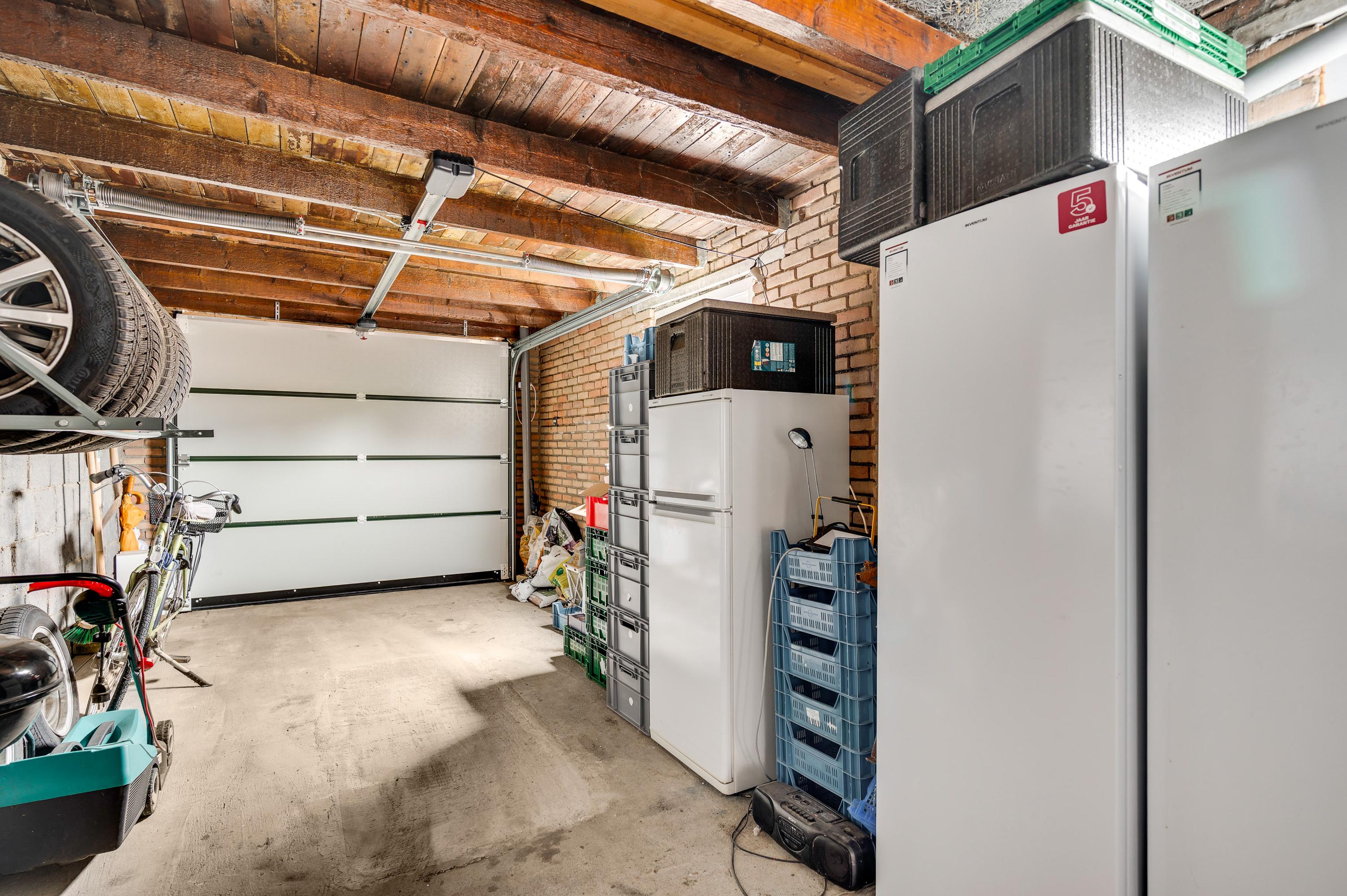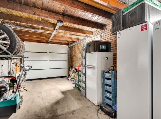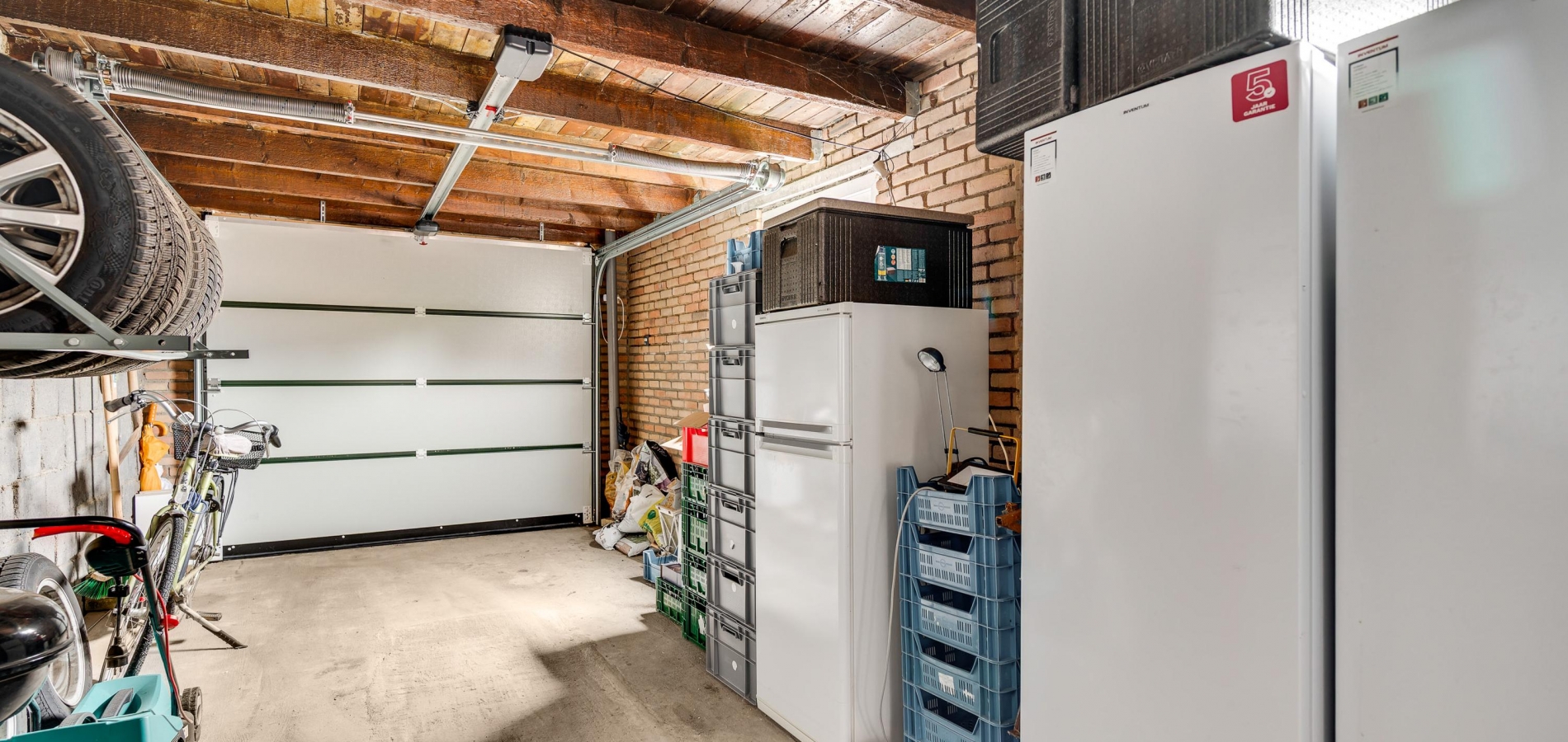 Schuin achter de woning, aan het einde van de oprit, staat een zeer ruime garage (circa 10,68 x 2,99), waarvan het voorste deel is aangebouwd in 1981. Deze ruimte, met genoeg plaats voor de auto en fietsen, heeft een elektrische garagedeur/sectionaaldeur naar de oprit en een deur naar de tuin.