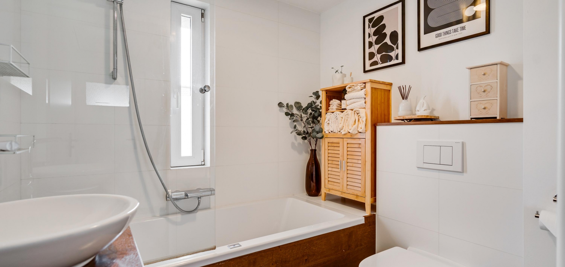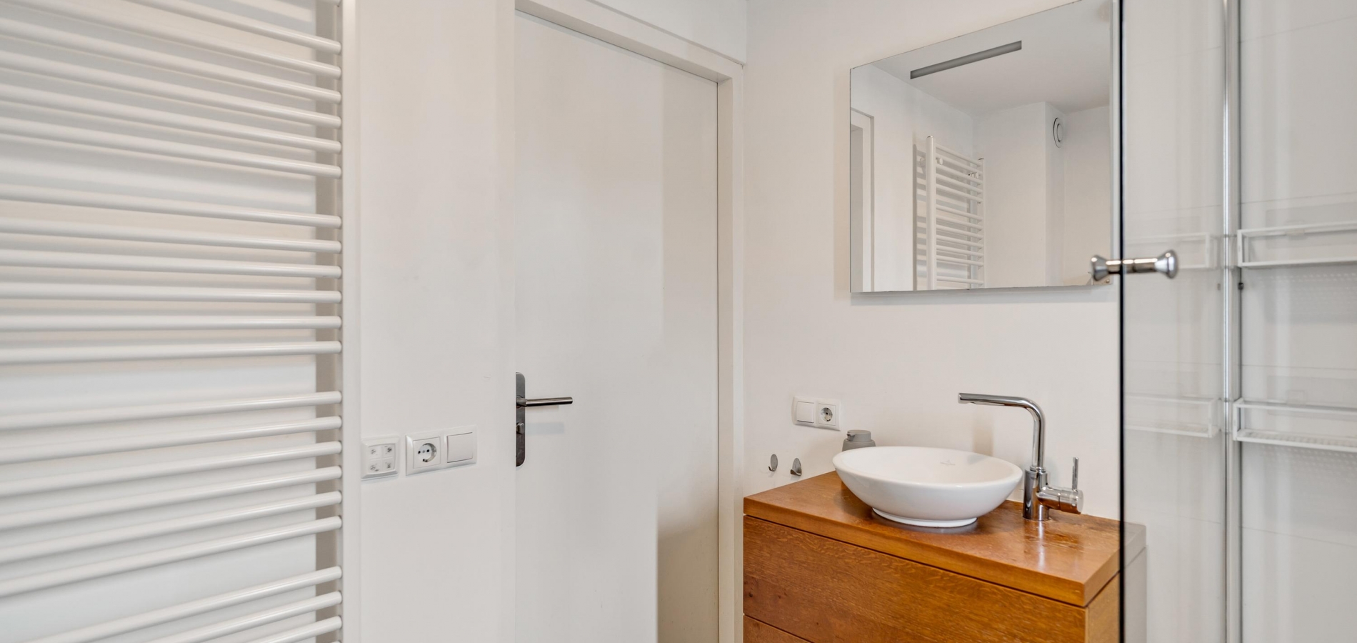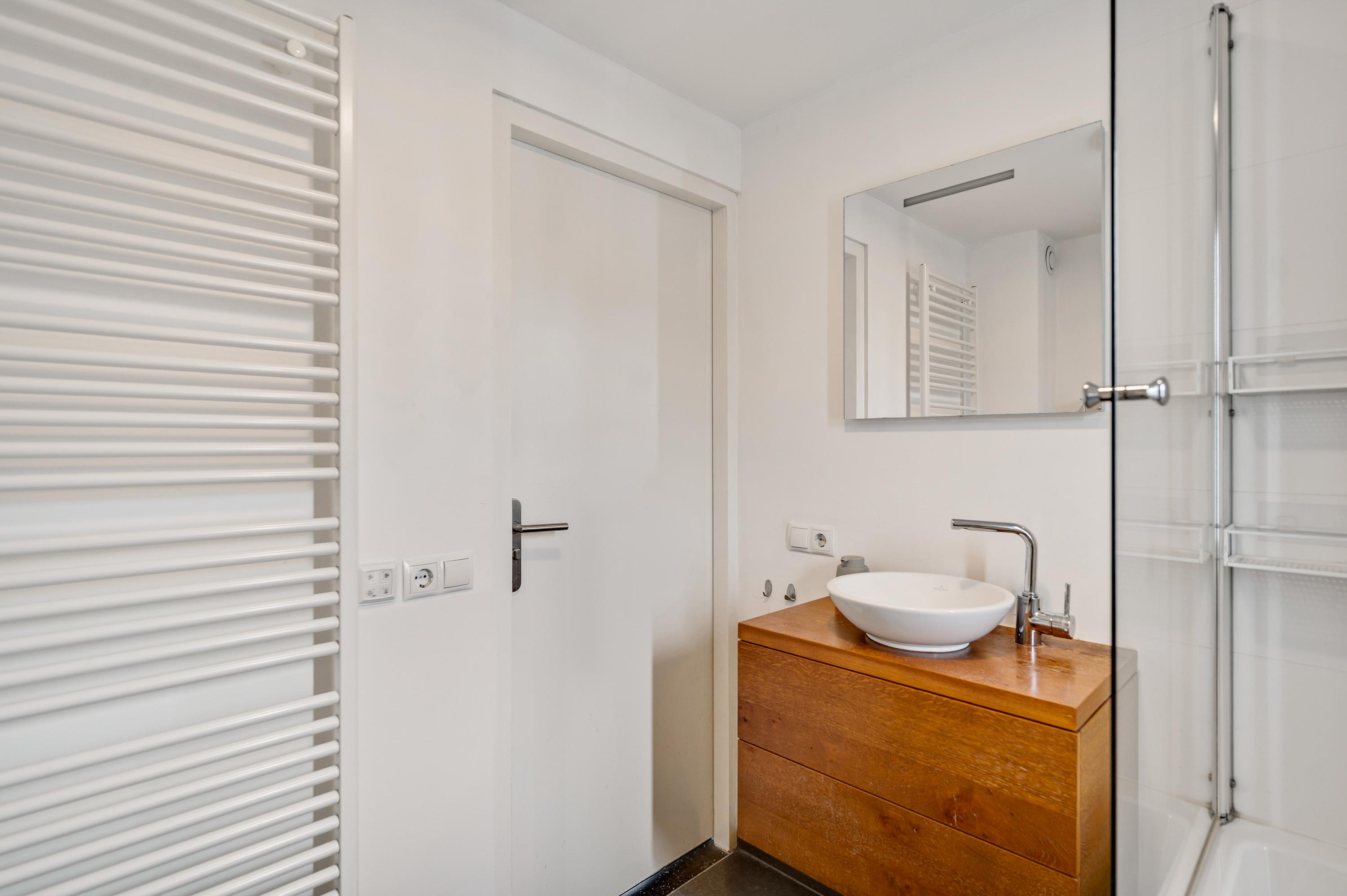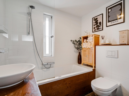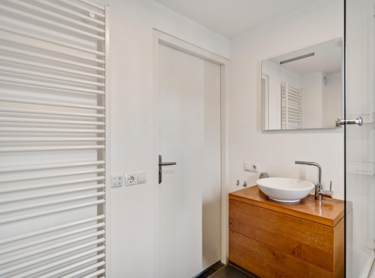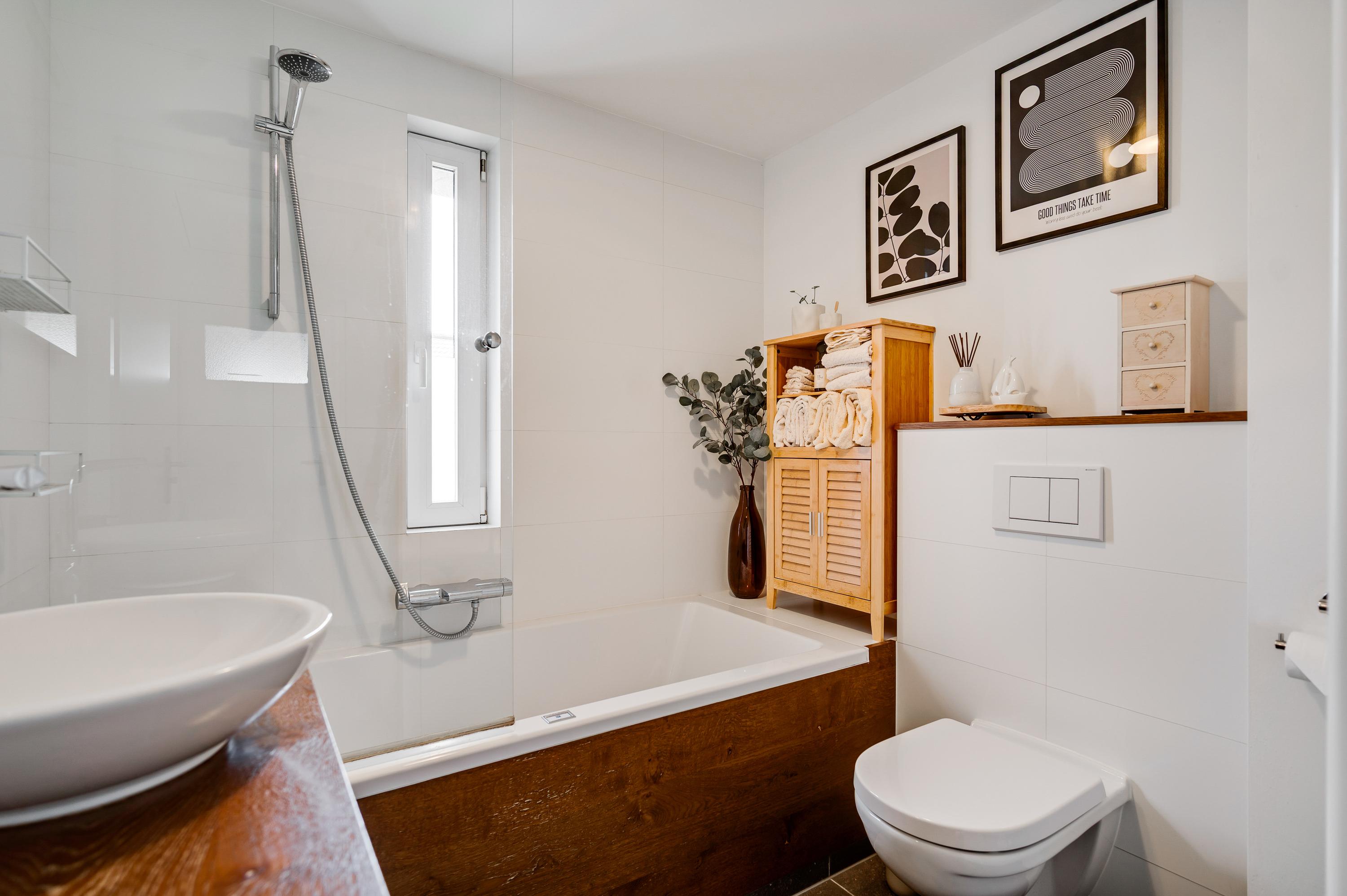 De badkamer (circa 2,11 x 1,93) is ingedeeld met een ligbad/douche, een houten meubel met wastafel en een wandcloset. Het raam boven het bad zorgt voor veel lichtinval en de vloer is geheel betegeld, net als de muren bij het bad- en douchegedeelte en de wc. De overige muren zijn gestuct.