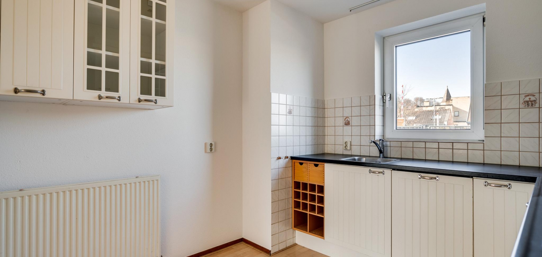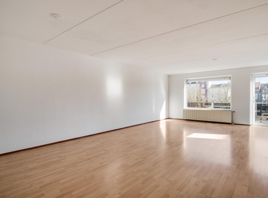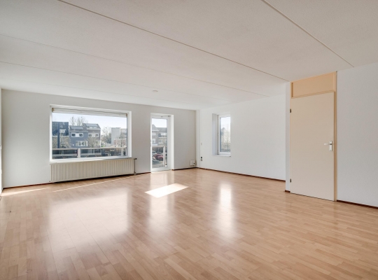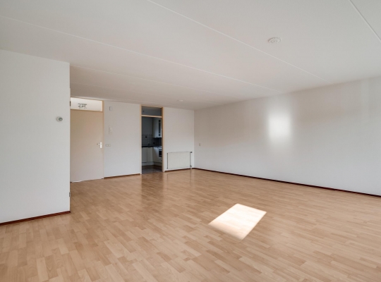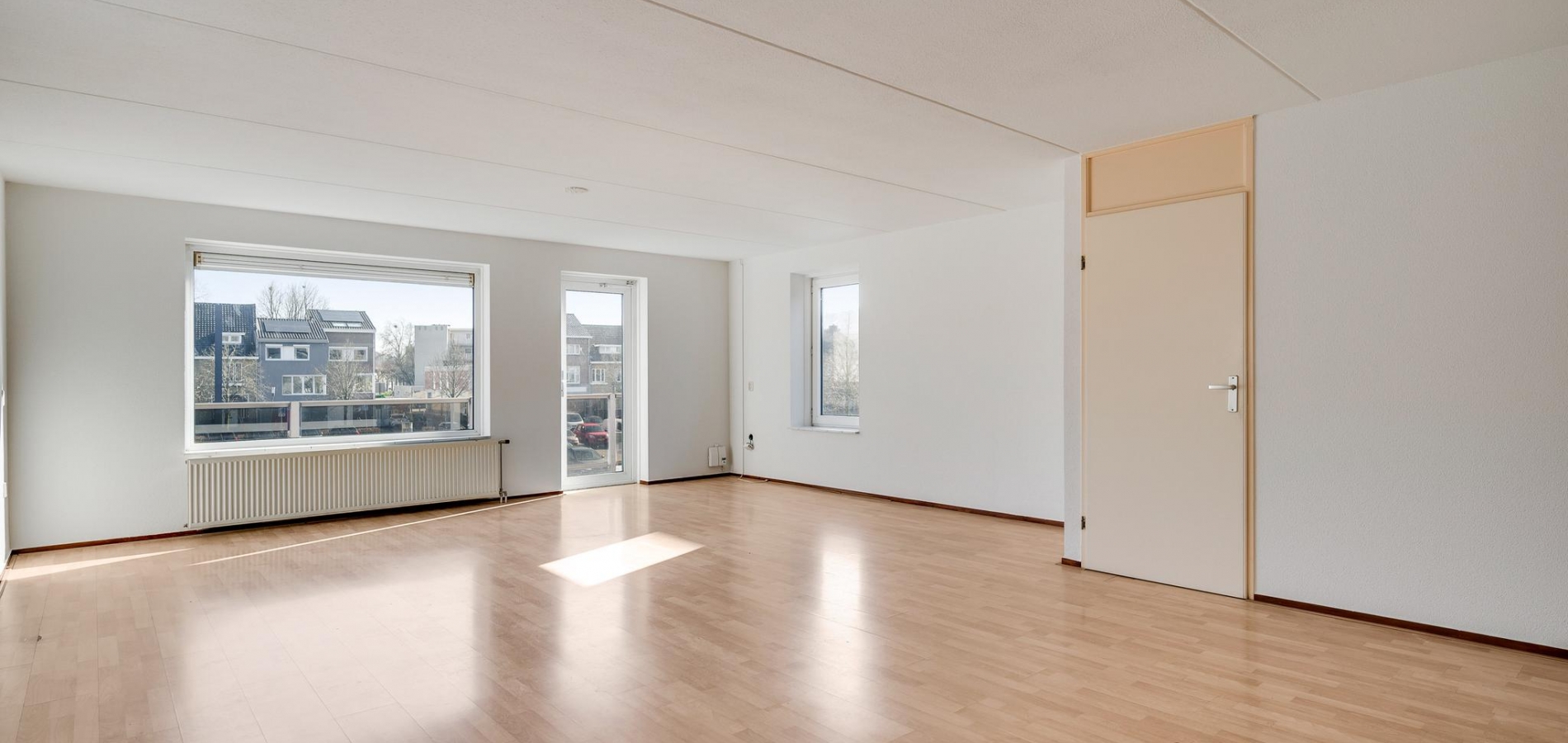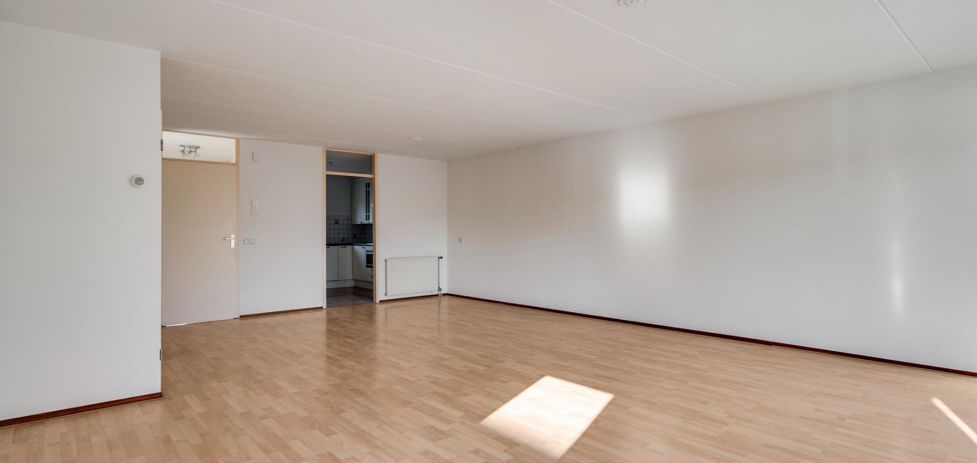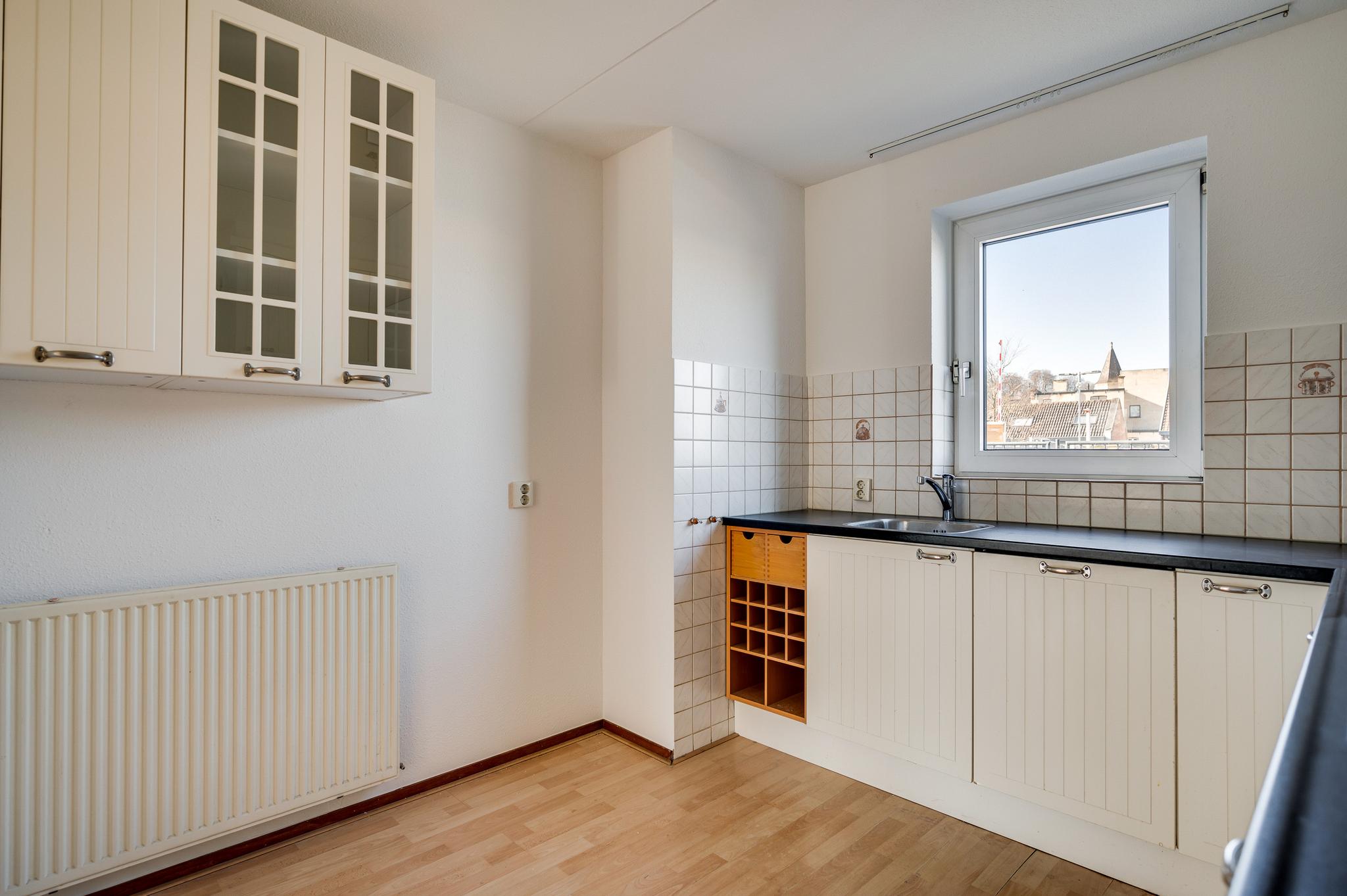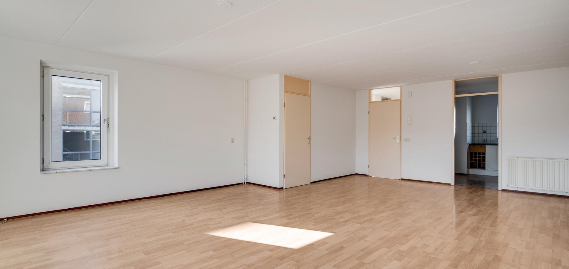 Niet alleen in de hal, maar ook in de woonkamer en keuken ligt laminaat op de vloer. De woonkamer heeft een oppervlakte van circa 42 m2, met lichtinval vanaf de oost- en zuidkant. Onder de trap is een handige bergkast en het aangrenzende balkon (circa 6,04 x 1,41) biedt prachtig uitzicht naar het Walramplein en zelfs de Wilhelminatoren.