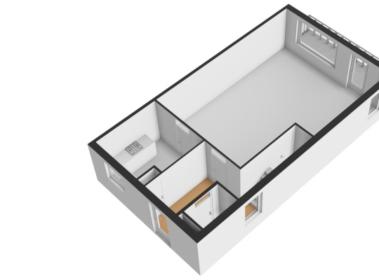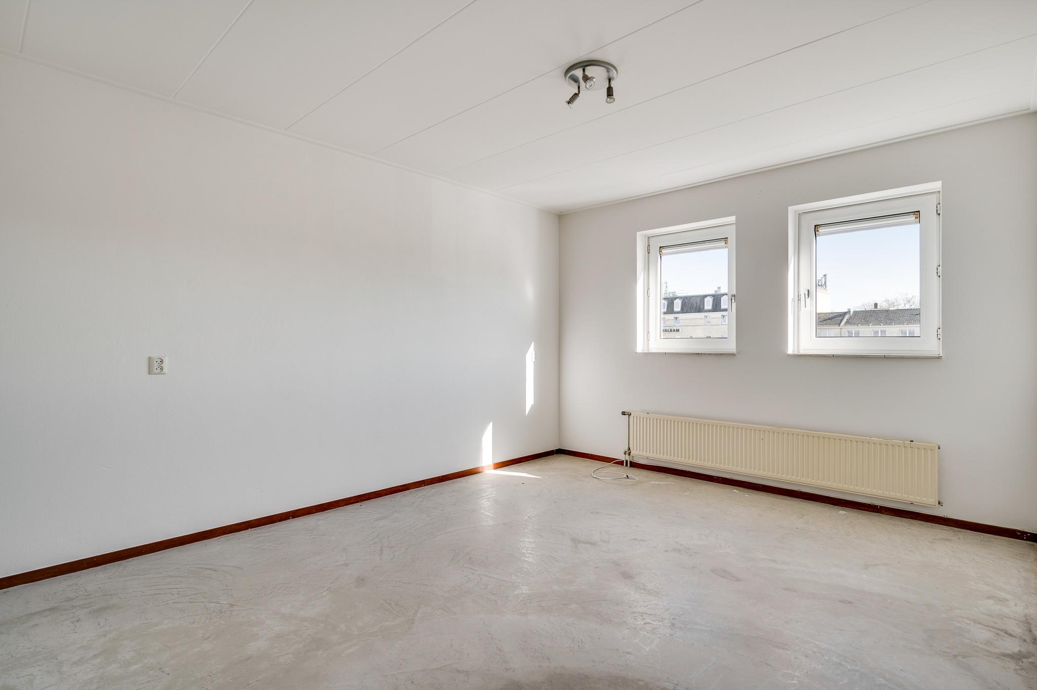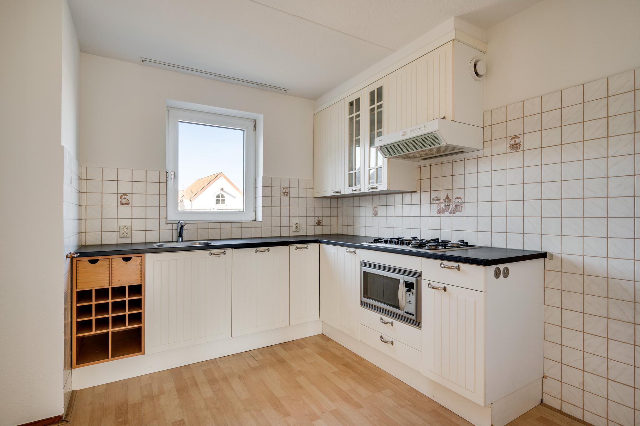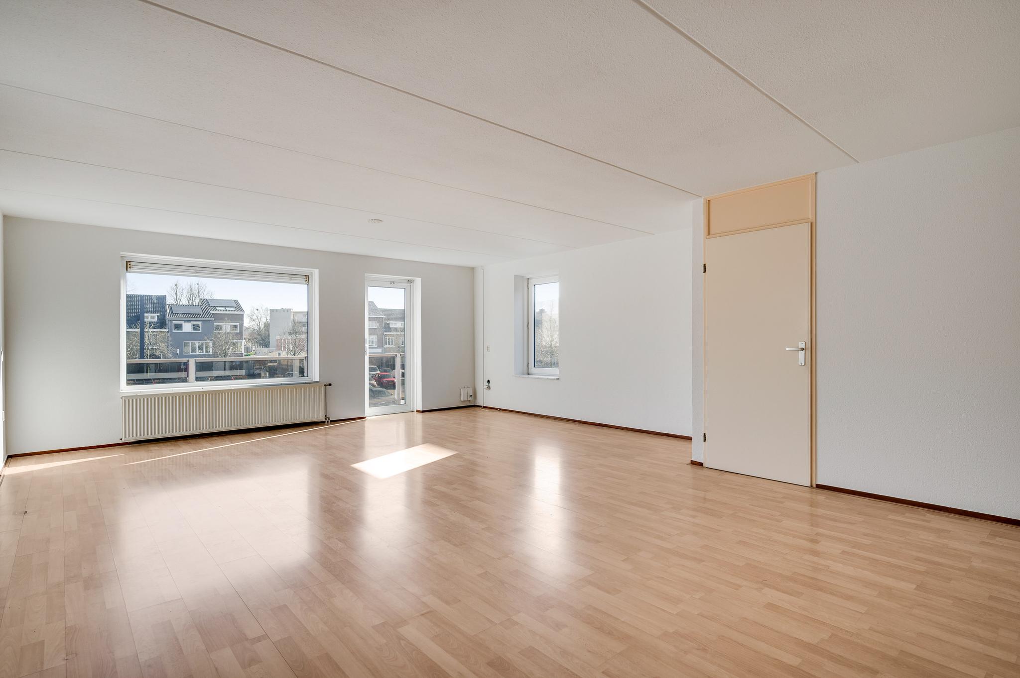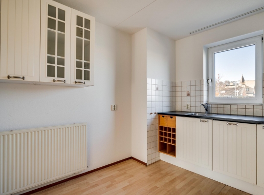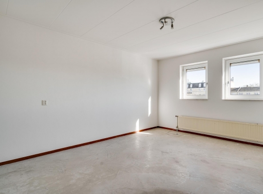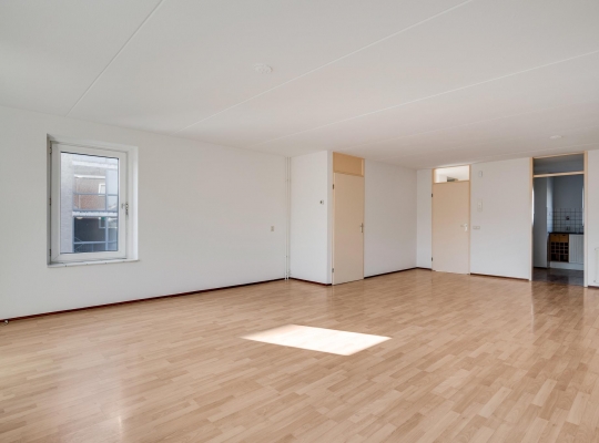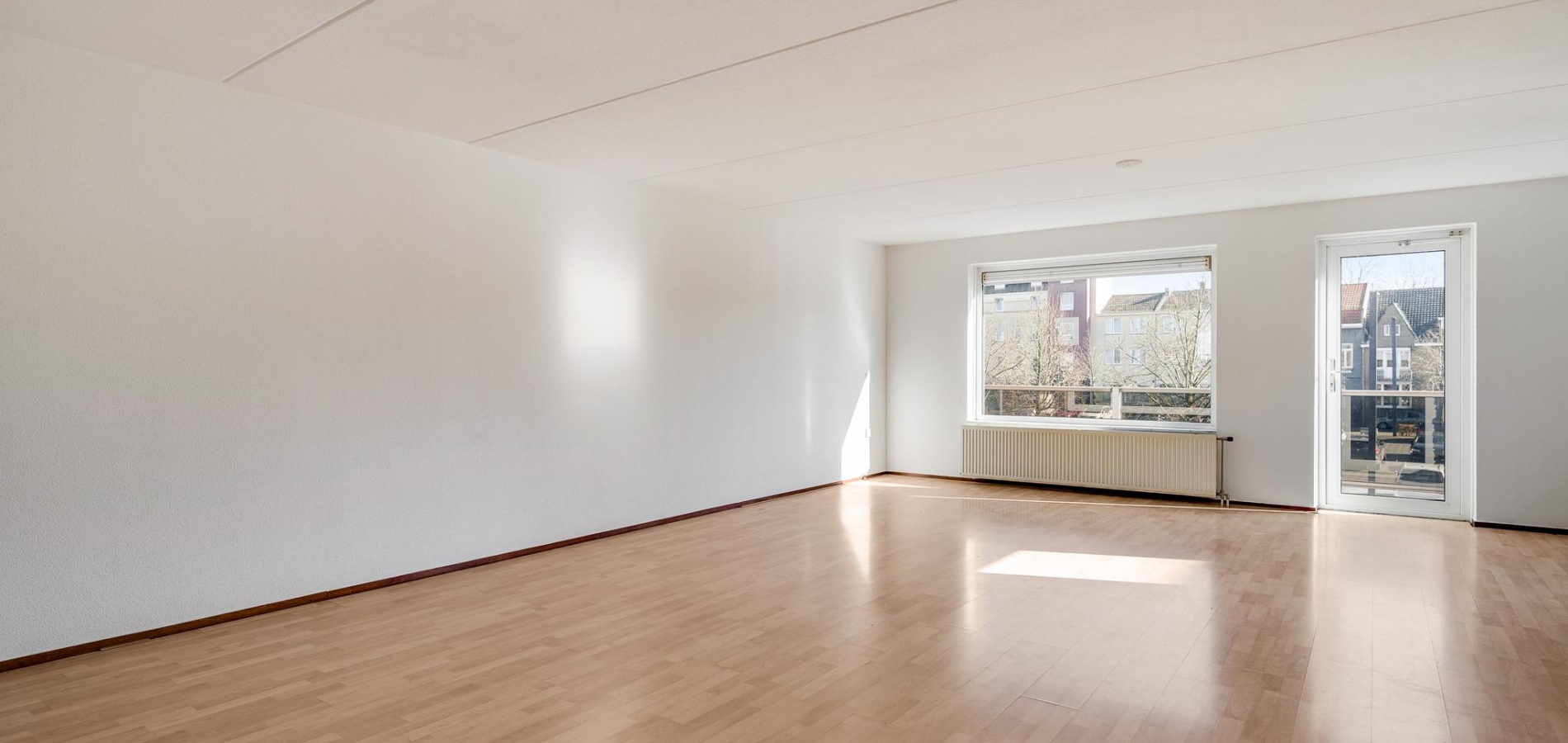 Niet alleen in de hal, maar ook in de woonkamer en keuken ligt laminaat op de vloer. De woonkamer heeft een oppervlakte van circa 42 m2, met lichtinval vanaf de oost- en zuidkant. Onder de trap is een handige bergkast en het aangrenzende balkon (circa 6,04 x 1,41) biedt prachtig uitzicht naar het Walramplein en zelfs de Wilhelminatoren.