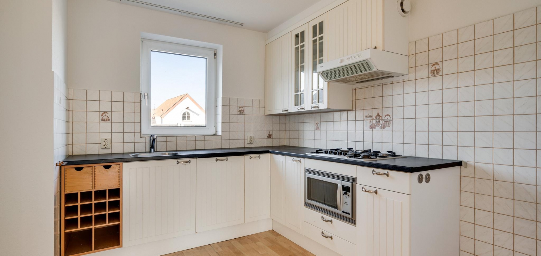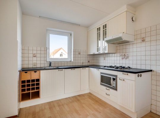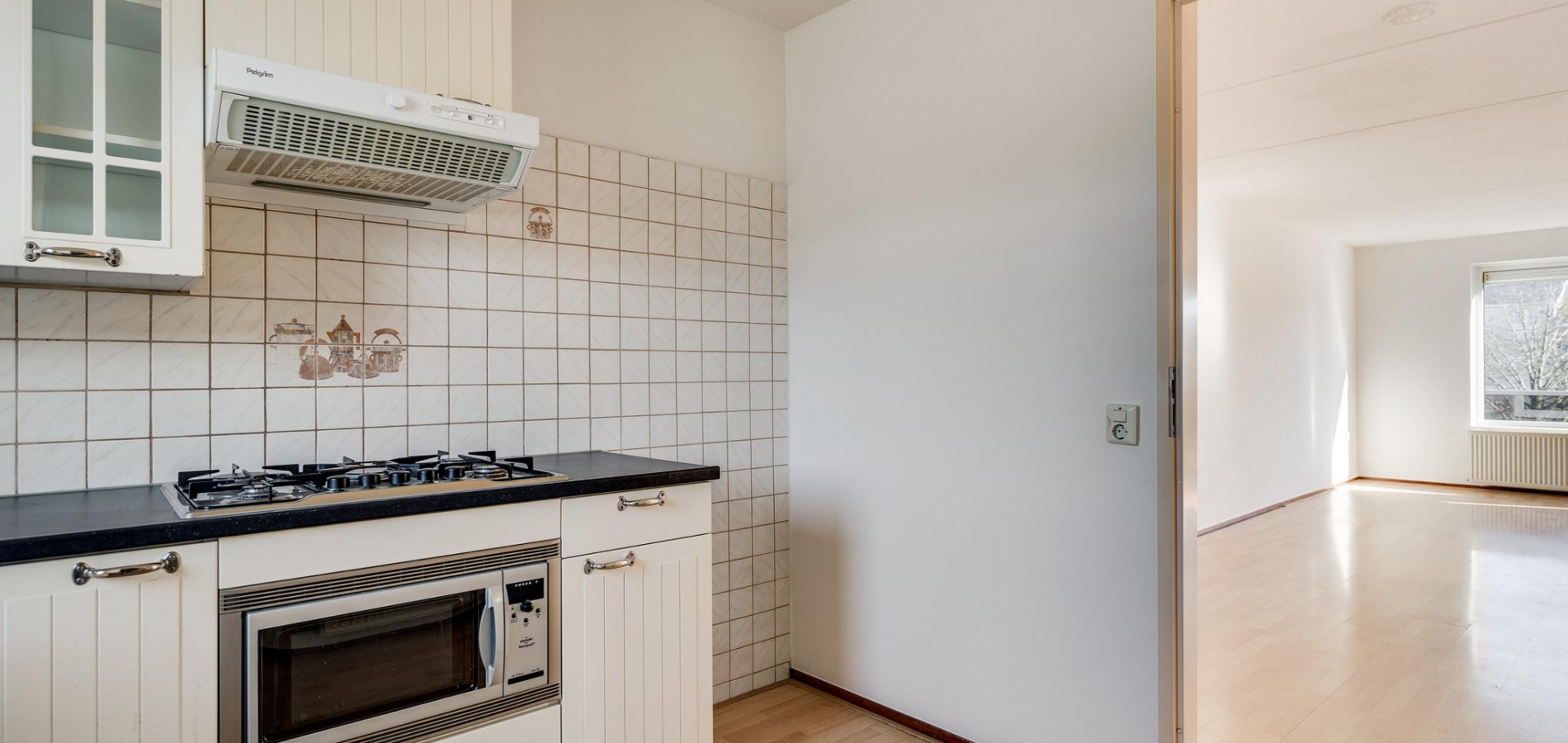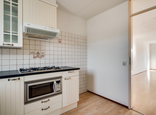 In de dichte keuken (circa 2,86/2,43 x 2,98) staat een lichte hoekopstelling met een ingebouwde gaskookplaat, afzuigkap, vaatwasser en een magnetron. Boven de radiator hangen hoge kasten, perfect voor servies en andere spullen.