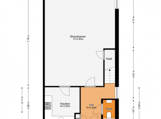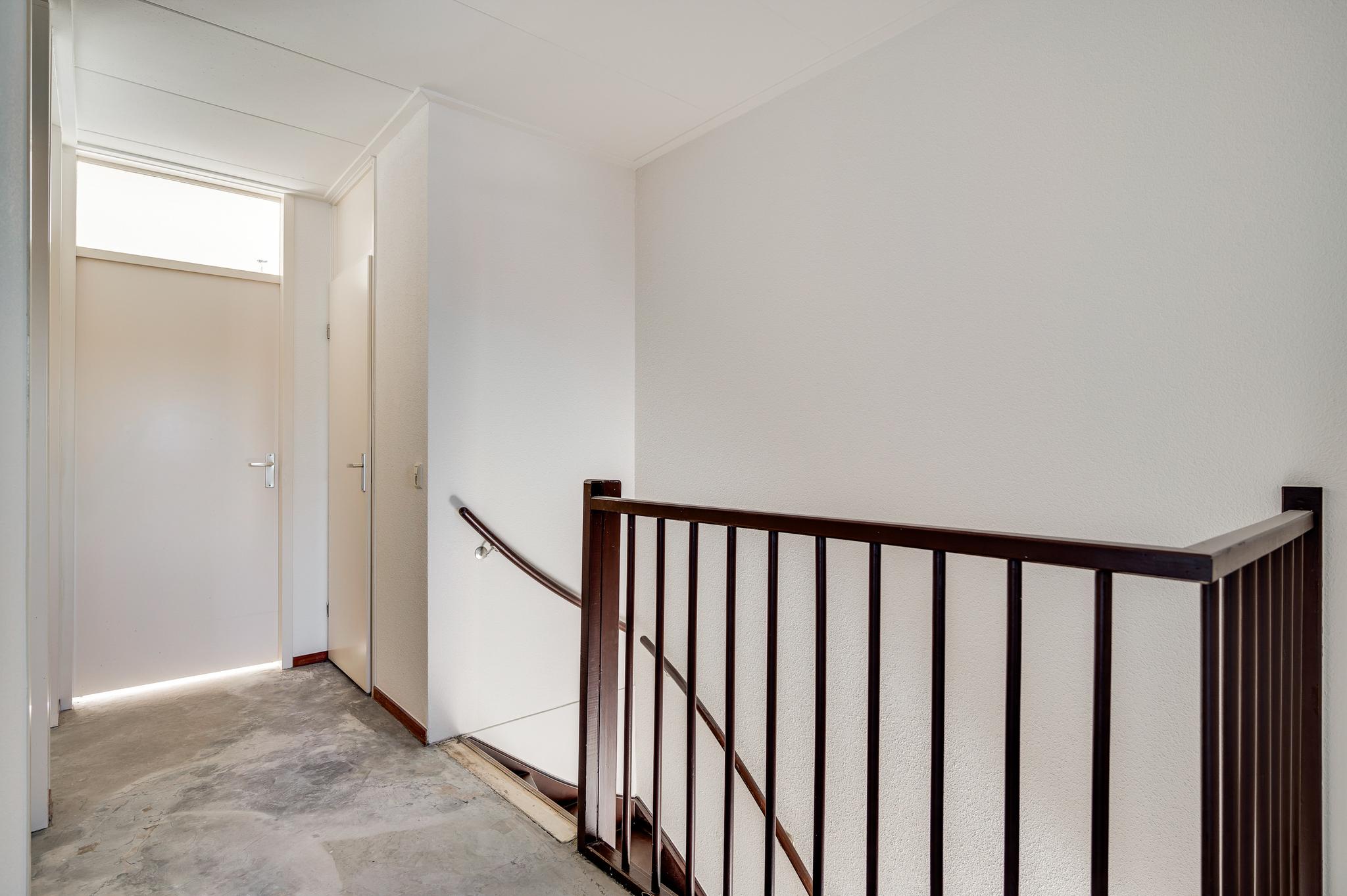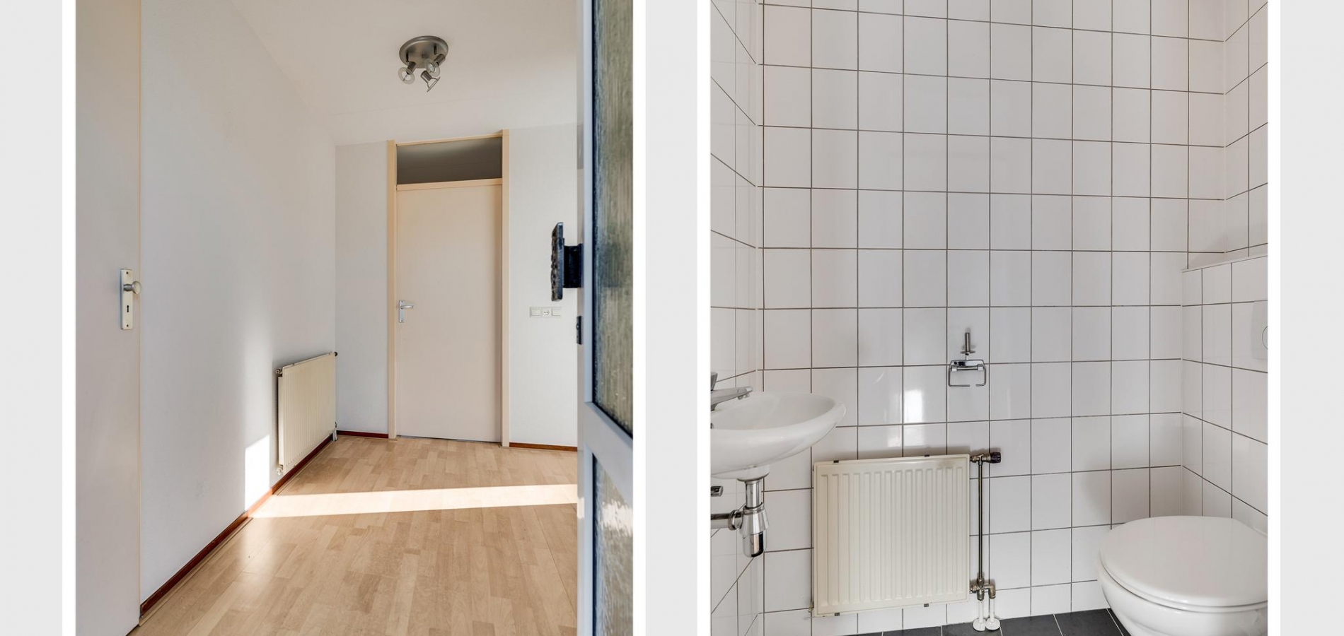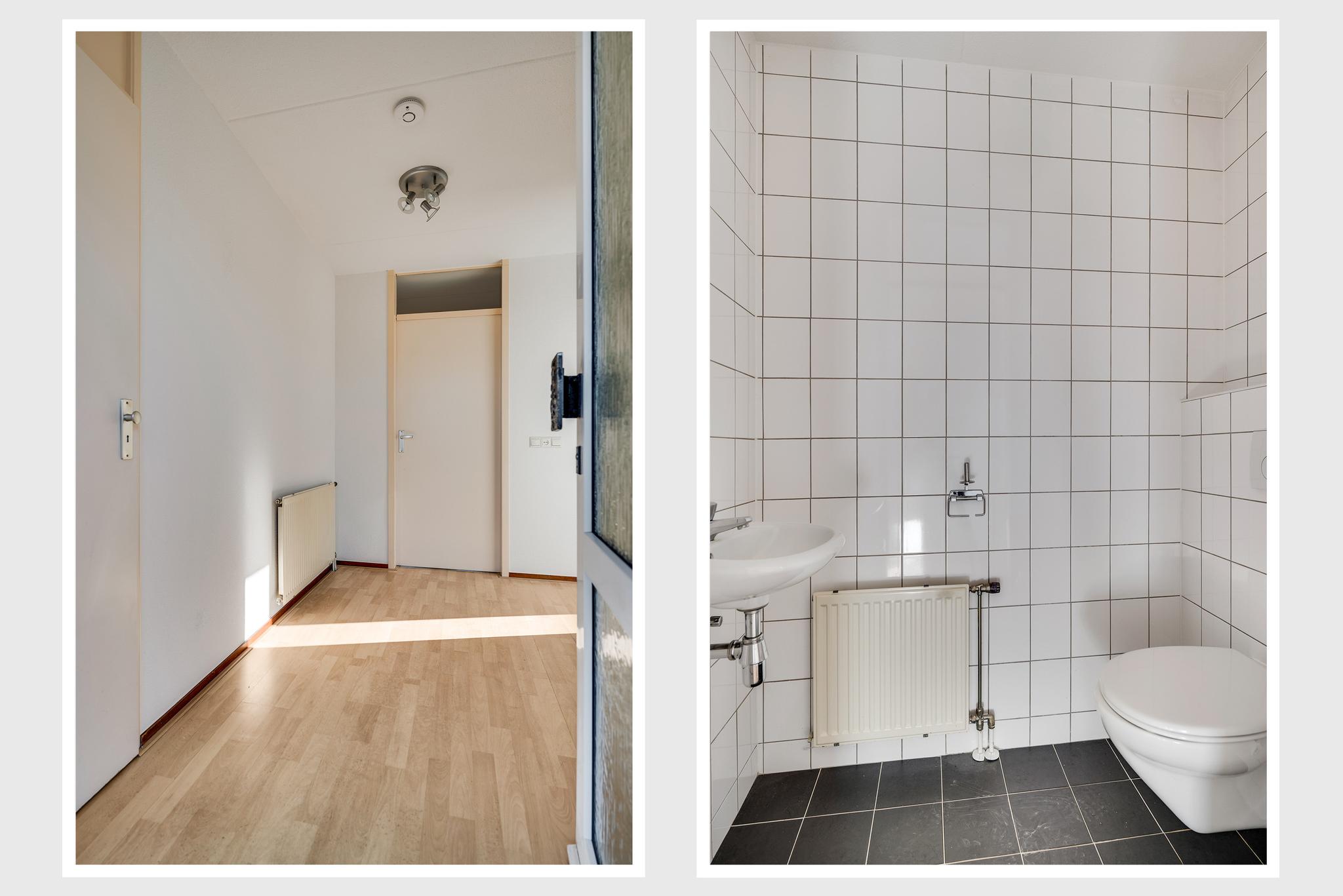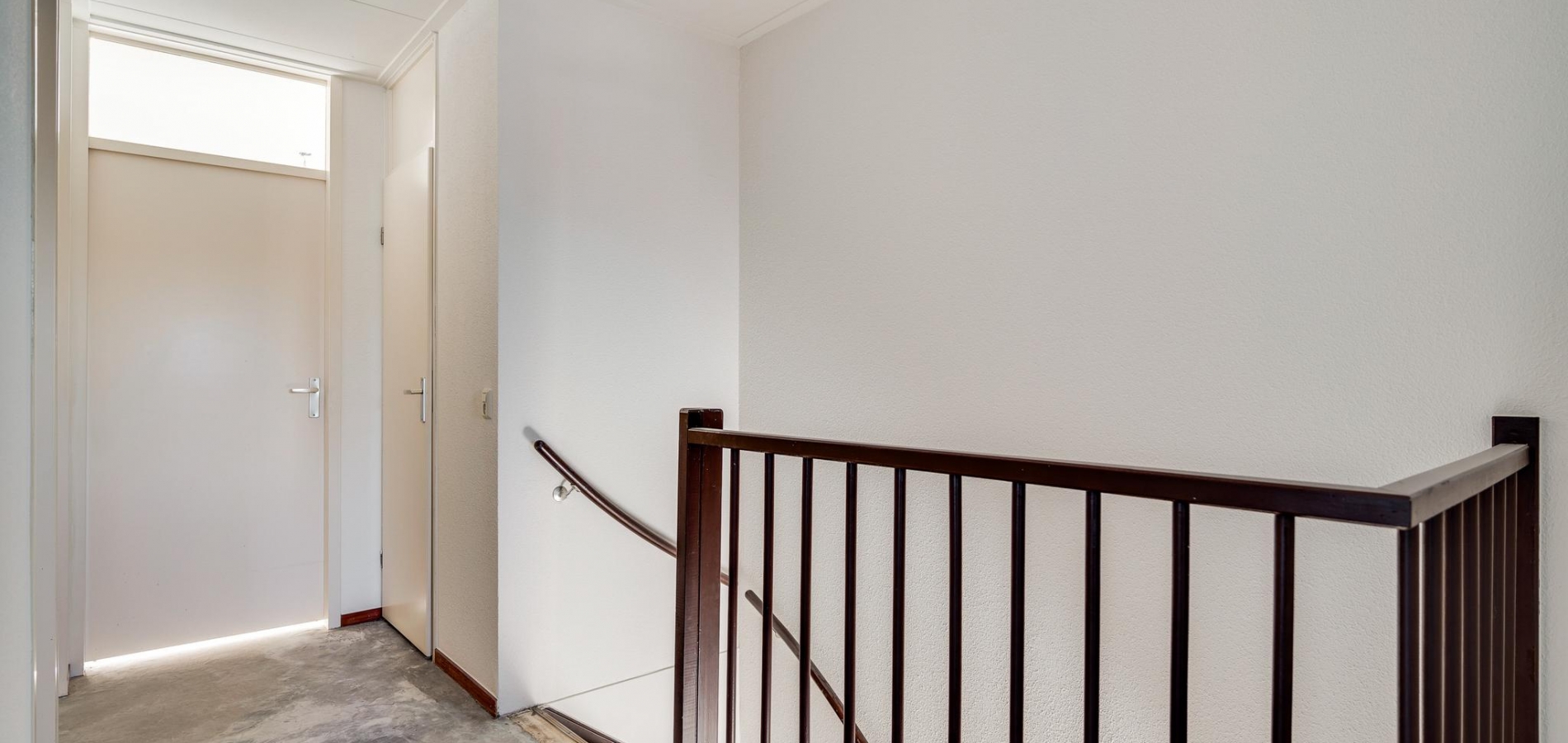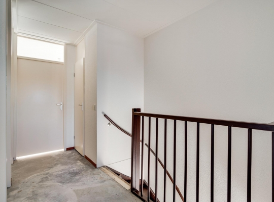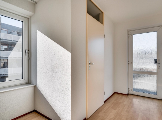 Via de galerij, die grenst aan het parkeerdek, loopt u naar de entree van deze maisonnette. De hal is, dankzij het zijraam en de ramen in de voordeur, een lichte ruimte. Aan de rechterzijde is de toiletruimte met fonteintje en aan de andere zijde is de meterkast.