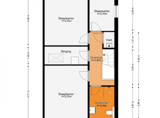 Via de trap in de hal is de tweede verdieping te bereiken, waar maar liefst drie slaapkamers en de badkamer zijn. Slaapkamer I is circa 4,71 x 3,56 meter en hiermee de grootste van de drie. Aan de kant van het Walramplein zijn slaapkamer II (circa 4,48 x 3,57) en slaapkamer III (circa 3,29 x 2,09).