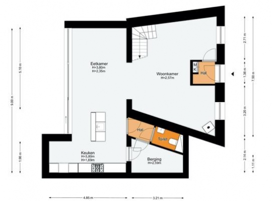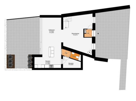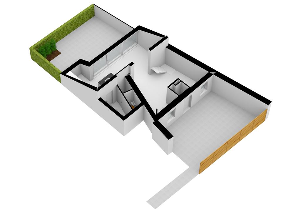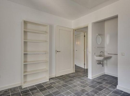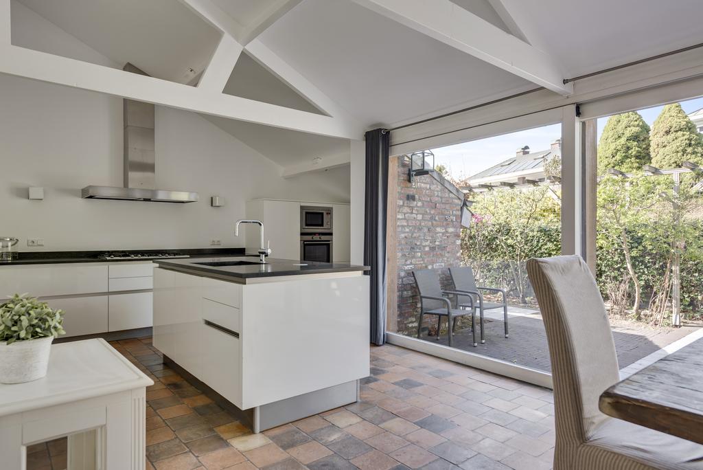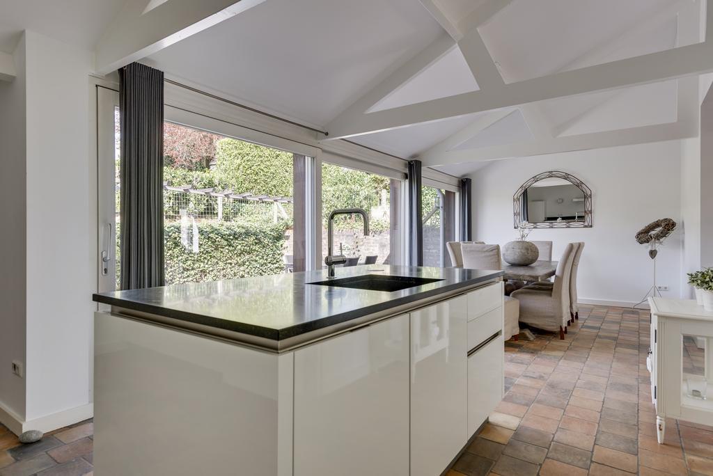 Voortuin (4,7 meter diep, 6,7 meter breed), entree alwaar meterkast. De leefruimte bestaat uit de woonkamer (circa 33 m2) met open trap naar de verdieping en moderne sfeervolle keuken (circa 30 m2), voorzien van kookeiland met spoelbak, natuurstenen aanrechtblad, vaatwasser, 5-pits gas-kookplaat, afzuigkap, koelkast, oven en magnetron. Bijkeuken/berging (circa 6 m2) alwaar aansluiting wasmachine en droger, toiletruimte met wandcloset en fonteintje. Vanuit de keuken heeft u toegang middels de grote schuifpui naar de tuin (circa 4,7 diep en 6,7 breed) De hele benedenverdieping is voorzien van een hardstenen vloer.