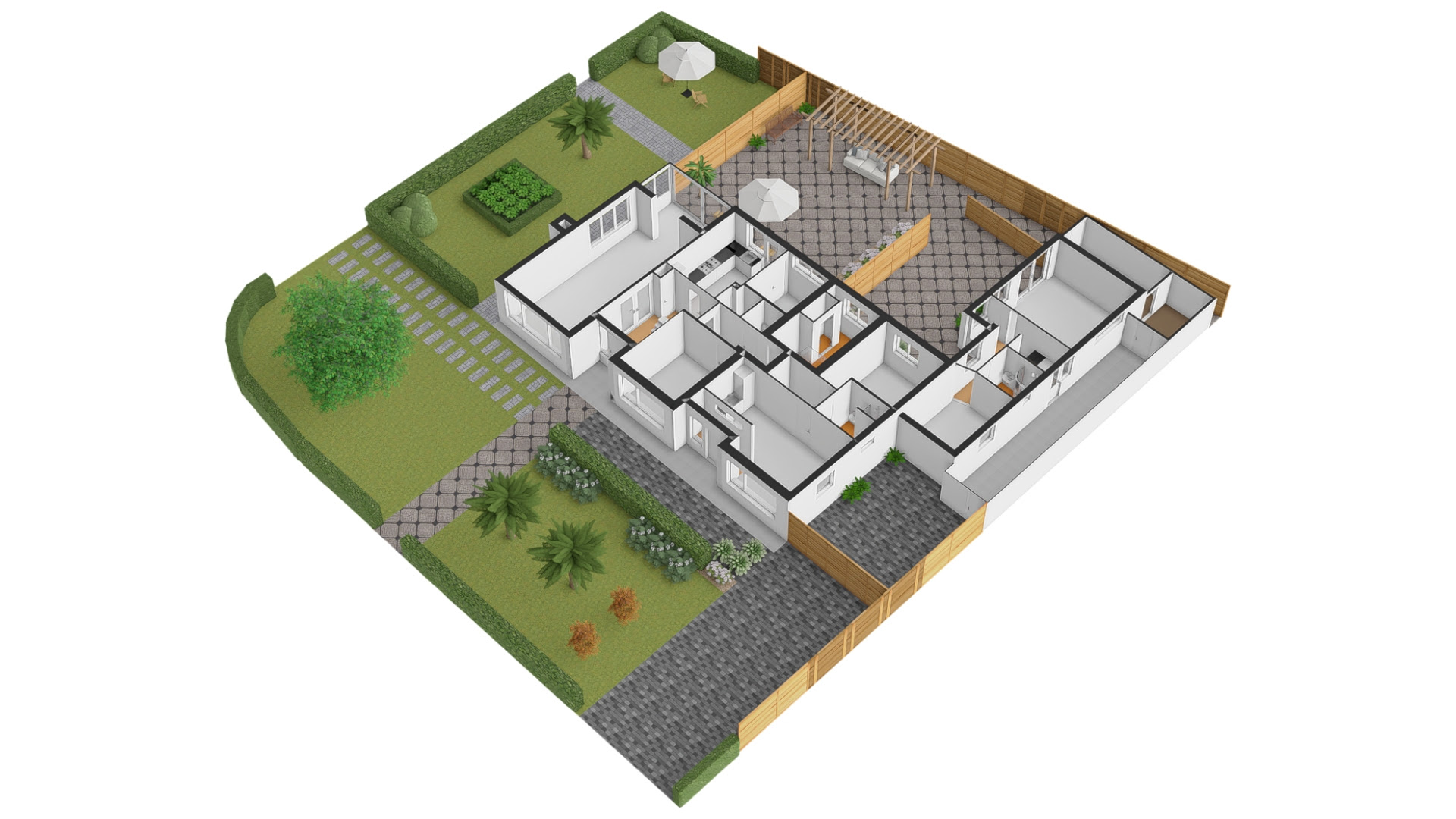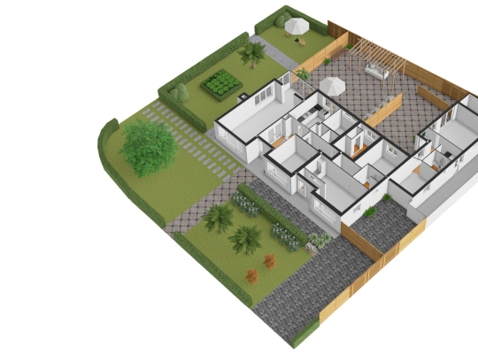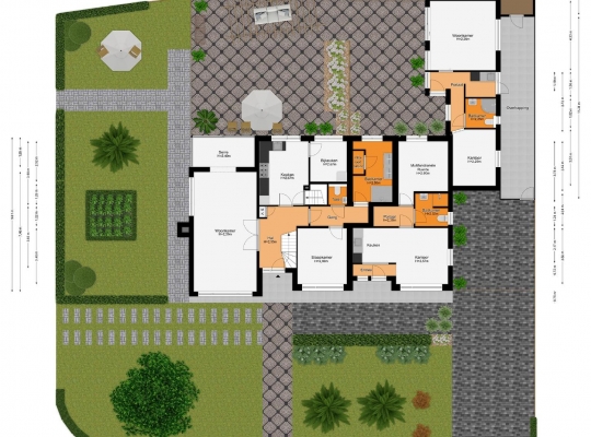 Rondom de villa ligt een fraai aangelegde, onderhoudsvriendelijke tuin met diverse hagen en een prachtige boom. Diverse terrassen, zowel bij de woning als de gastenverblijven, bieden de mogelijkheid om van de zon te genieten. In de tuin staat een houten overkapping, die als terras of BBQ-plek gebruikt kan worden.