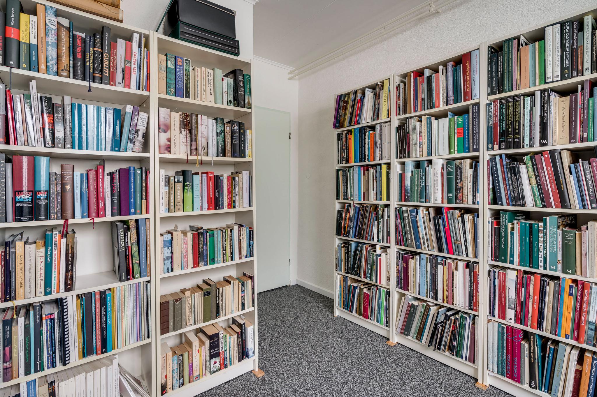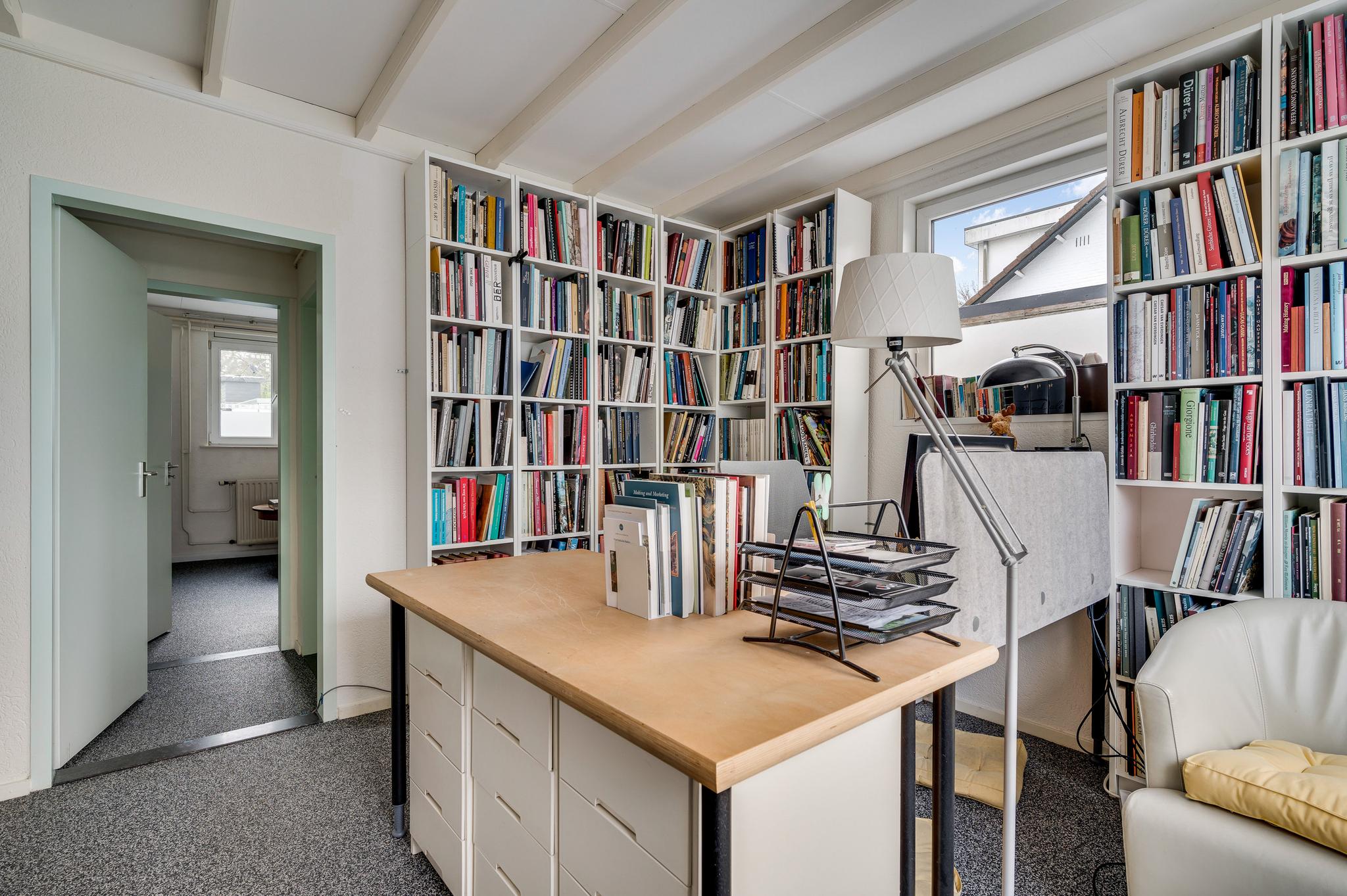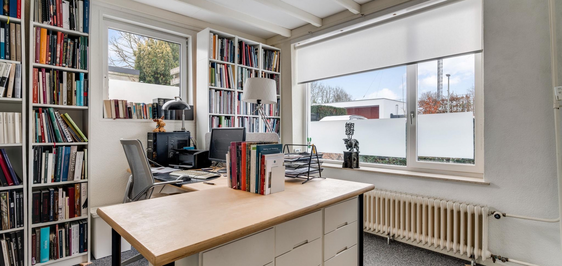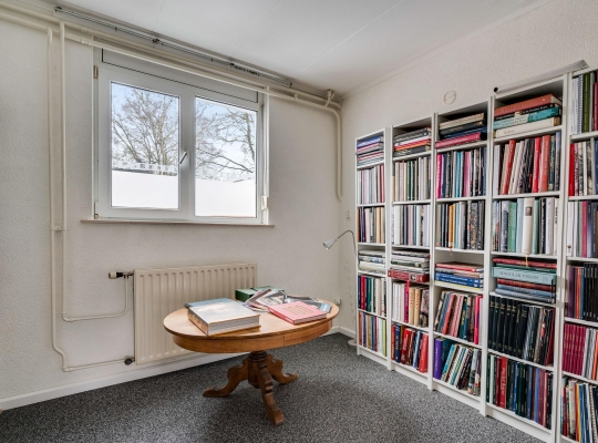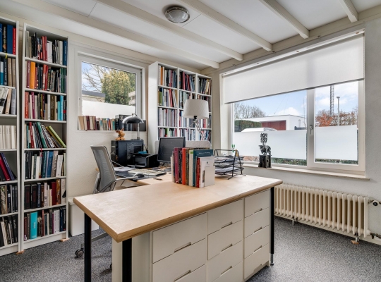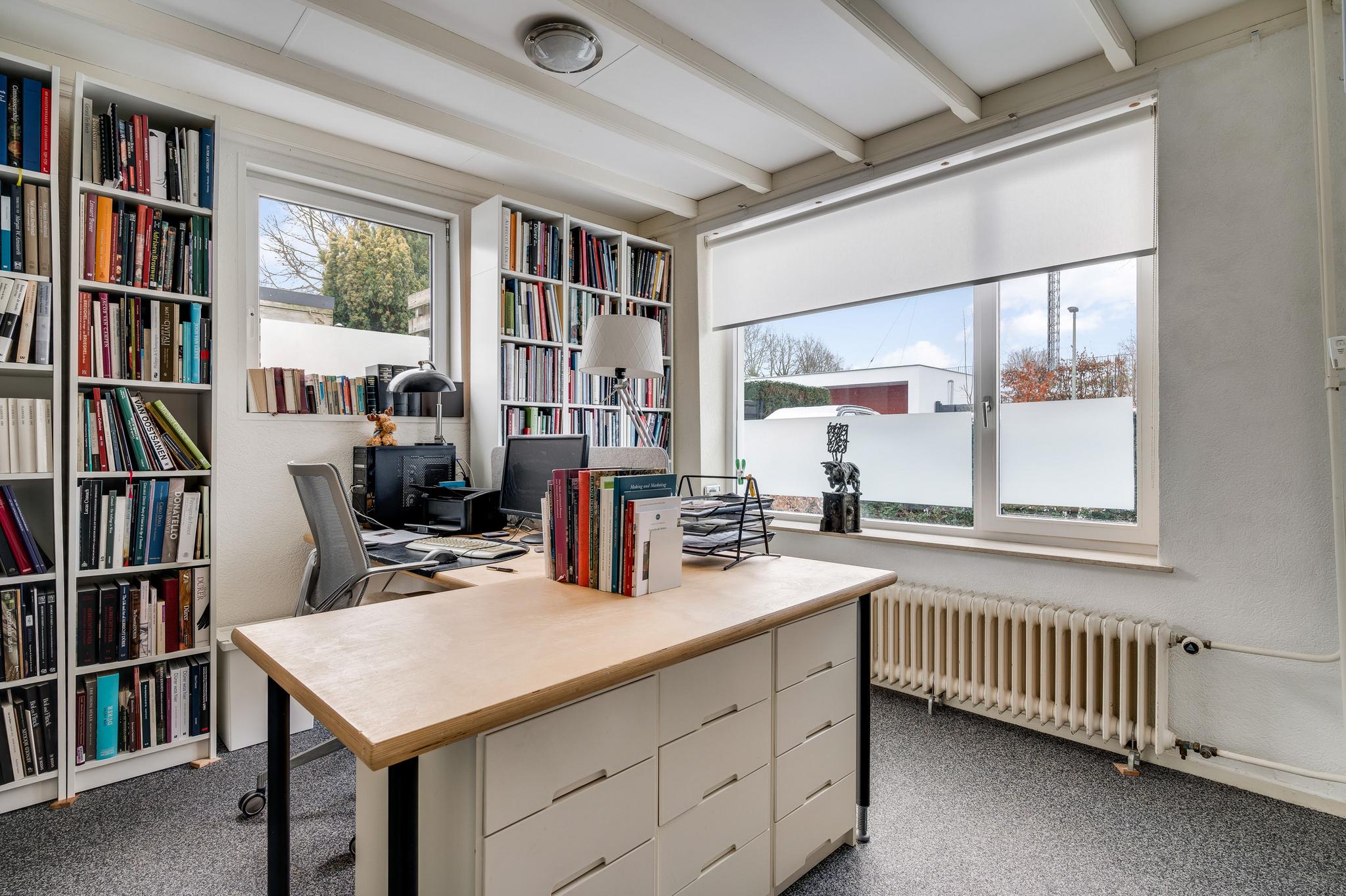 Via de tweede entree, die zich aan de voorzijde bevindt, is de kantoorruimte met eigen keuken (totaal ca. 19,3 m2) te bereiken. Via een tussenportaal zijn een multifunctionele kamer (3,96/3,12 x 3,08), in gebruik als bibliotheek, en een badkamer (2,04 x 1,96) met een douche, toilet en wastafel te bereiken. De kantoorruimte is hierdoor ook geschikt als gastenverblijf, als inpandig appartement voor uw zoon/dochter of als praktijkruimte.