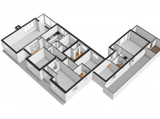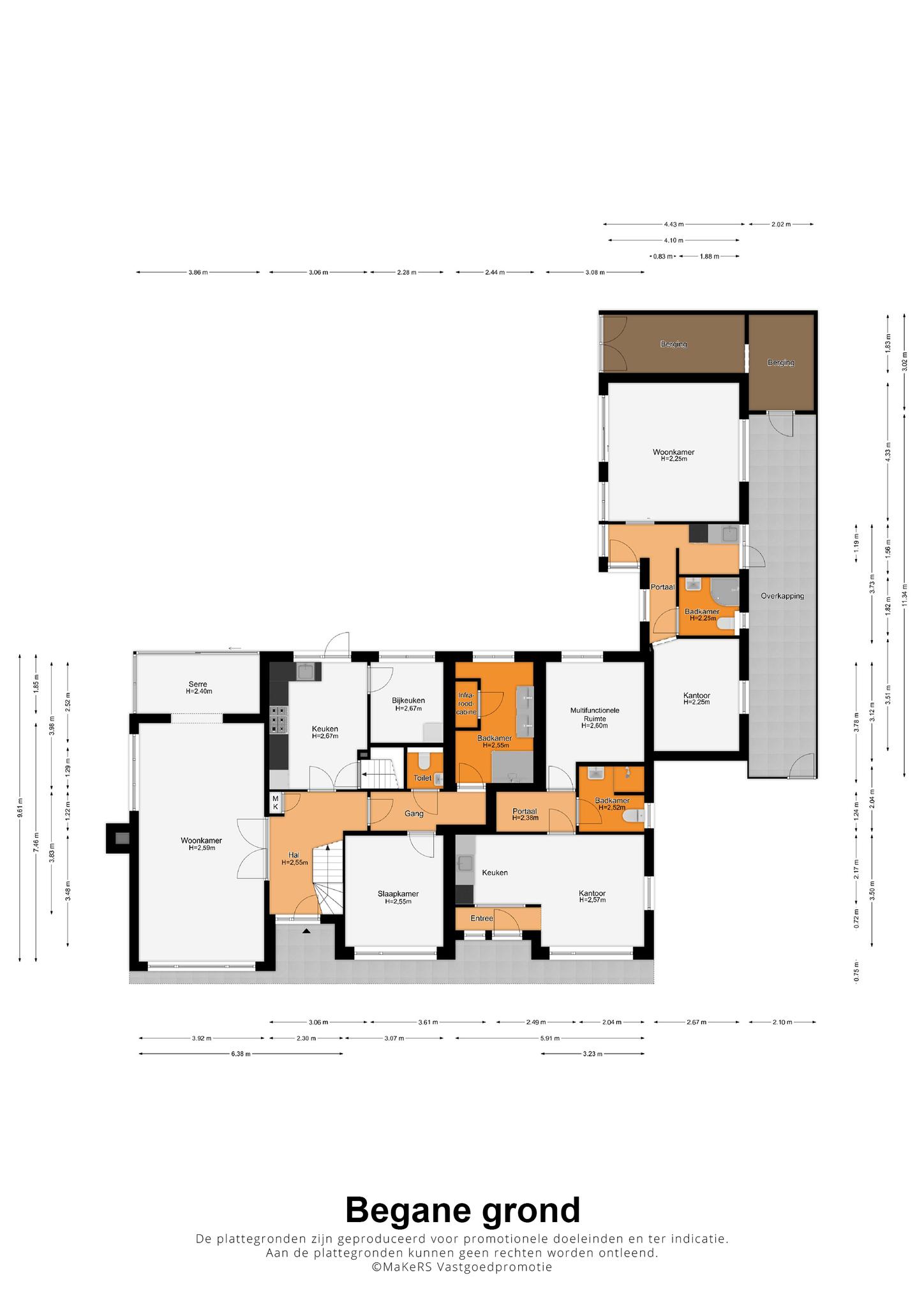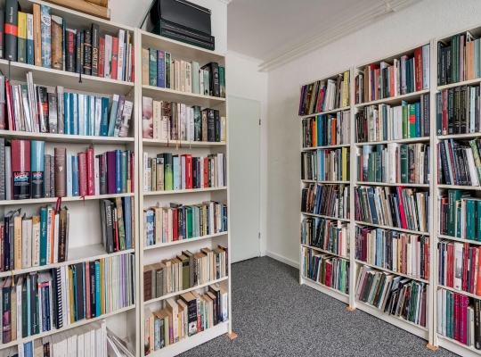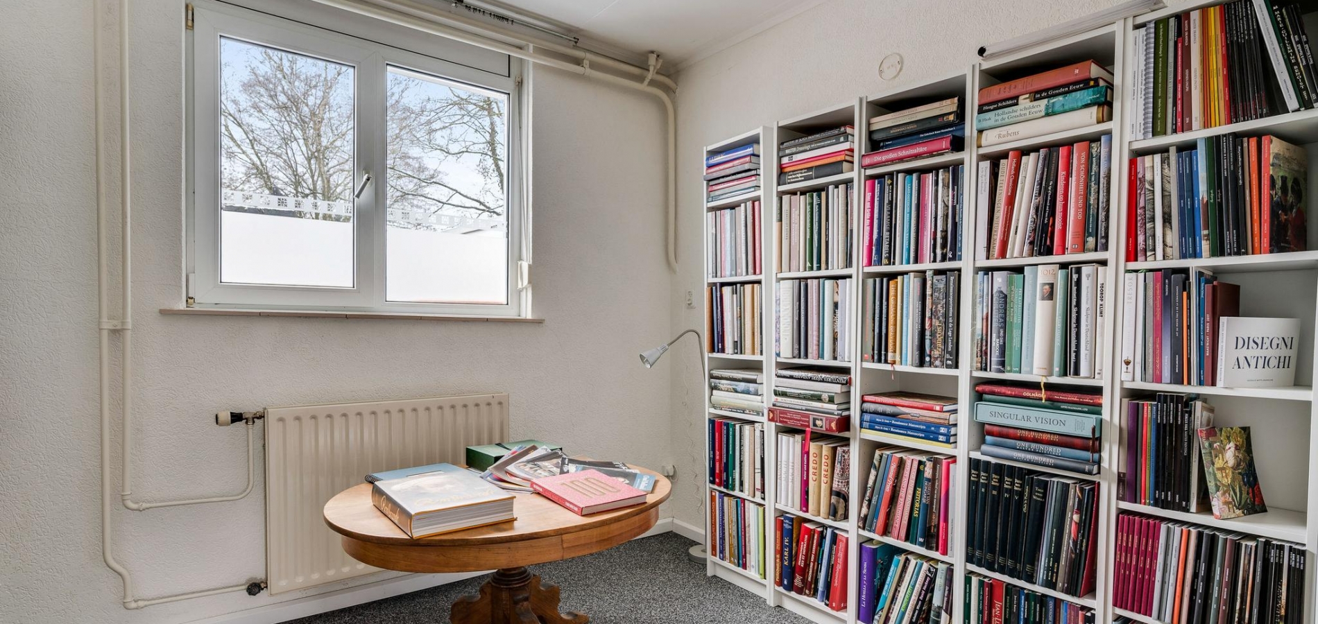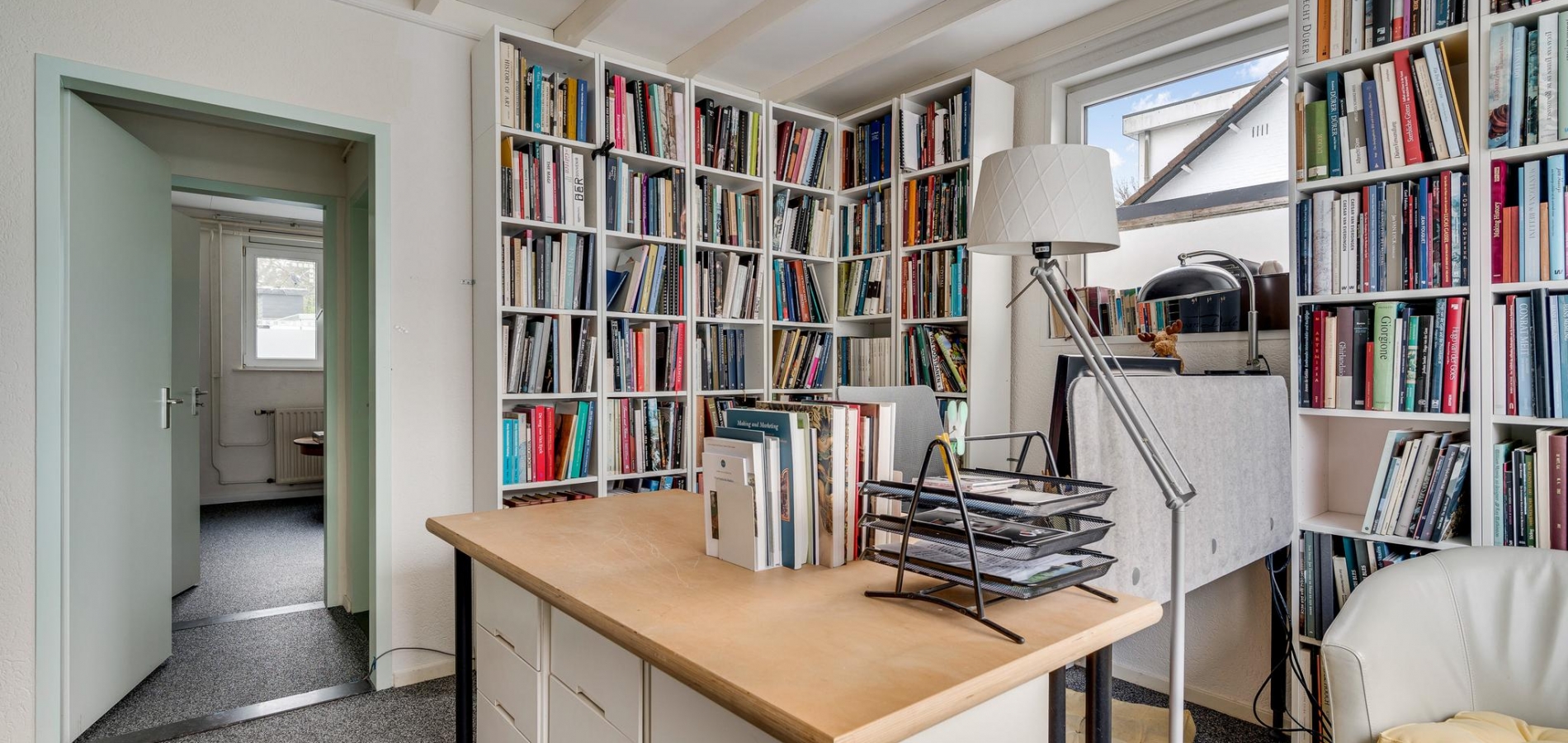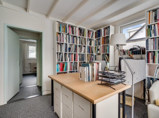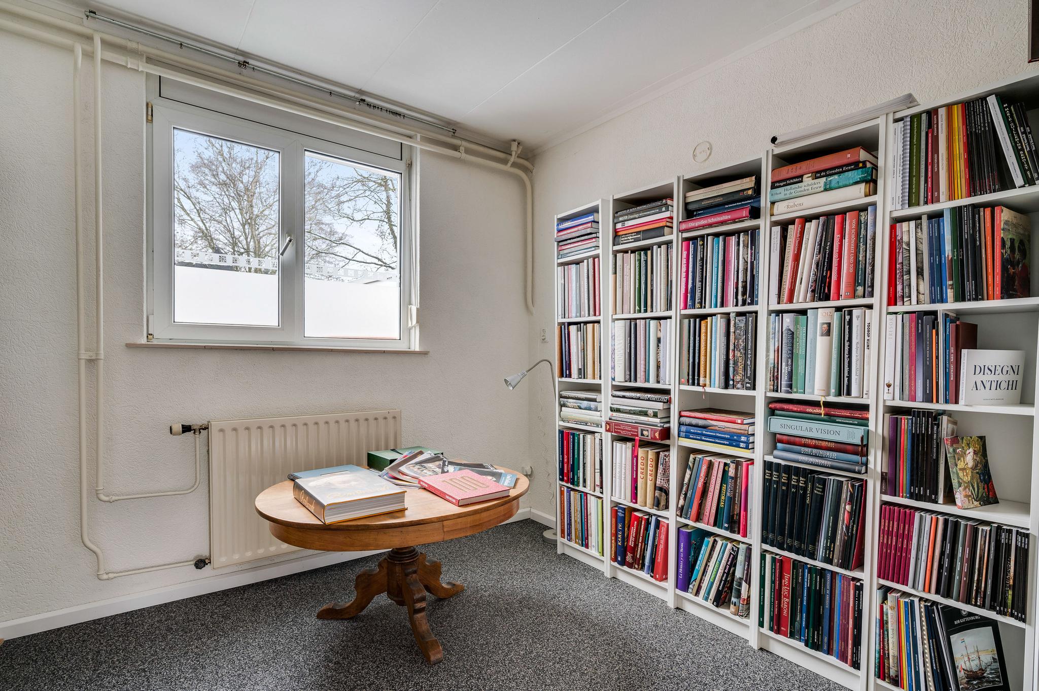 Via de tweede entree, die zich aan de voorzijde bevindt, is de kantoorruimte met eigen keuken (totaal ca. 19,3 m2) te bereiken. Via een tussenportaal zijn een multifunctionele kamer (3,96/3,12 x 3,08), in gebruik als bibliotheek, en een badkamer (2,04 x 1,96) met een douche, toilet en wastafel te bereiken. De kantoorruimte is hierdoor ook geschikt als gastenverblijf, als inpandig appartement voor uw zoon/dochter of als praktijkruimte.