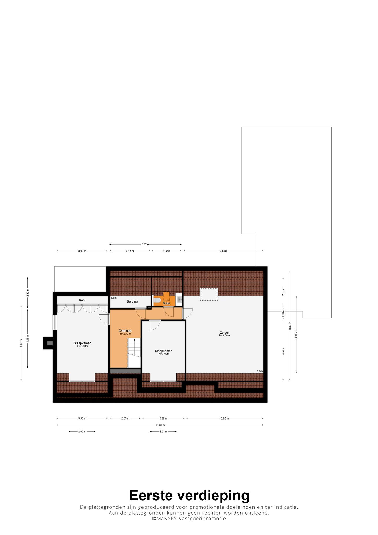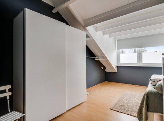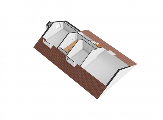 Slaapkamer I (5,75 x 3,90) met dakkapel en vaste kastenwand bevindt zich aan de linkerzijde. Aan de voorzijde, naast de trap, is slaapkamer II (4,57 x 3,27) met dakkapel en de grote zolder (6,01 x 6,13/5,92) biedt de mogelijkheid om nog twee kamers te realiseren. Aan de achterzijde, naast de berging (3,14 x 2,32), is een toiletruimte (2,32 x 2,19) met een toilet, wastafel en bergruimte. Met een andere indeling is het mogelijk om hier een douche te realiseren.