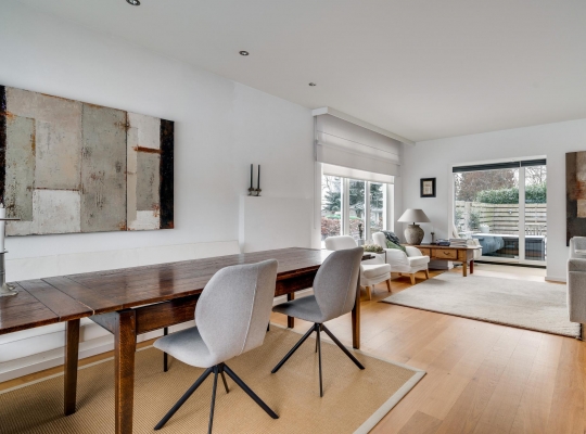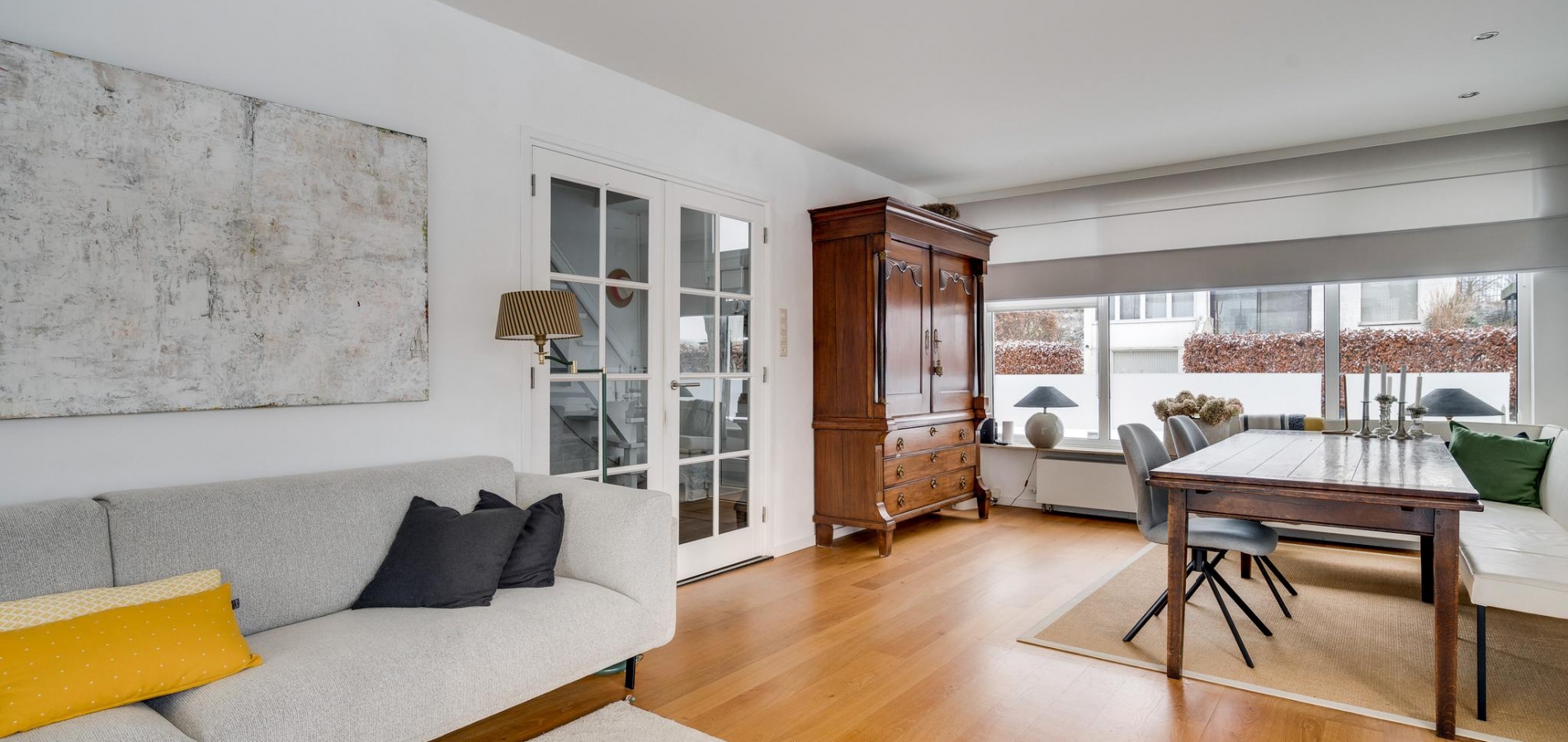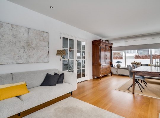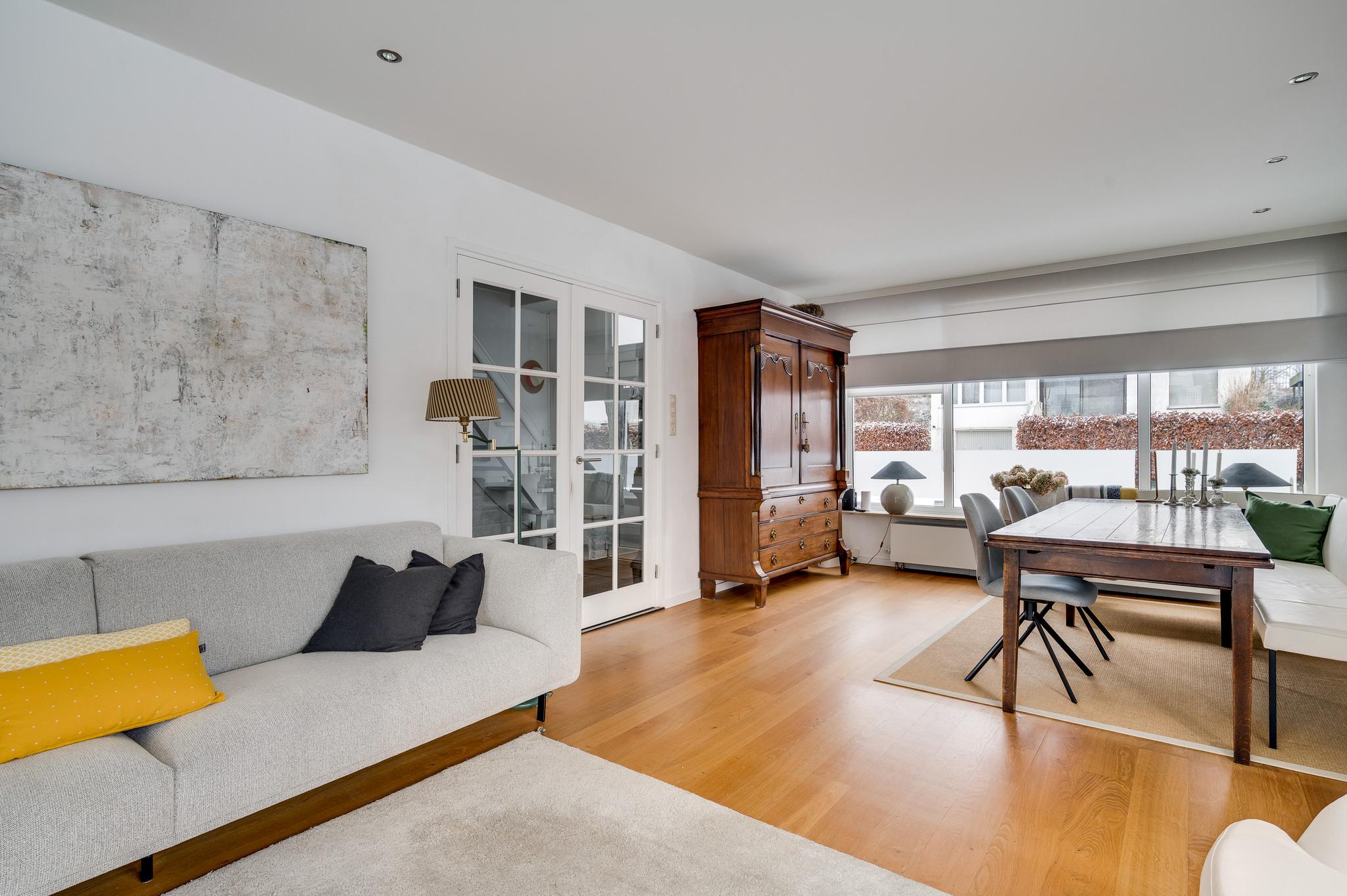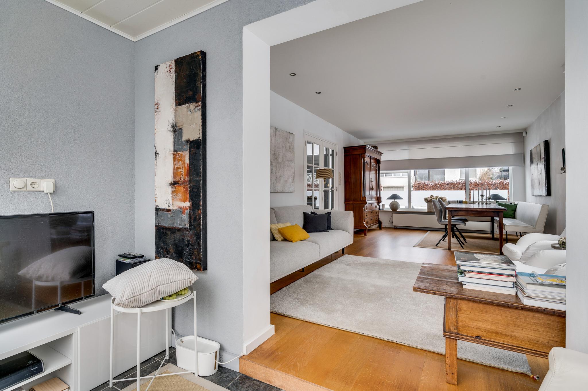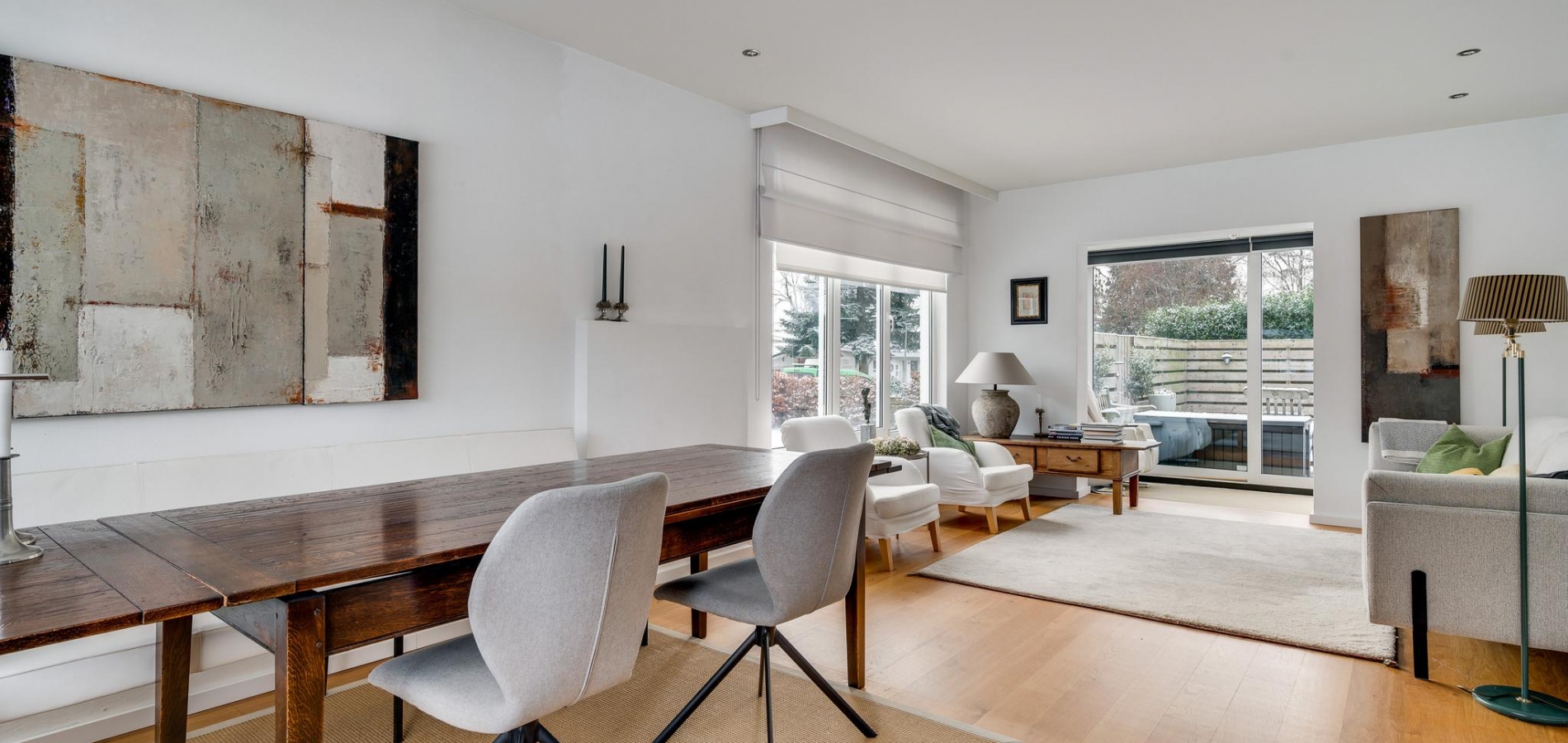 In het linkerdeel van de villa bevindt zich de woonkamer (7,46 x 3,86) met fraai uitzicht naar de tuin en een optimale zonligging. Aan de voorzijde is het eetgedeelte en het ruime zitgedeelte grenst aan de tuinkamer/serre (3,86 x 1,85) met een schuifpui naar de tuin. In de woonkamer ligt een houten vloer en in de tuinkamer/serre dezelfde travertinvloer als in de hal.