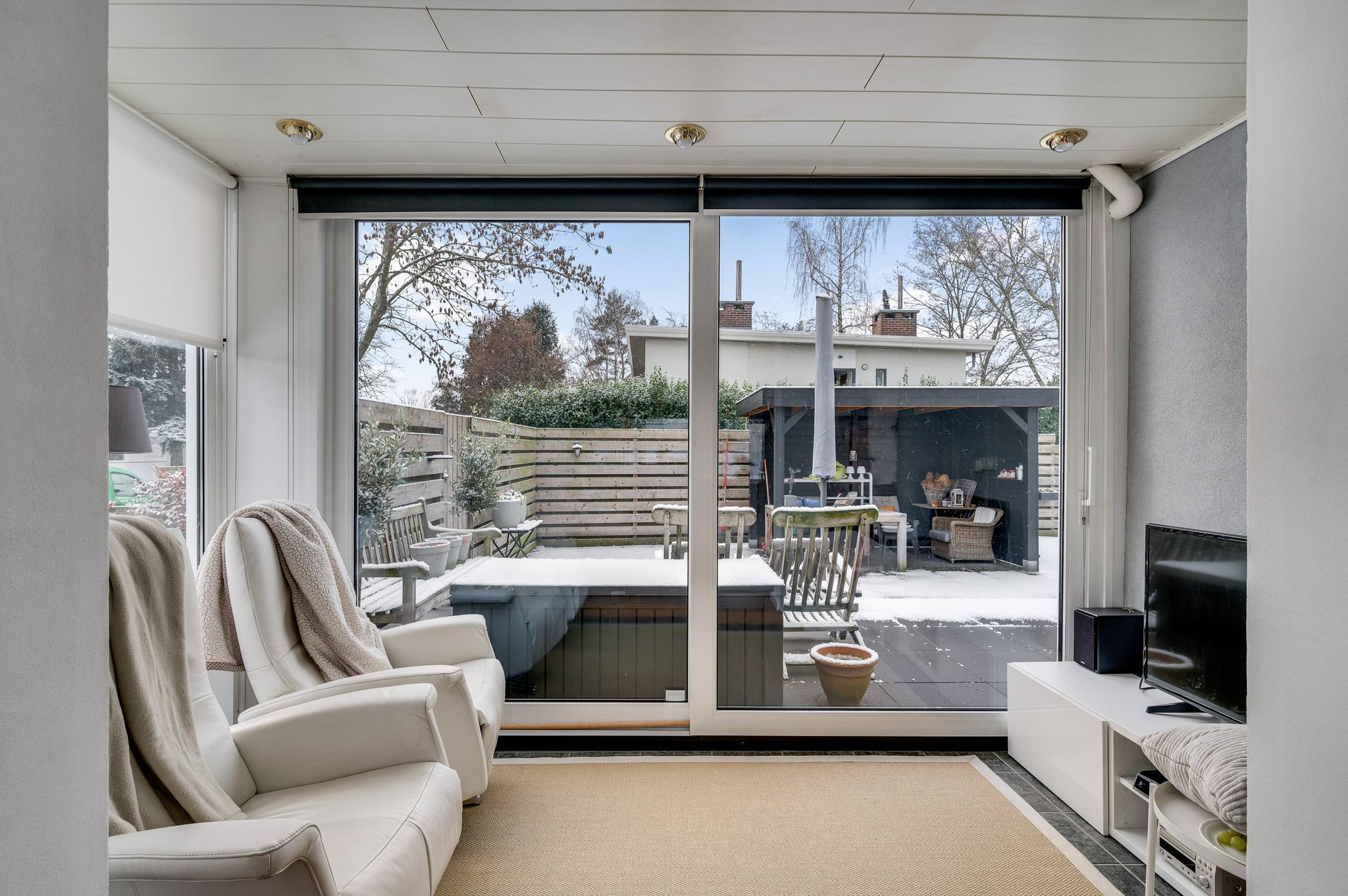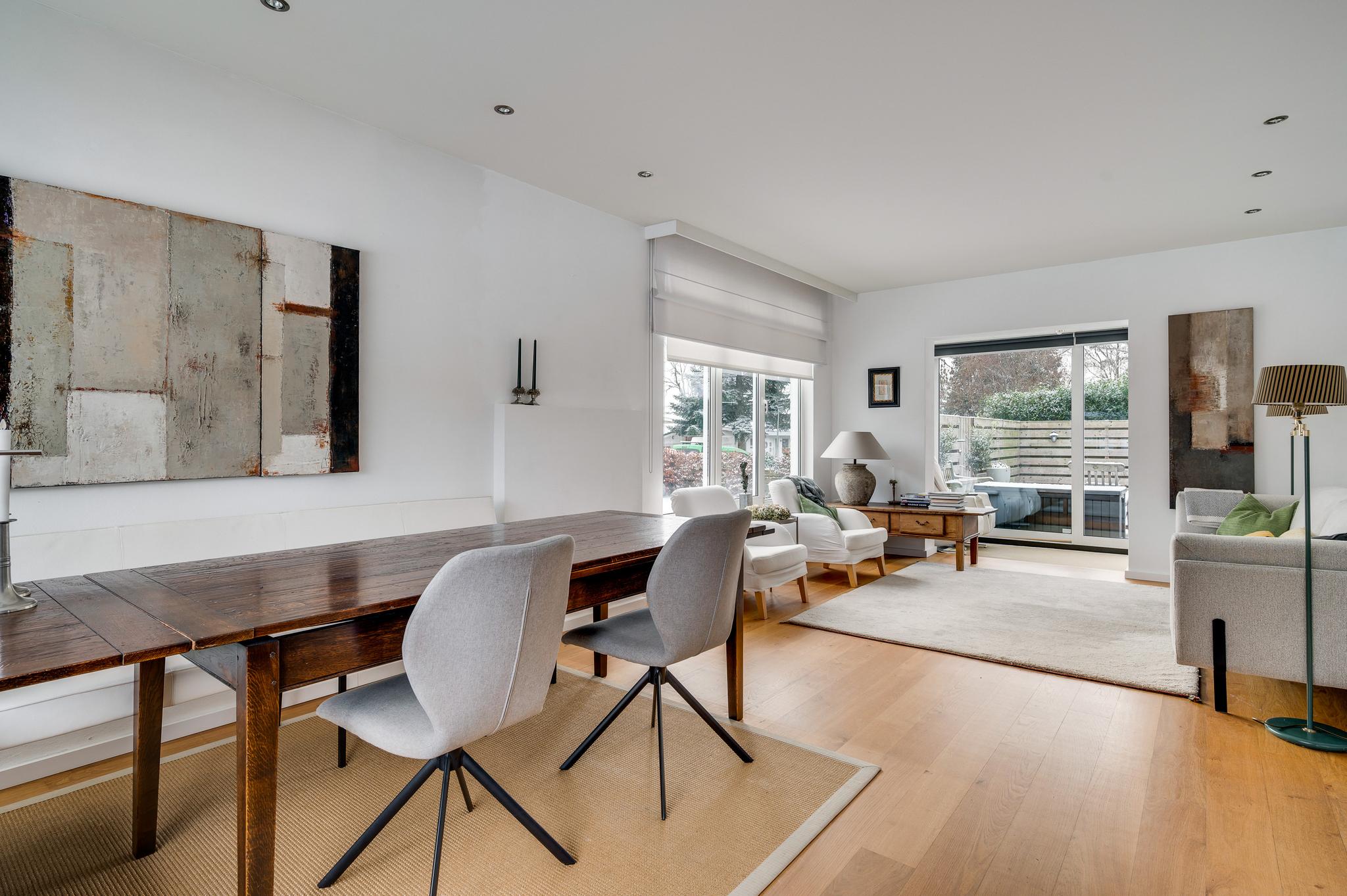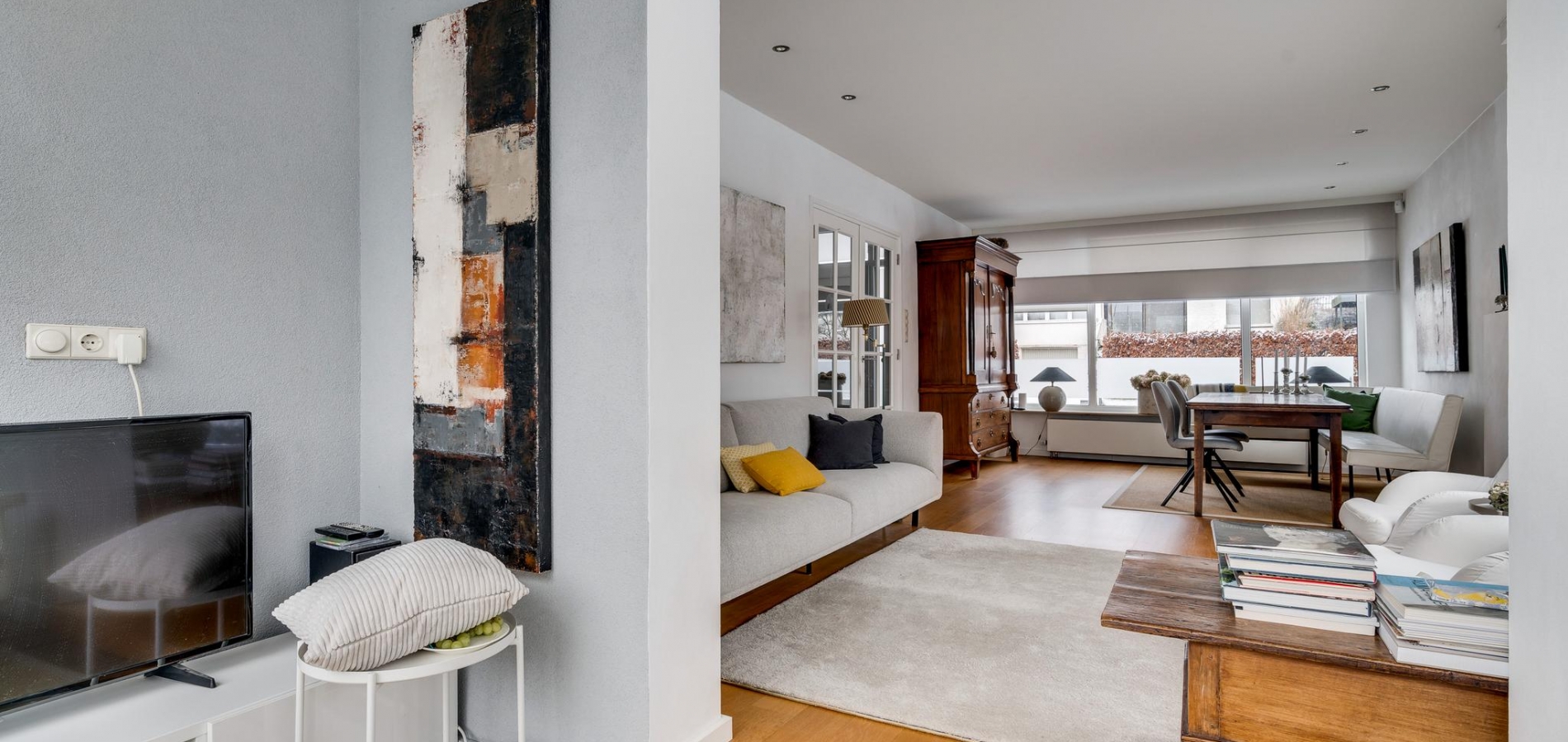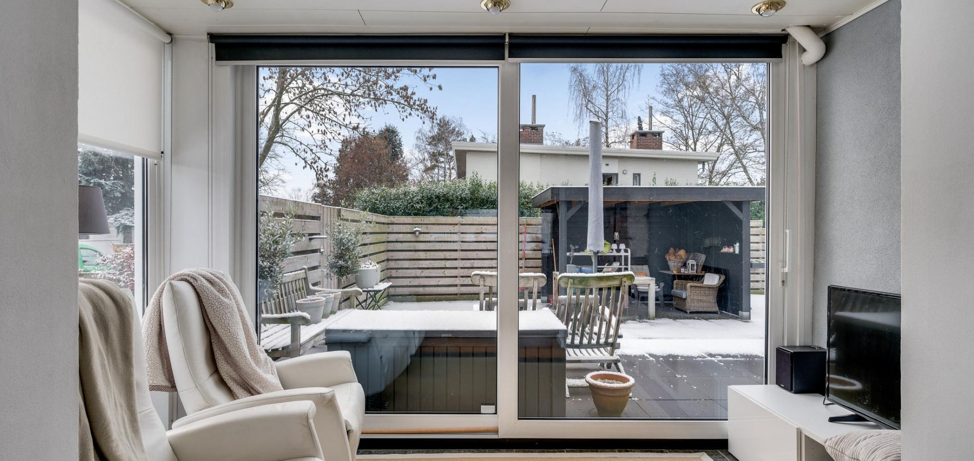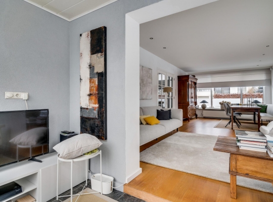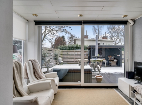 In het linkerdeel van de villa bevindt zich de woonkamer (7,46 x 3,86) met fraai uitzicht naar de tuin en een optimale zonligging. Aan de voorzijde is het eetgedeelte en het ruime zitgedeelte grenst aan de tuinkamer/serre (3,86 x 1,85) met een schuifpui naar de tuin. In de woonkamer ligt een houten vloer en in de tuinkamer/serre dezelfde travertinvloer als in de hal.