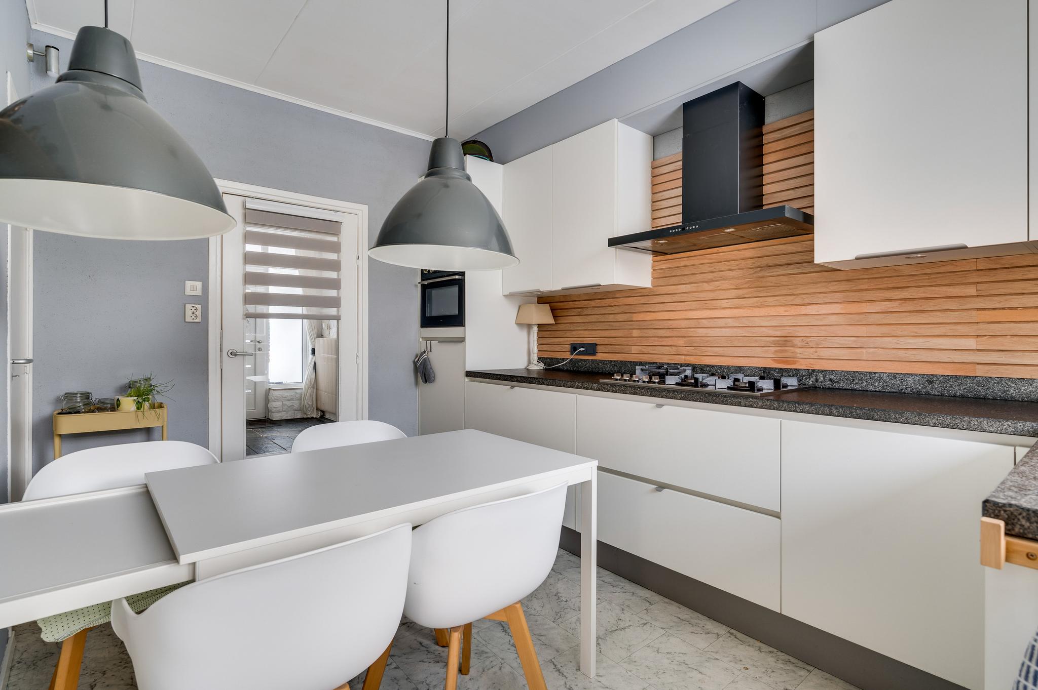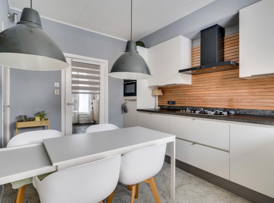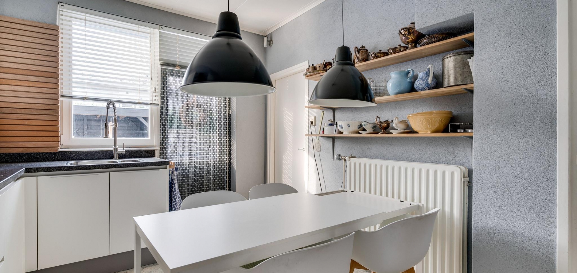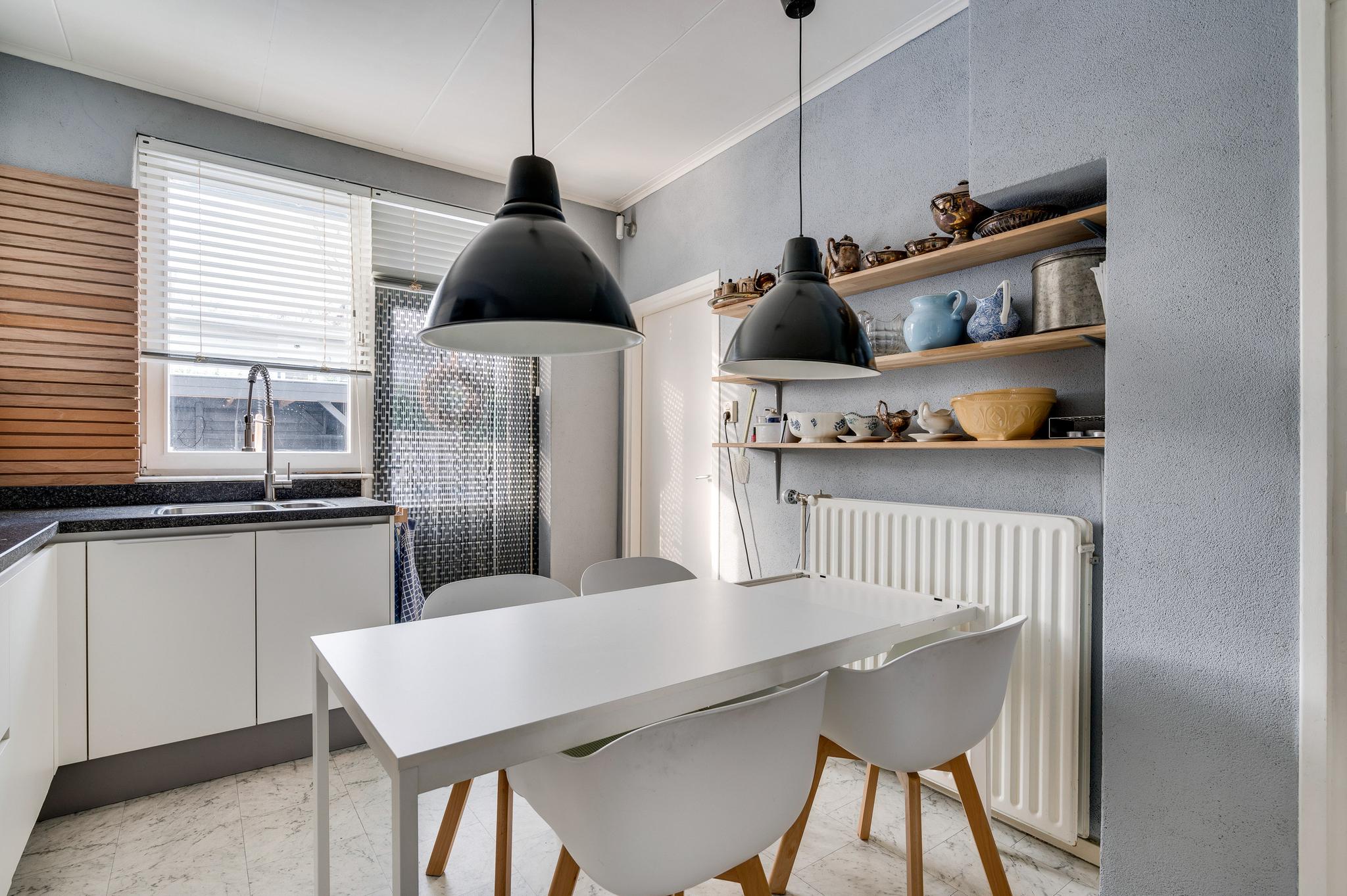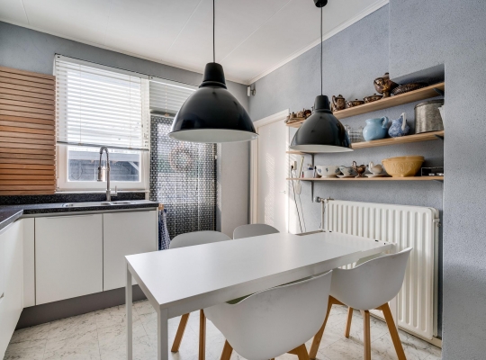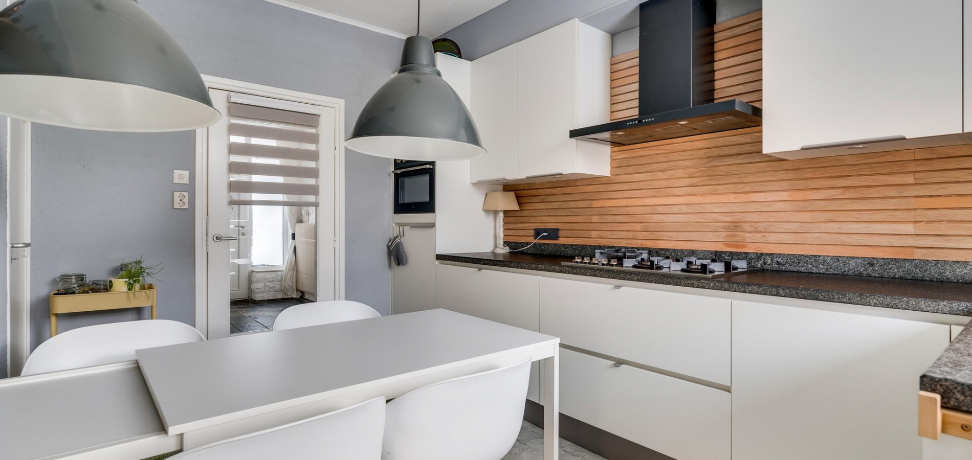 De keuken en bijkeuken bevinden zich aan de achterzijde. In de dichte keuken (3,98 x 3,06/2,75) met marmeren vloer is ruimte voor een ontbijttafel en de moderne keukenopstelling in L-vorm (2017) is voorzien van een 5-pits gaskookplaat, afzuigkap, combi-oven, koelkast en een vaatwasser. Erg fraai is de achterwand van hout, die goed past bij het granieten blad. De bijkeuken (2,52 x 2,28) biedt ruimte aan de wasapparatuur.