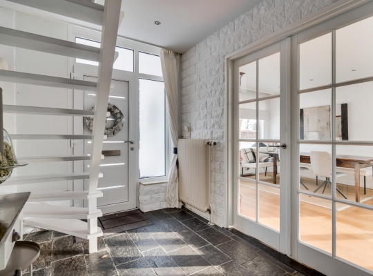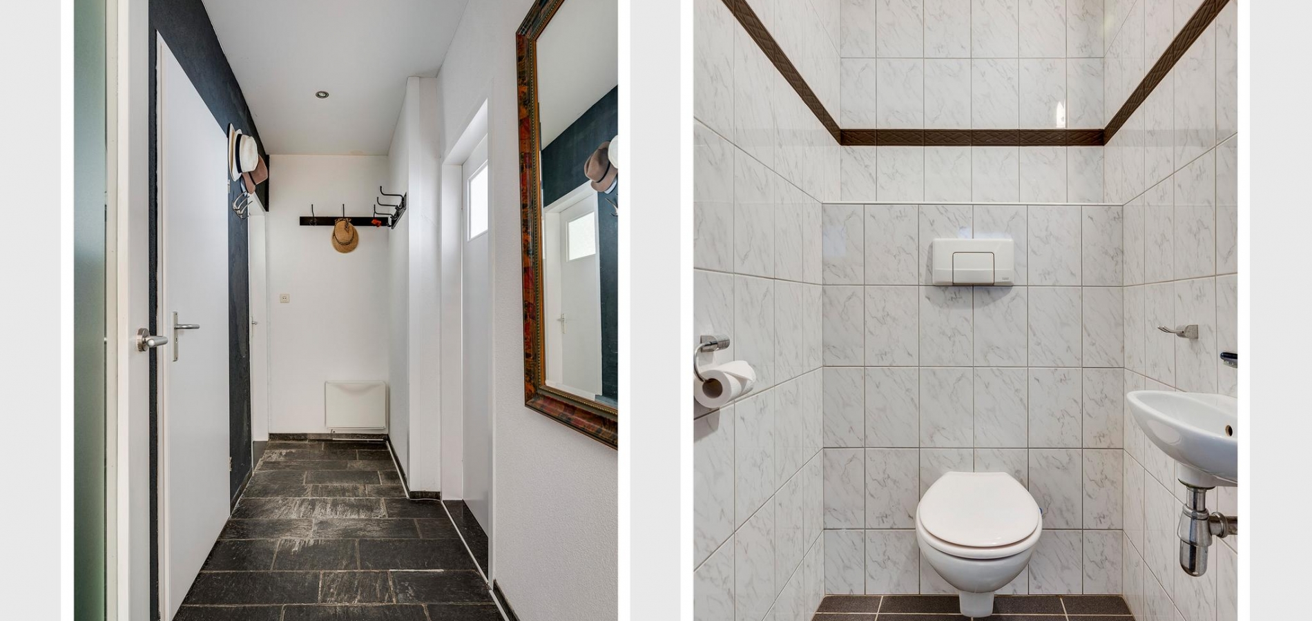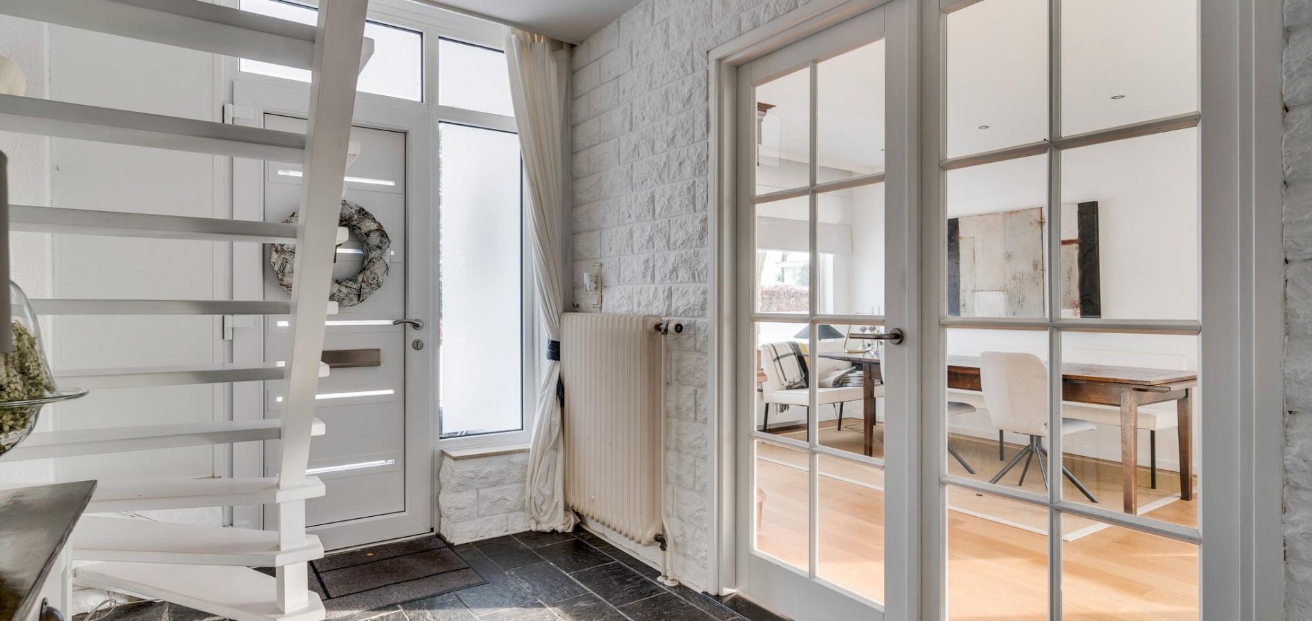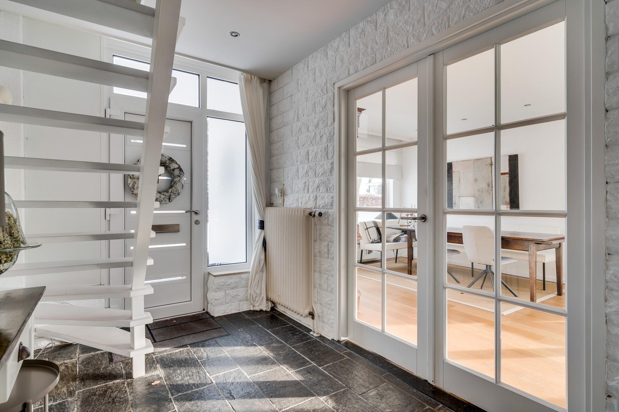 Aan de kant van de Heideweg loopt u, via de voortuin, naar de overdekte entree van deze zeer ruime villa. In de hal met travertinvloer ziet u de vaste trap naar de eerste verdieping en de meterkast. Dankzij de lichte kleurstelling oogt de hal heel ruimtelijk.