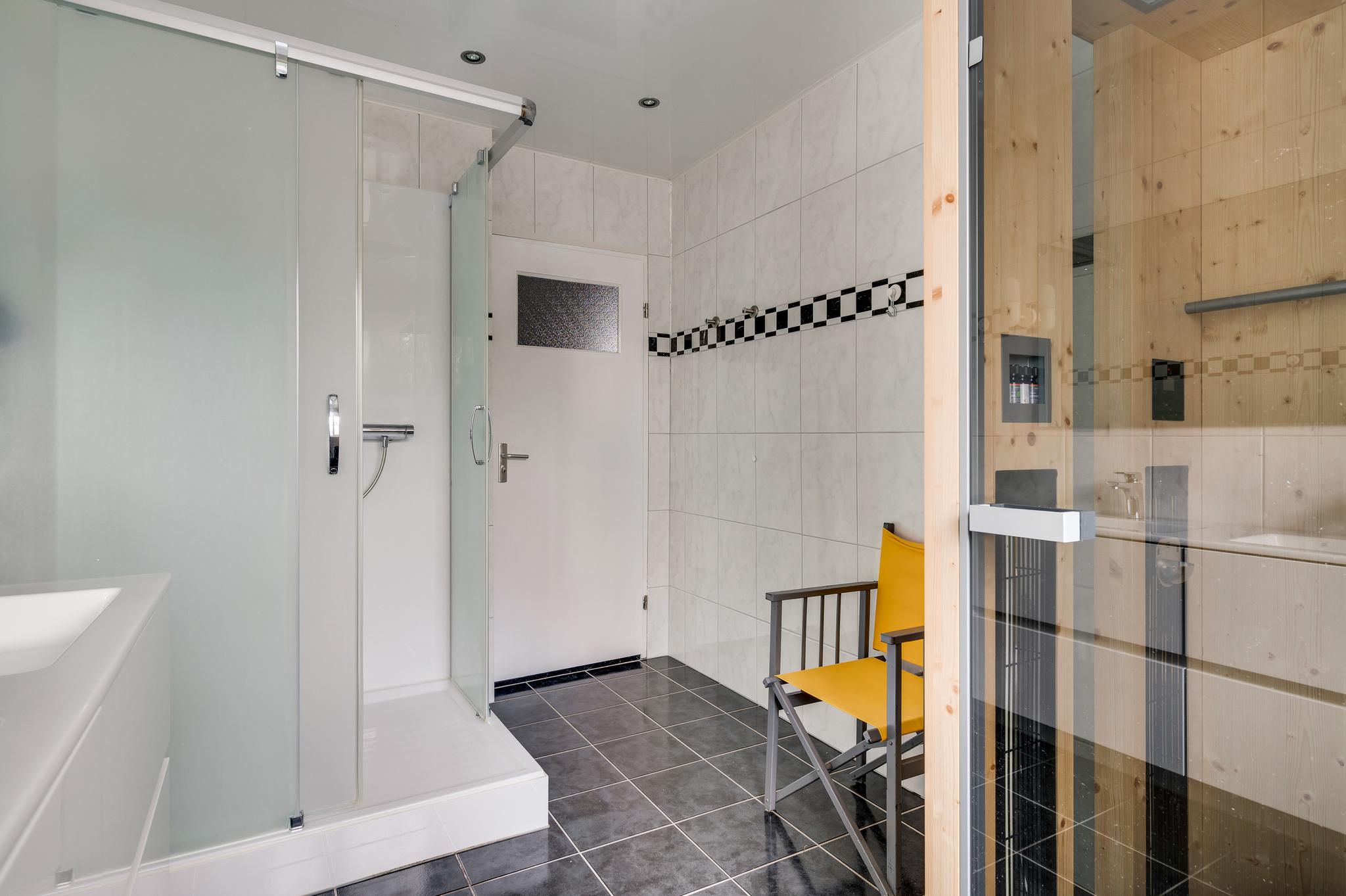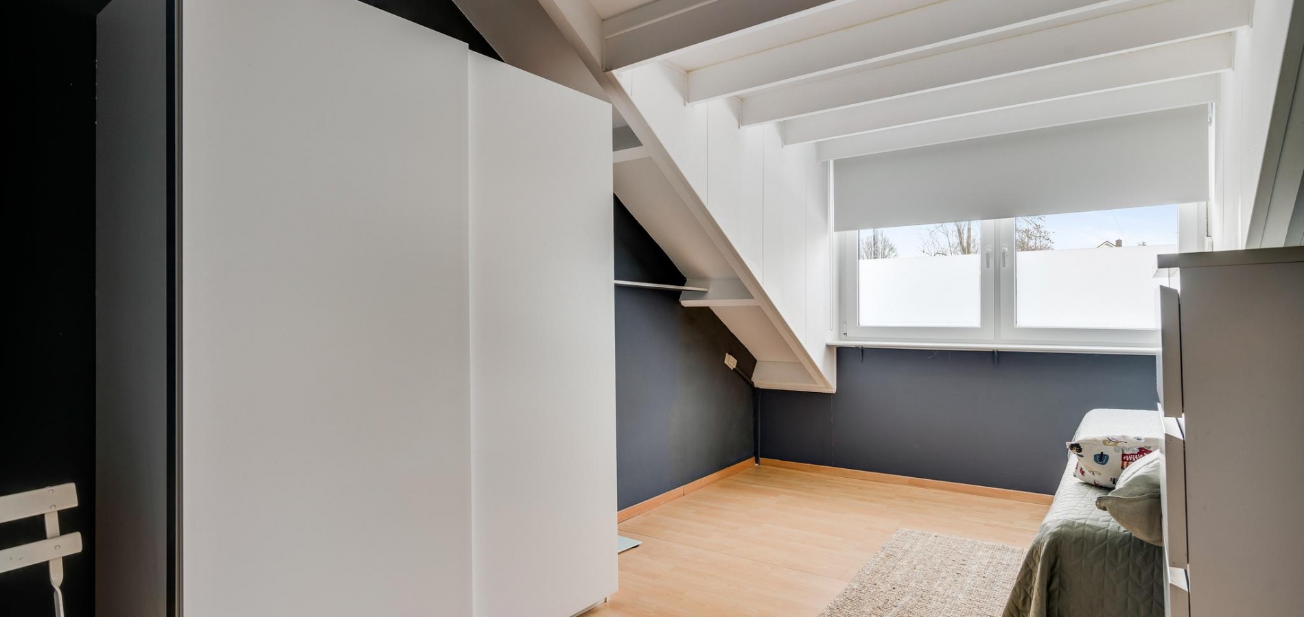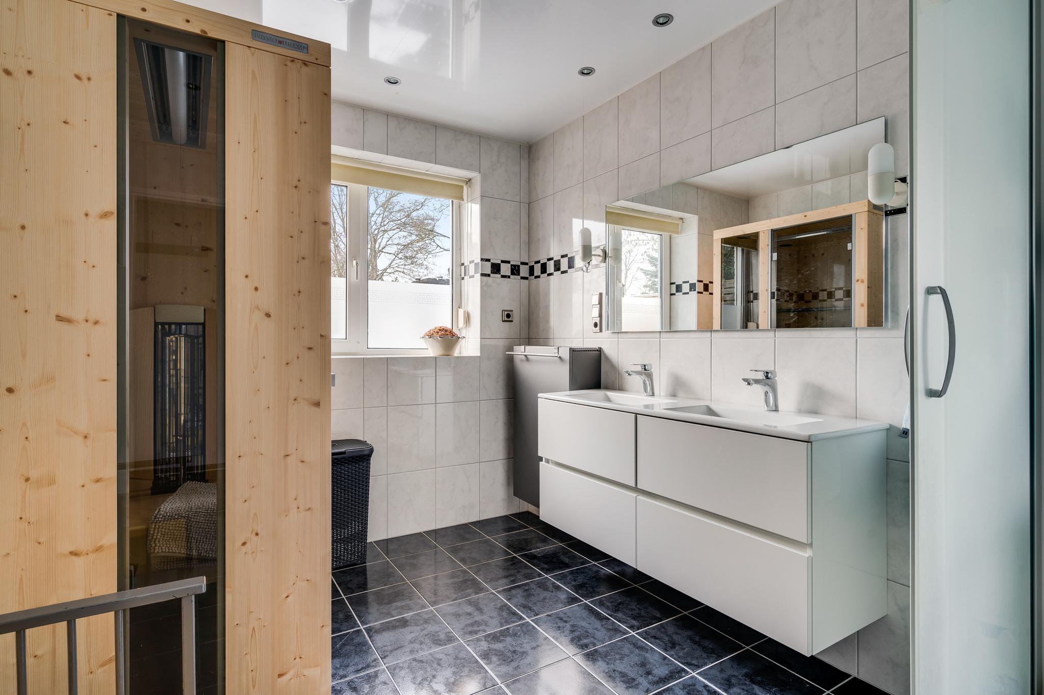 Aan het tweede deel van de hal grenzen de toiletruimte met fonteintje, een ruime badkamer en een slaapkamer waardoor gelijkvloers wonen mogelijk is. De slaapkamer (3,48 x 3,07) bevindt zich aan de voorzijde en de badkamer (3,78 x 2,44) is fraai ingericht met een infraroodcabine, dubbel wastafelmeubel en een zeer ruime douche.