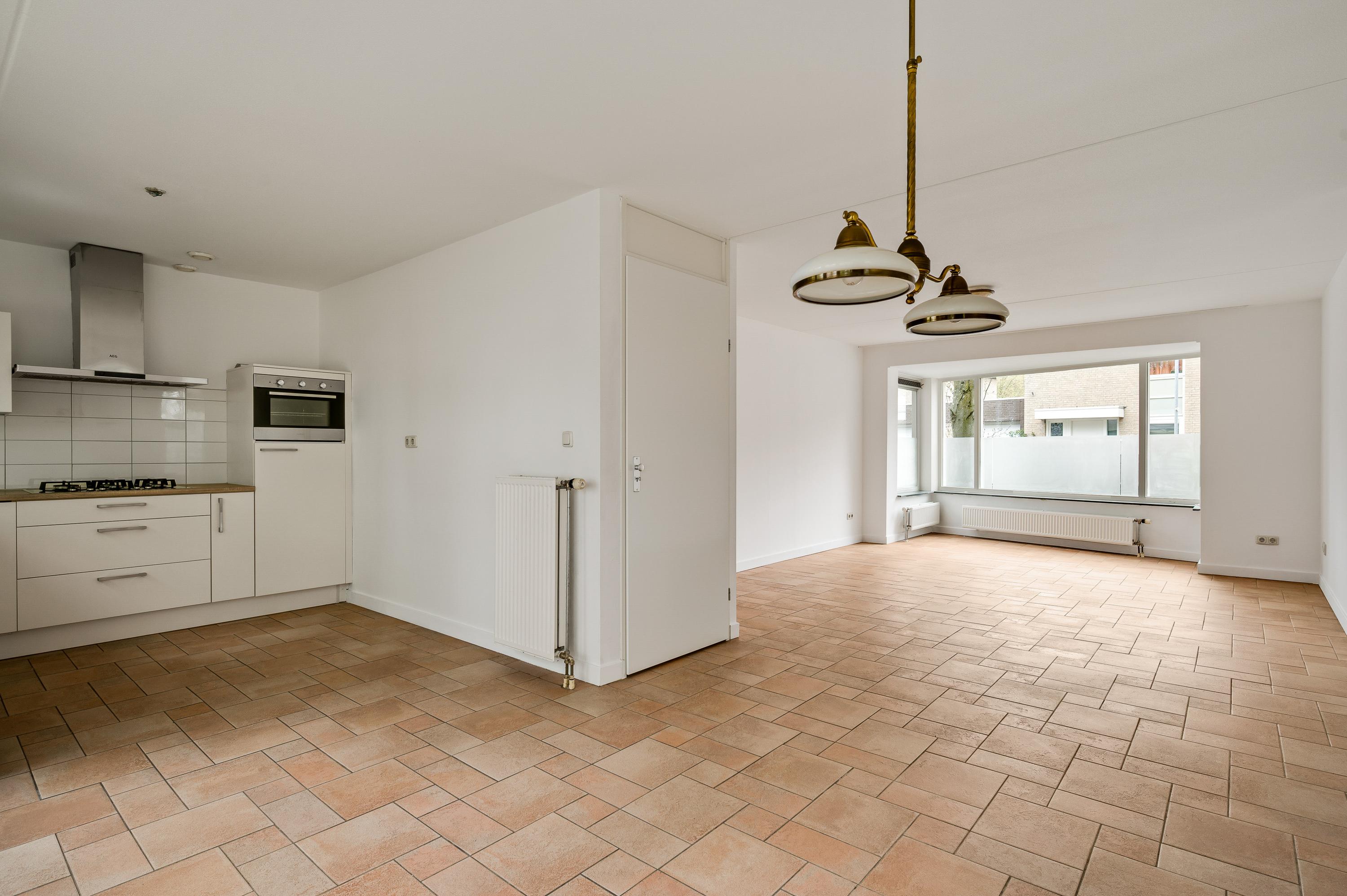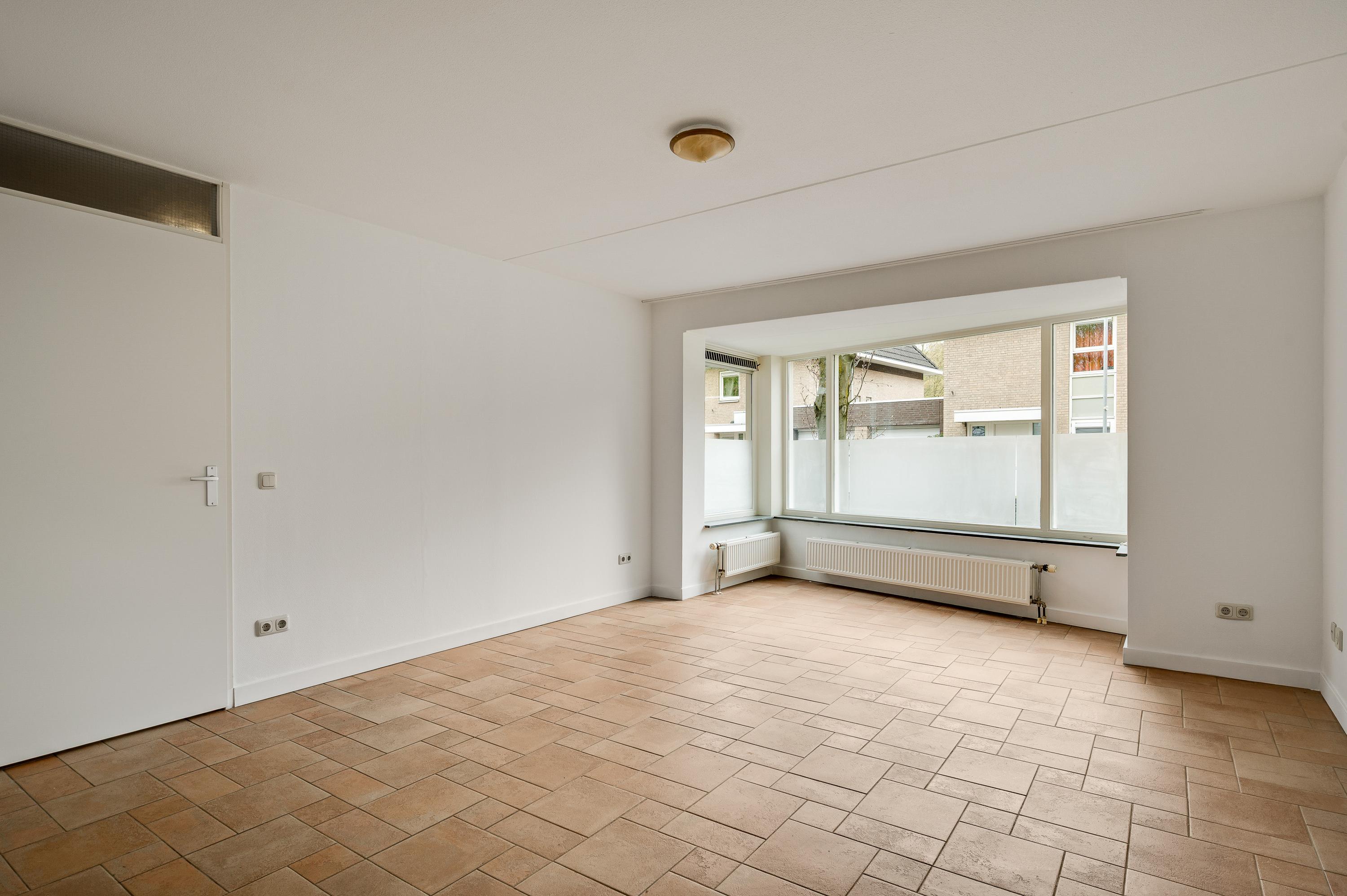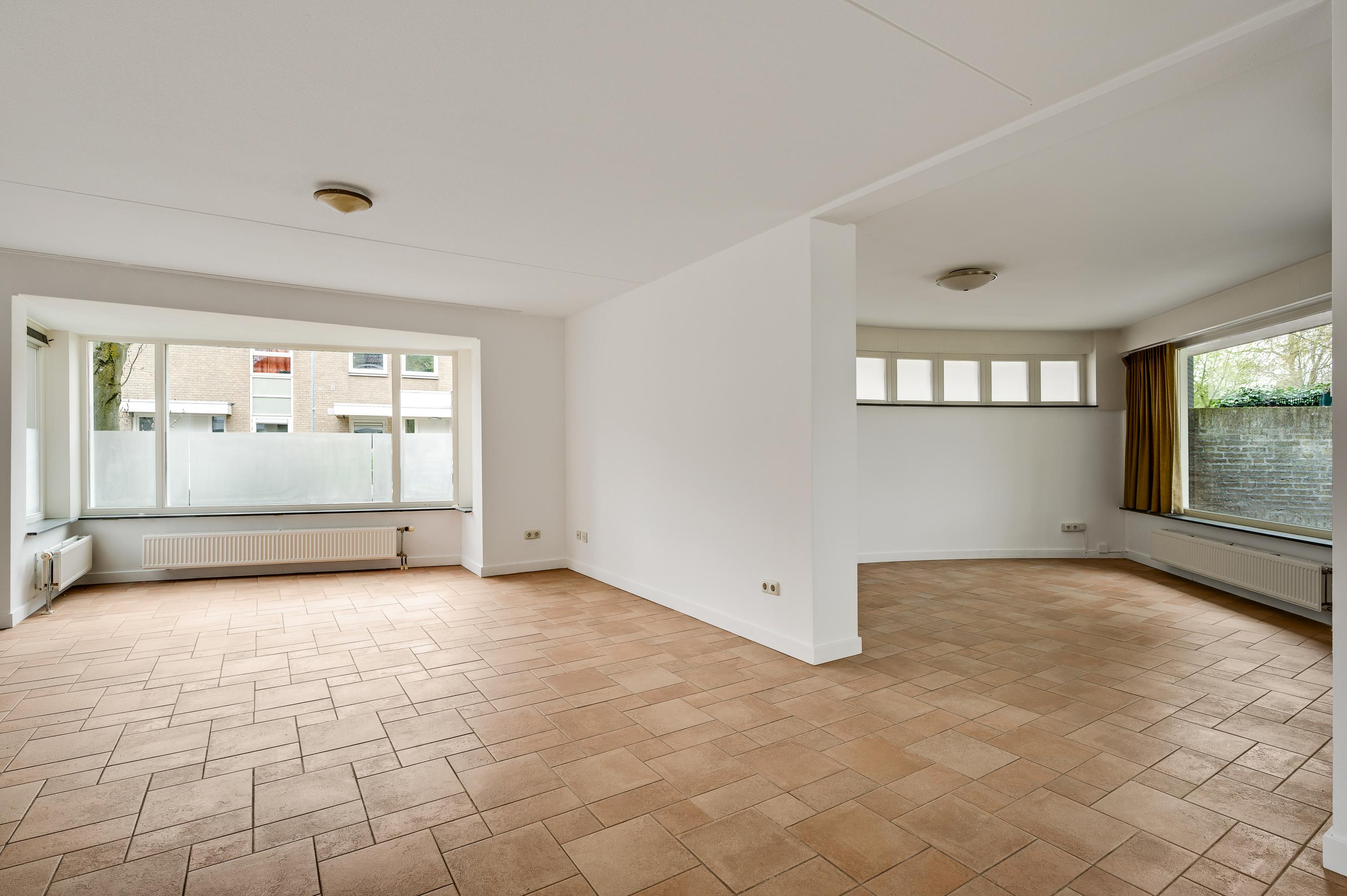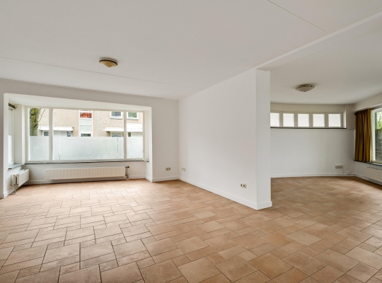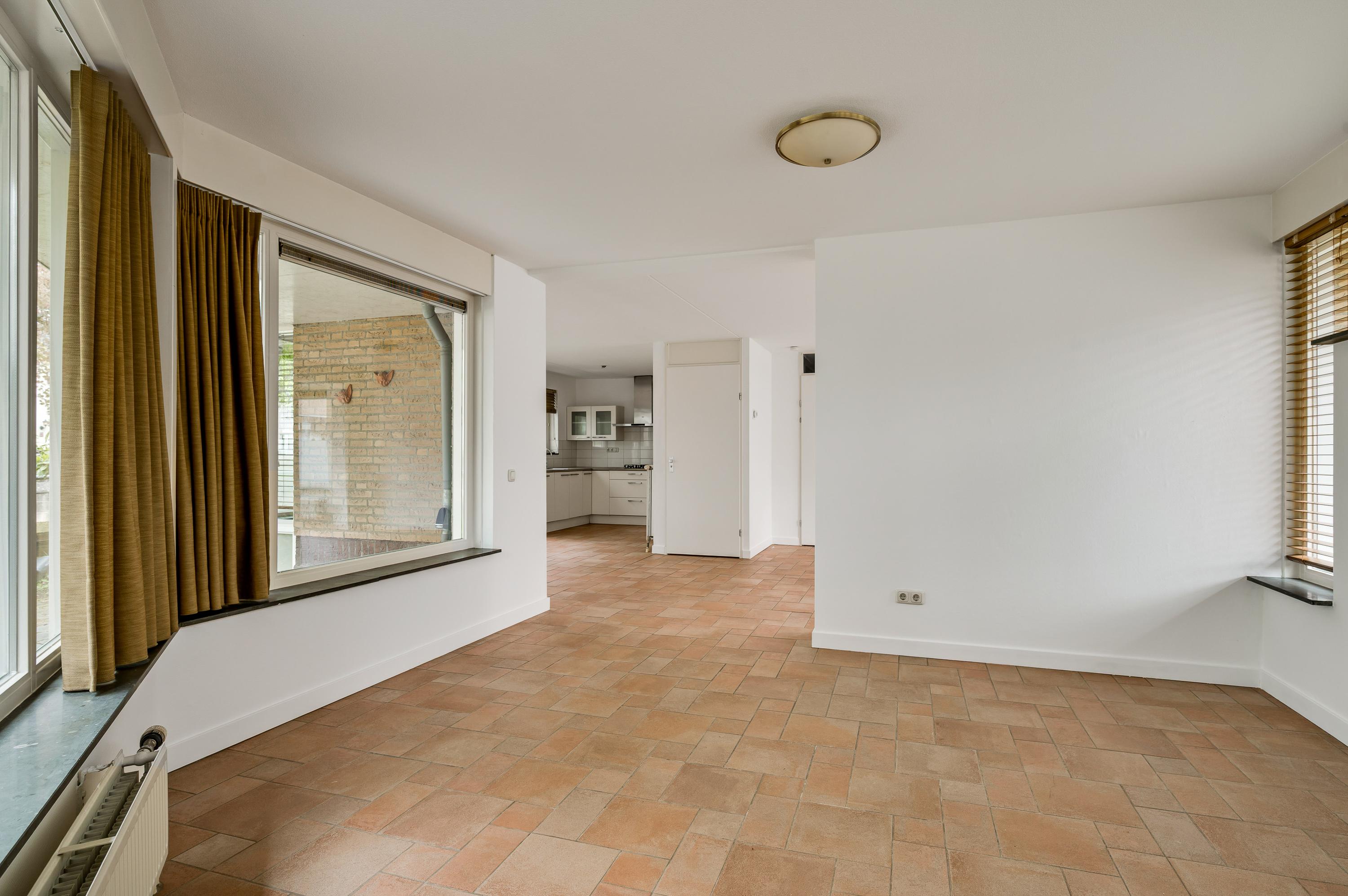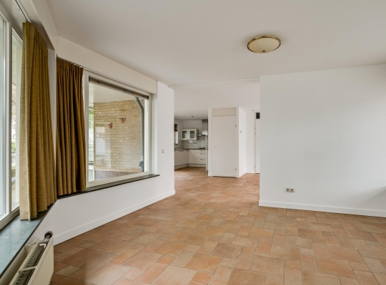 Speelse vormen bepalen de sfeer in de woon-/eetkamer, met een erker aan de voorzijde en openslaande deuren naar de achtertuin. De aanbouw met een fraaie ronding is zeer geschikt als royale eetkamer, tv-kamer of zithoek met uitzicht op de tuin en de Geul.
