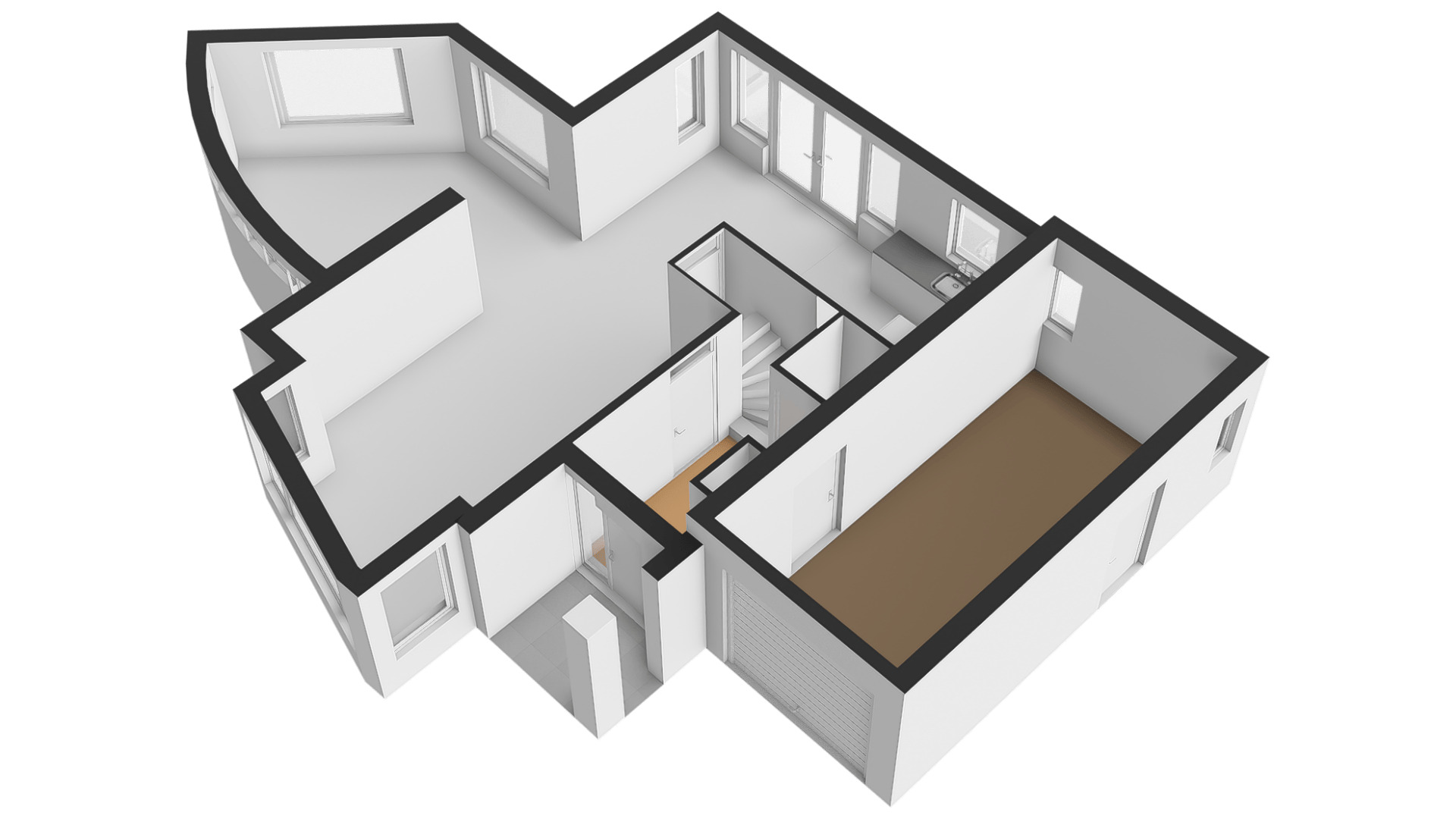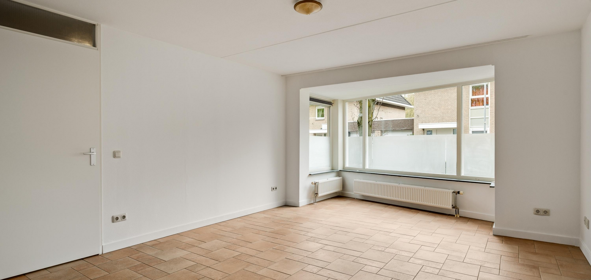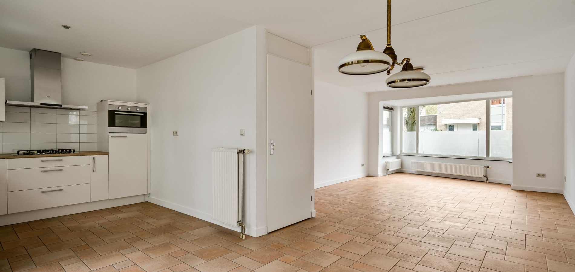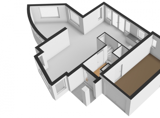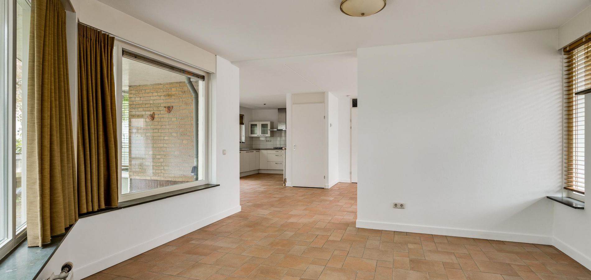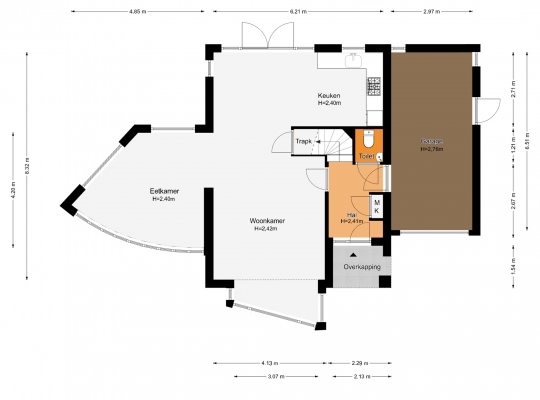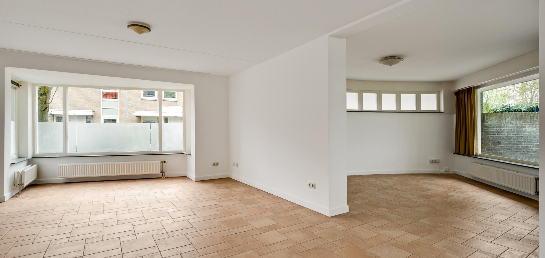 Speelse vormen bepalen de sfeer in de woon-/eetkamer, met een erker aan de voorzijde en openslaande deuren naar de achtertuin. De aanbouw met een fraaie ronding is zeer geschikt als royale eetkamer, tv-kamer of zithoek met uitzicht op de tuin en de Geul.