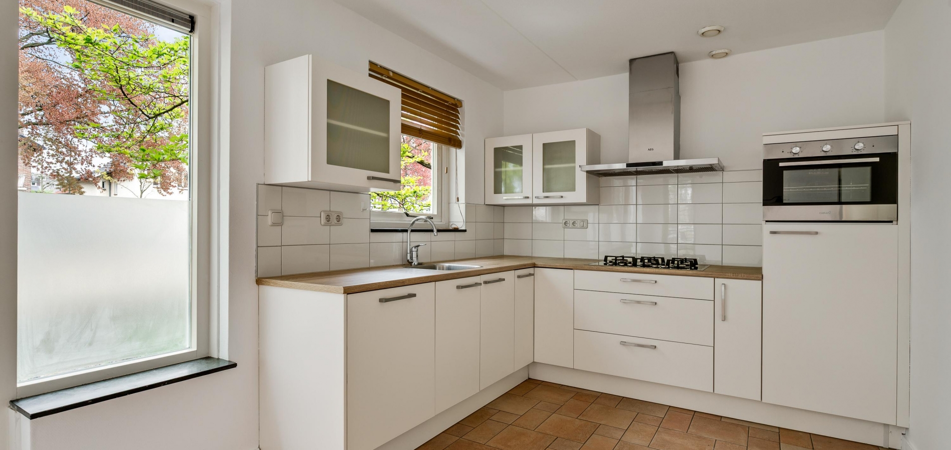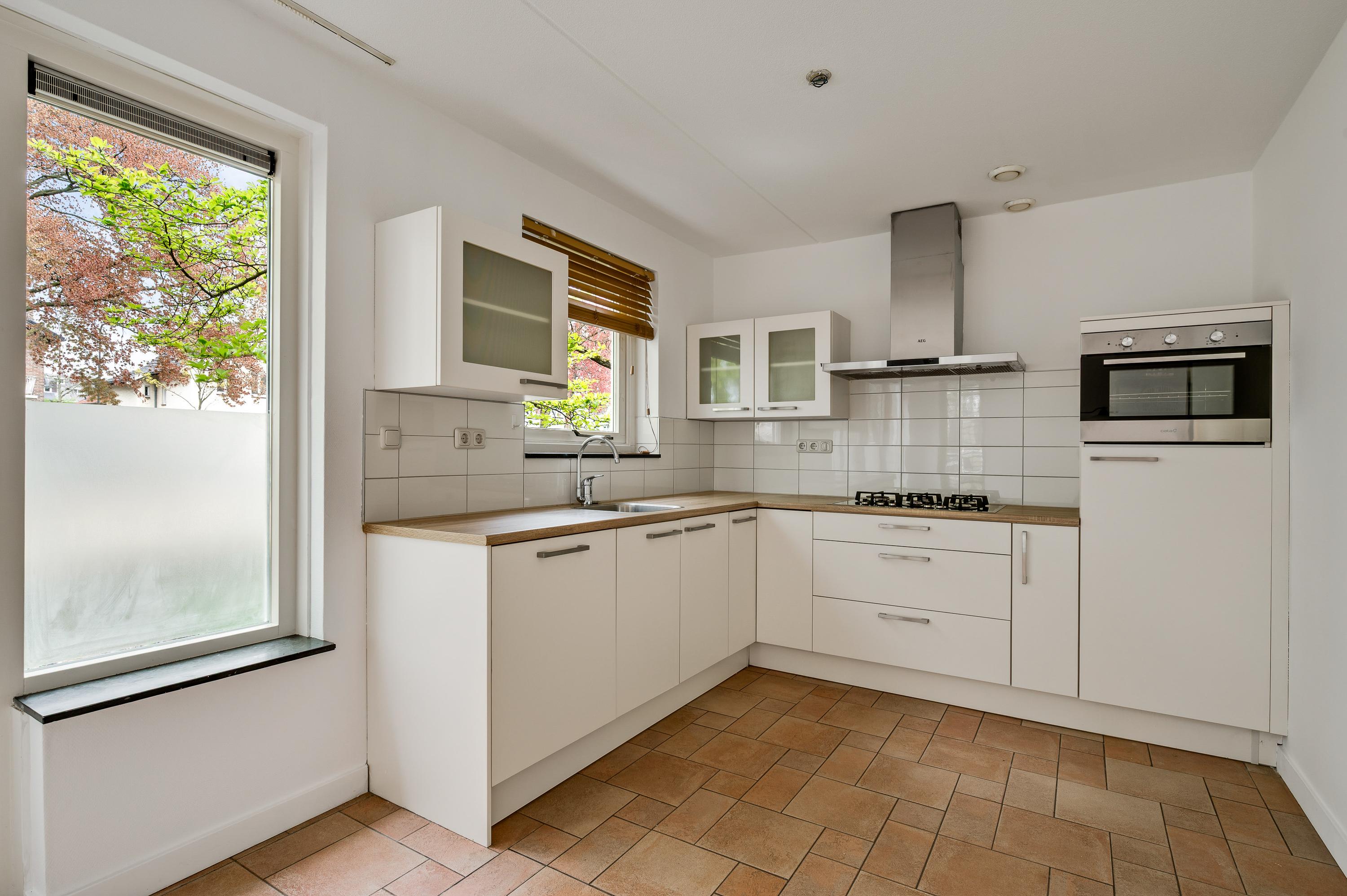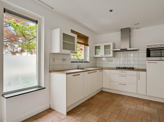 In de open keuken staat een lichte hoekopstelling met een houtlookblad en diverse inbouwapparatuur: een 5-pits gaskookplaat, afzuigkap, vaatwasser, combi-oven en een koelkast.