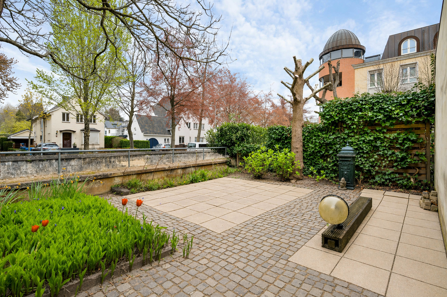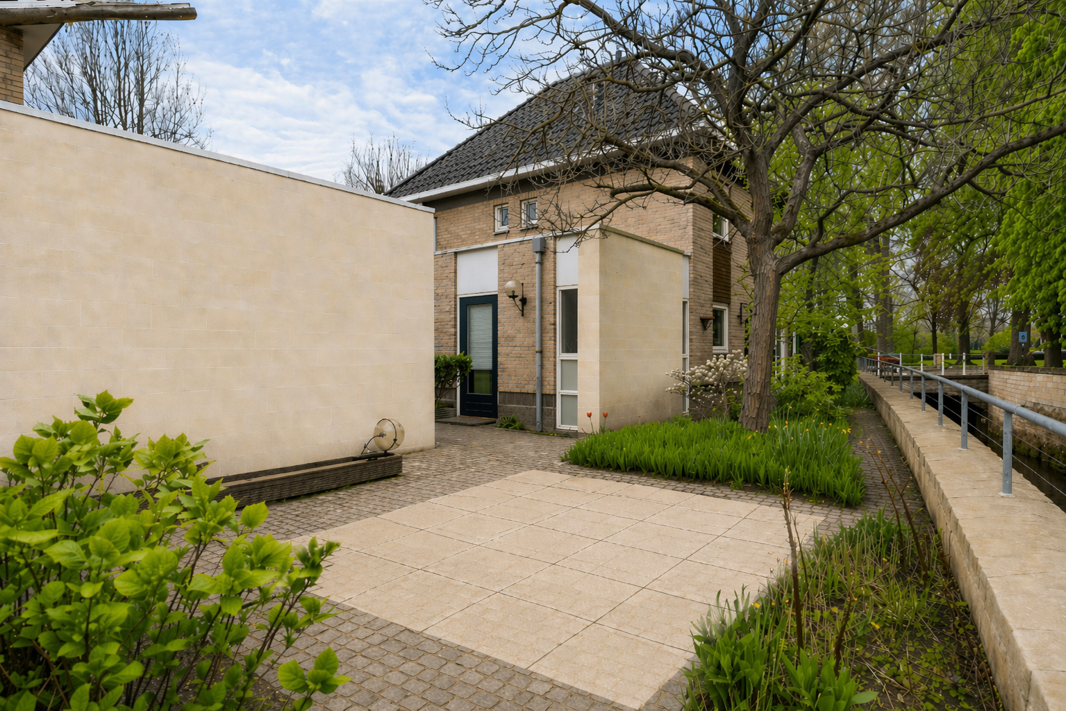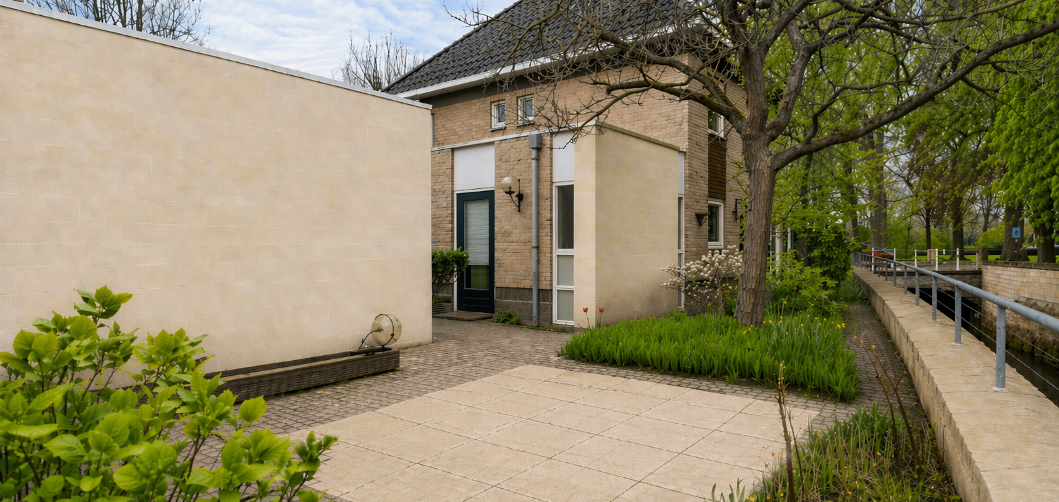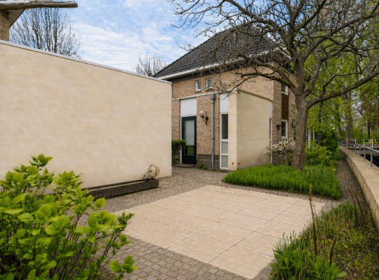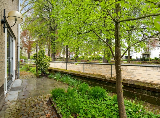 Vlak naast de keuken is er toegang tot de achtertuin, fraai gelegen aan de Geul. Aan de rechterzijde en aan de linkerzijde is een terras, waardoor er gedurende een groot deel van de dag een plek in de zon te vinden is. Aan twee kanten van het woonhuis is een afsluitbare achterom, richting de voortuin en oprit.