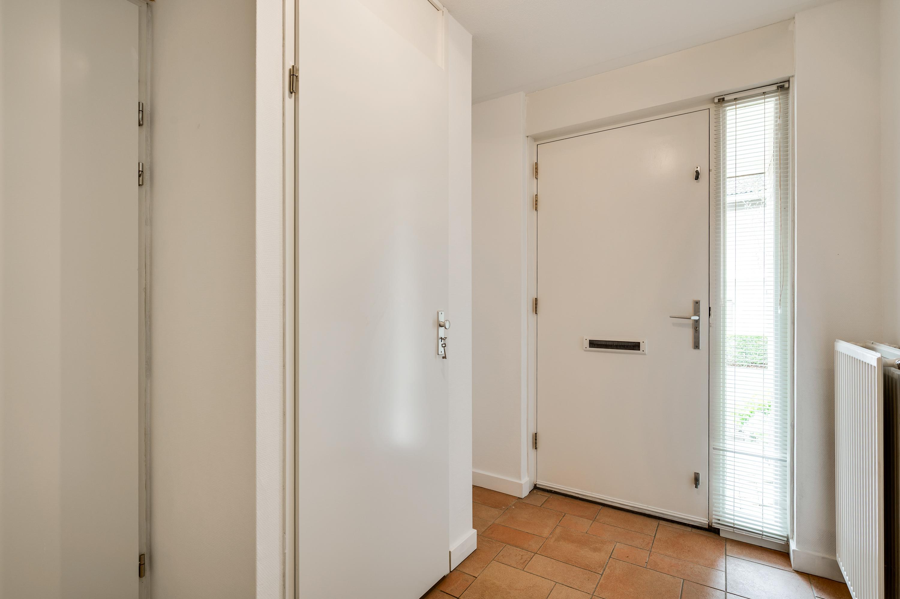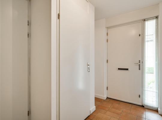 Links van de oprit en garage is de overdekte entree van dit fraaie woonhuis. In de ontvangsthal (circa 2,67 x 2,29) ligt een tegelvloer, net als in de woon-/eetkamer en keuken. Naast de trap is de toiletruimte met fonteintje en aan de andere zijde, naast de meterkast, is de garderobenis.