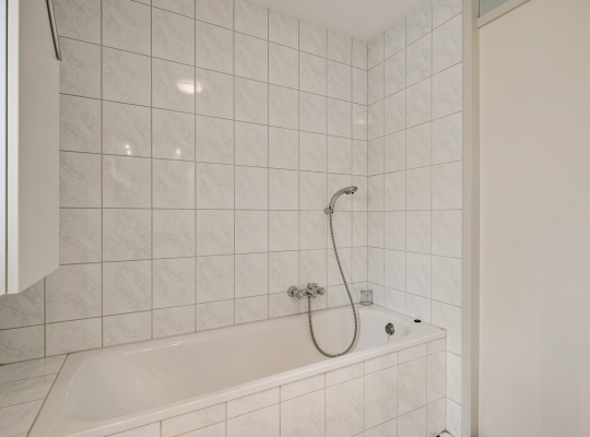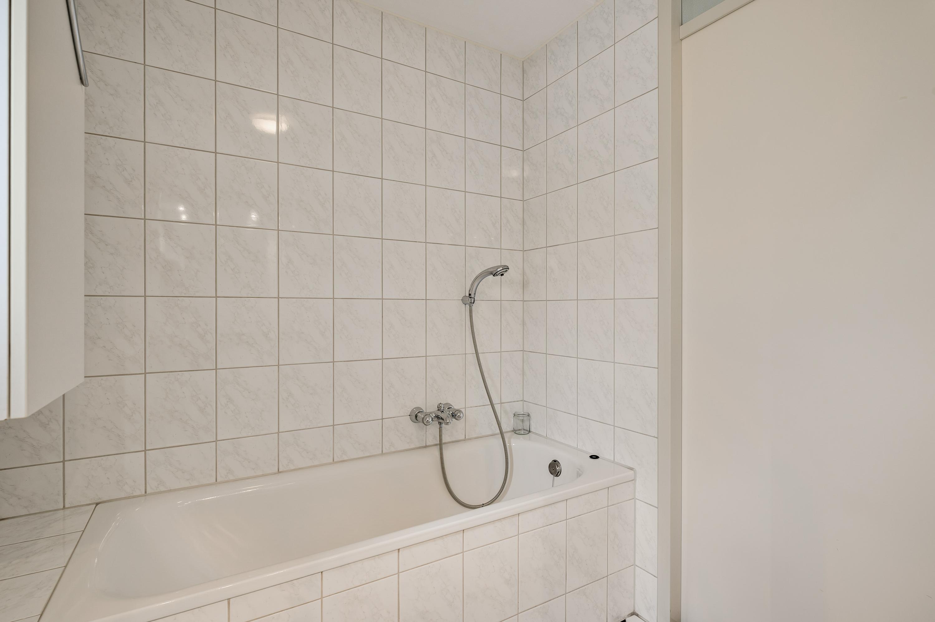 De badkamer (circa 2,74 x 1,90) is ingedeeld met een ligbad, aparte douche en een wastafelmeubel. Aan de andere zijde van de overloop is de toiletruimte, uitgevoerd in dezelfde stijl.