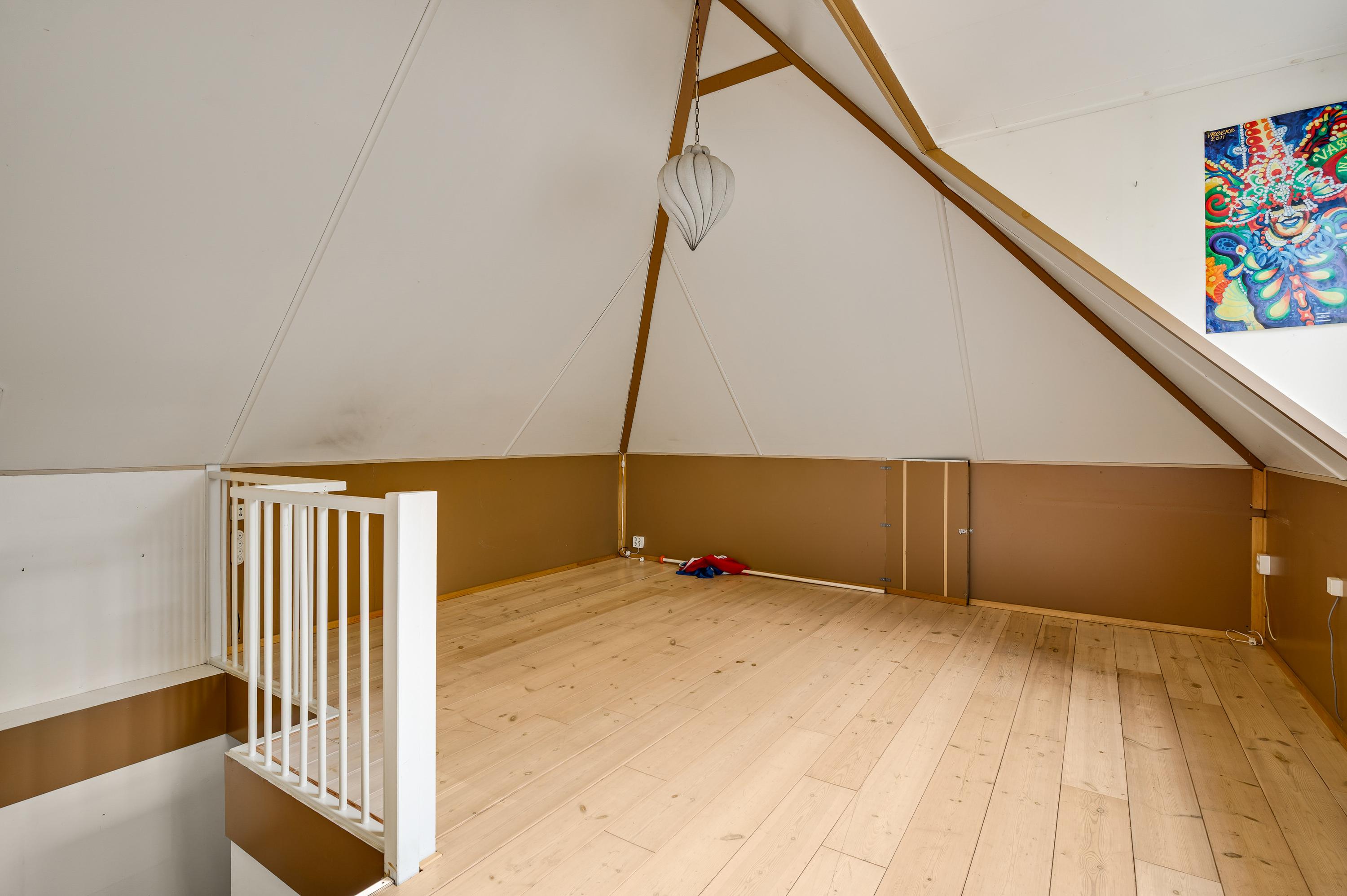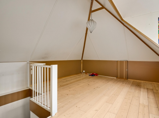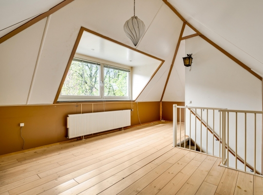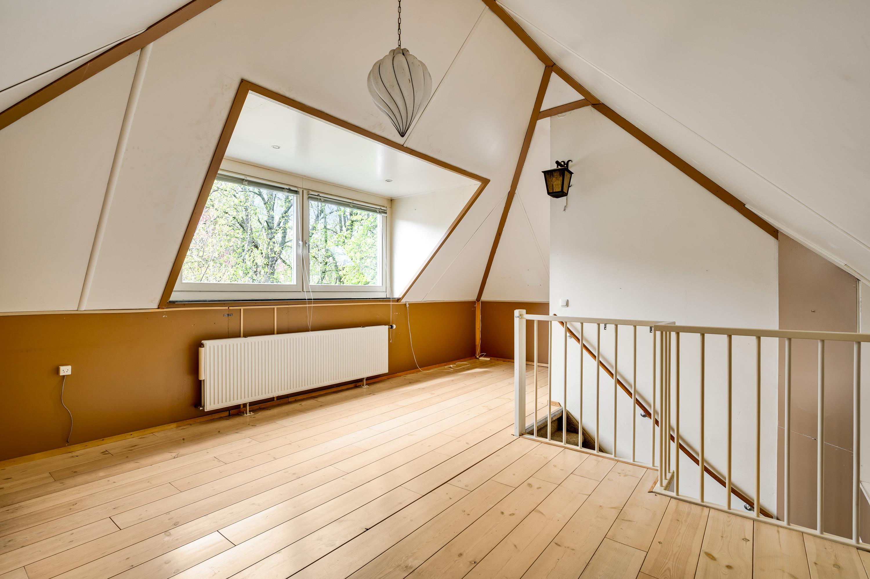 Achter een van de deuren op de overloop is een vaste trap naar de tweede verdieping. Hier heeft u de beschikking over een grote, multifunctionele kamer (circa 6,78 x 4,60) met een dakkapel, hoge nok en een houten vloer. Op een verscholen plek, achter een muurtje, is de opstelling van de HR-ketel (Gehuurd) en de ventilatieunit.