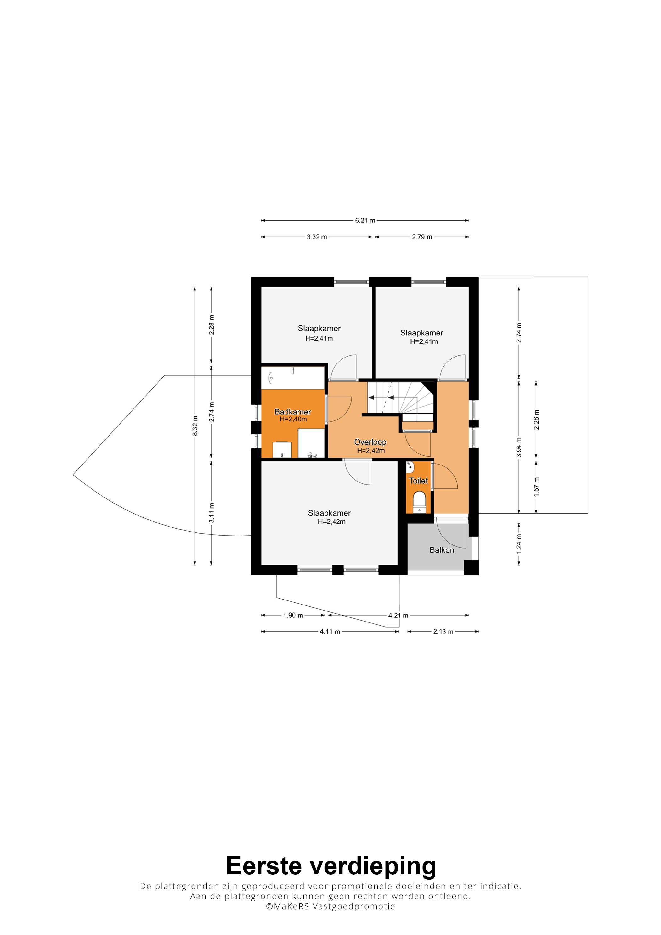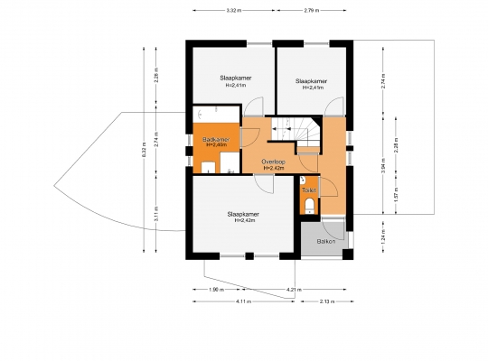 Aan de voorzijde is slaapkamer I (circa 4,11 x 3,1), met uitzicht op de rustige Oranjelaan. Slaapkamer II (circa 3,32 x 2,74/2,28) en slaapkamer III (circa 2,79 x 2,74) zijn aan de achterzijde, waar u uitzicht heeft op de Geul en de met groen omzoomde Prins Bernhardlaan.