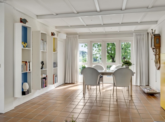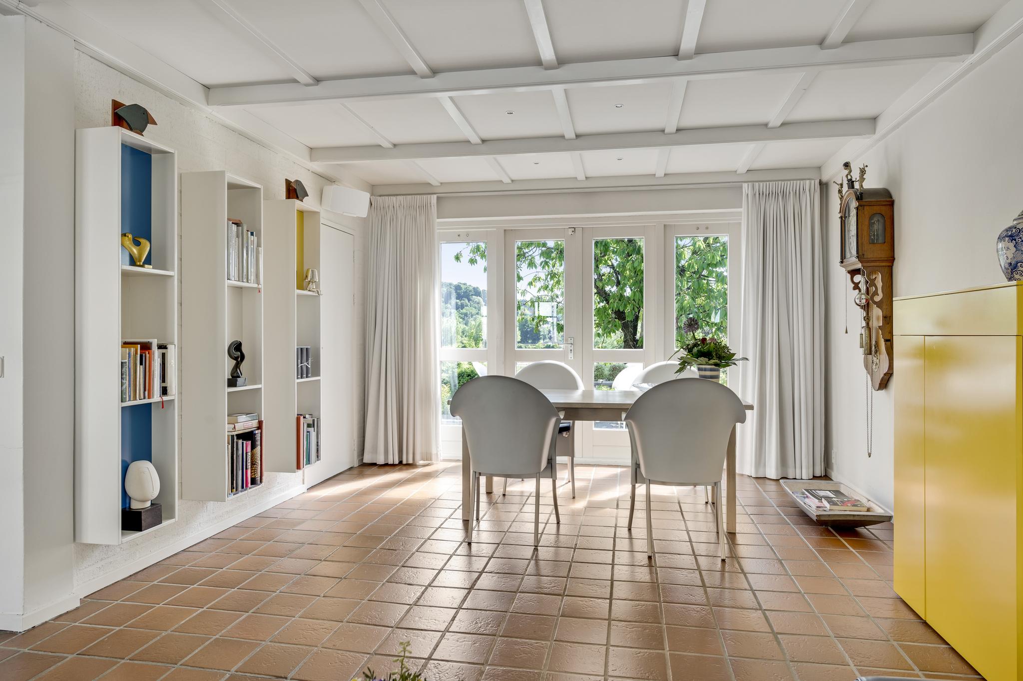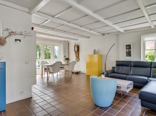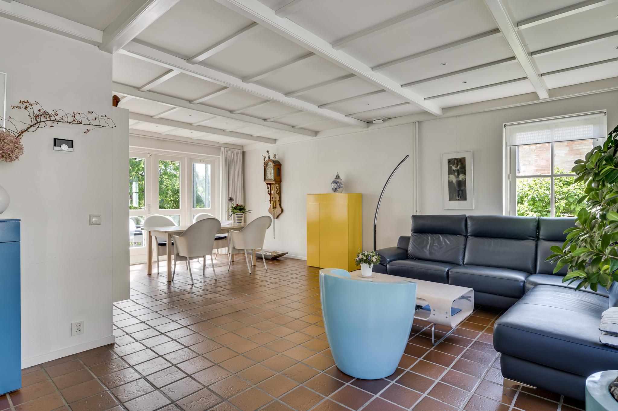 De L-vormige woon-/eetkamer (circa 35 m2) is, dankzij ramen aan drie zijden, heerlijk licht. Het zitgedeelte is aan de voorzijde en het eetgedeelte aan de achterzijde, bij de pui met openslaande tuindeuren.