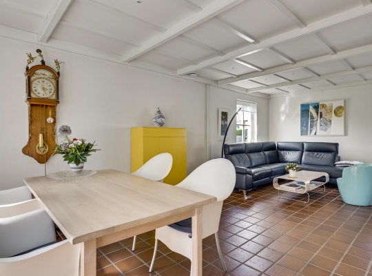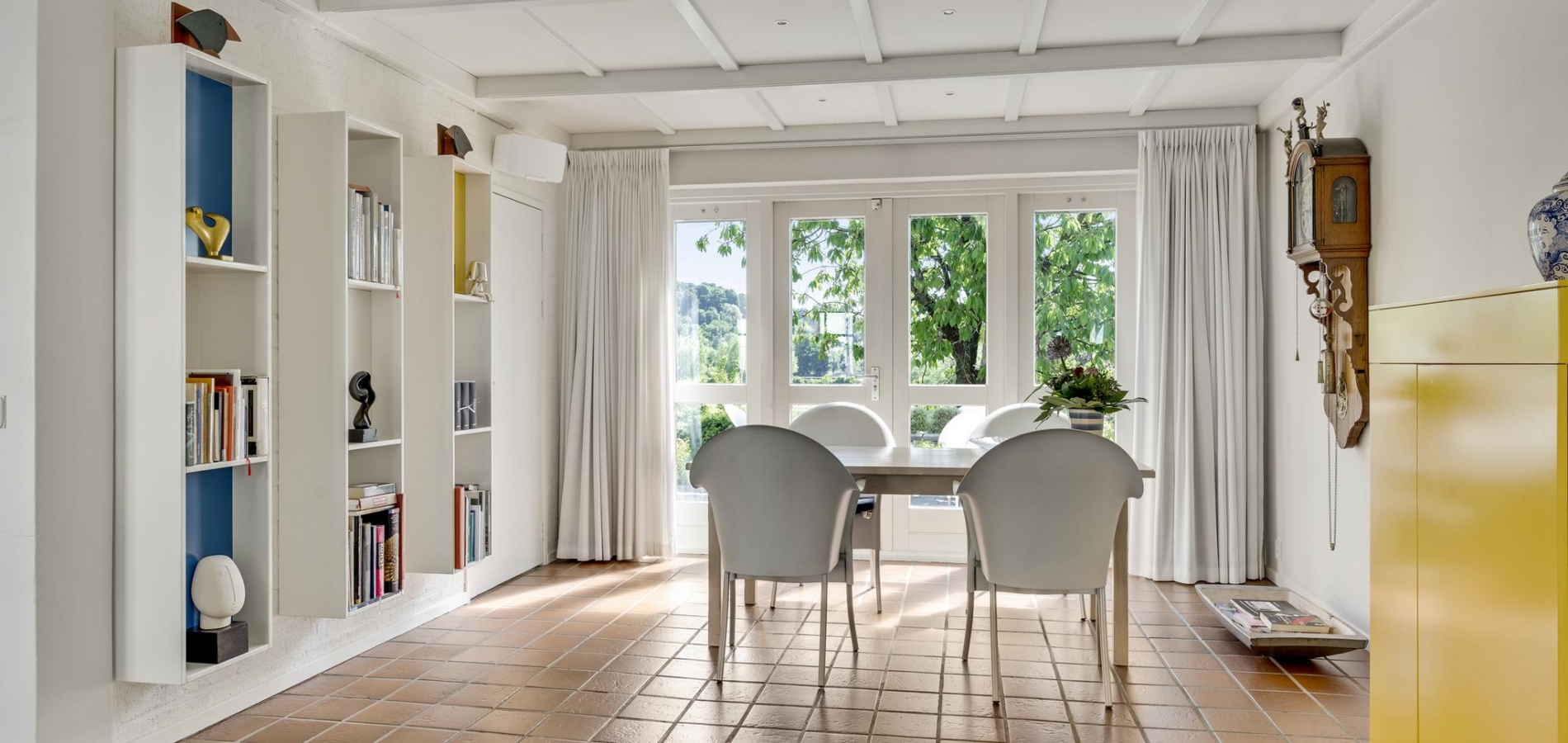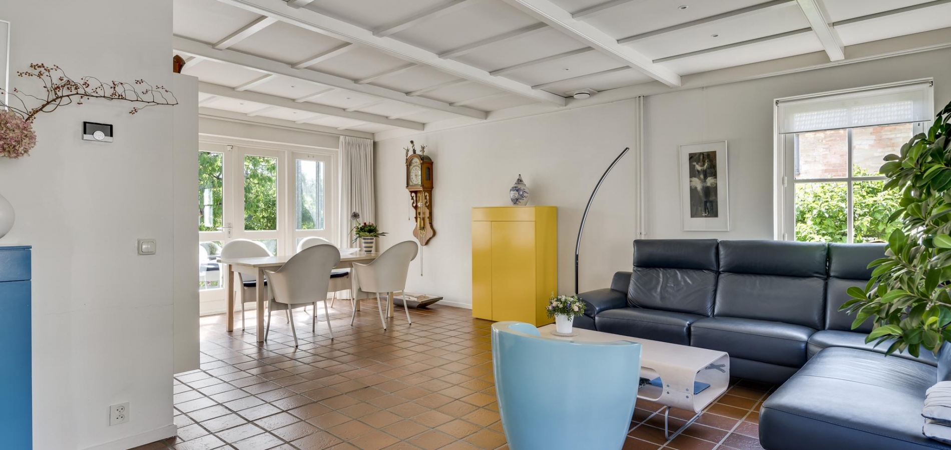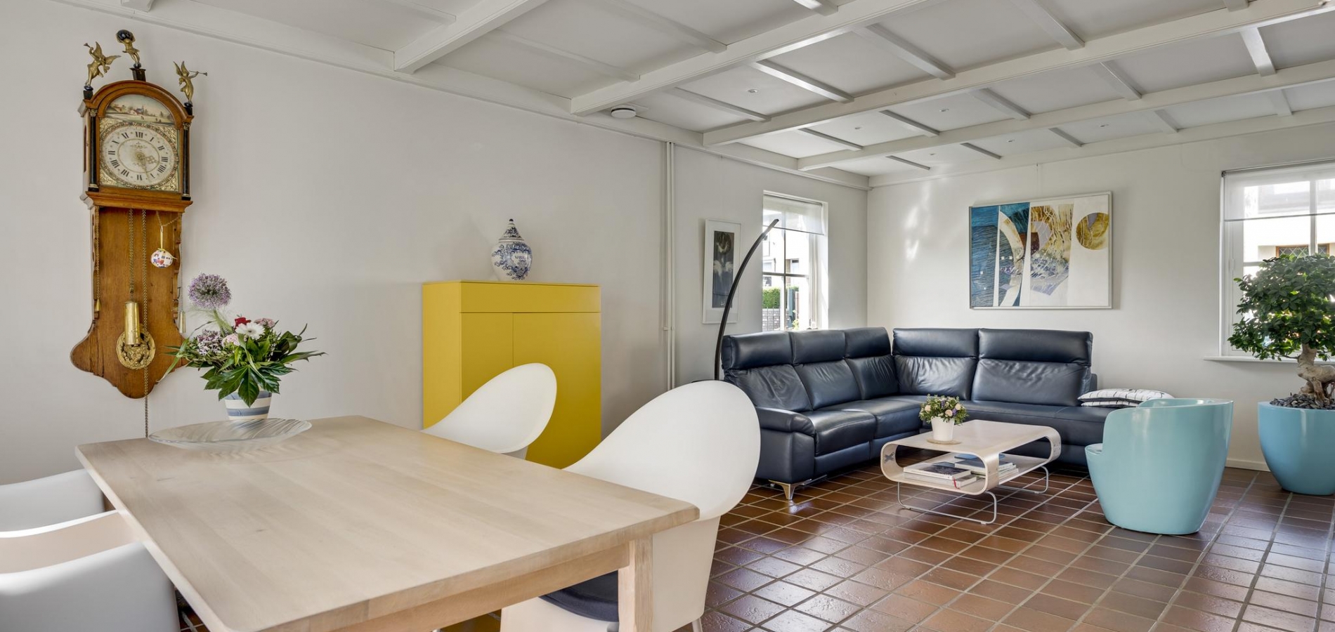 De L-vormige woon-/eetkamer (circa 35 m2) is, dankzij ramen aan drie zijden, heerlijk licht. Het zitgedeelte is aan de voorzijde en het eetgedeelte aan de achterzijde, bij de pui met openslaande tuindeuren.