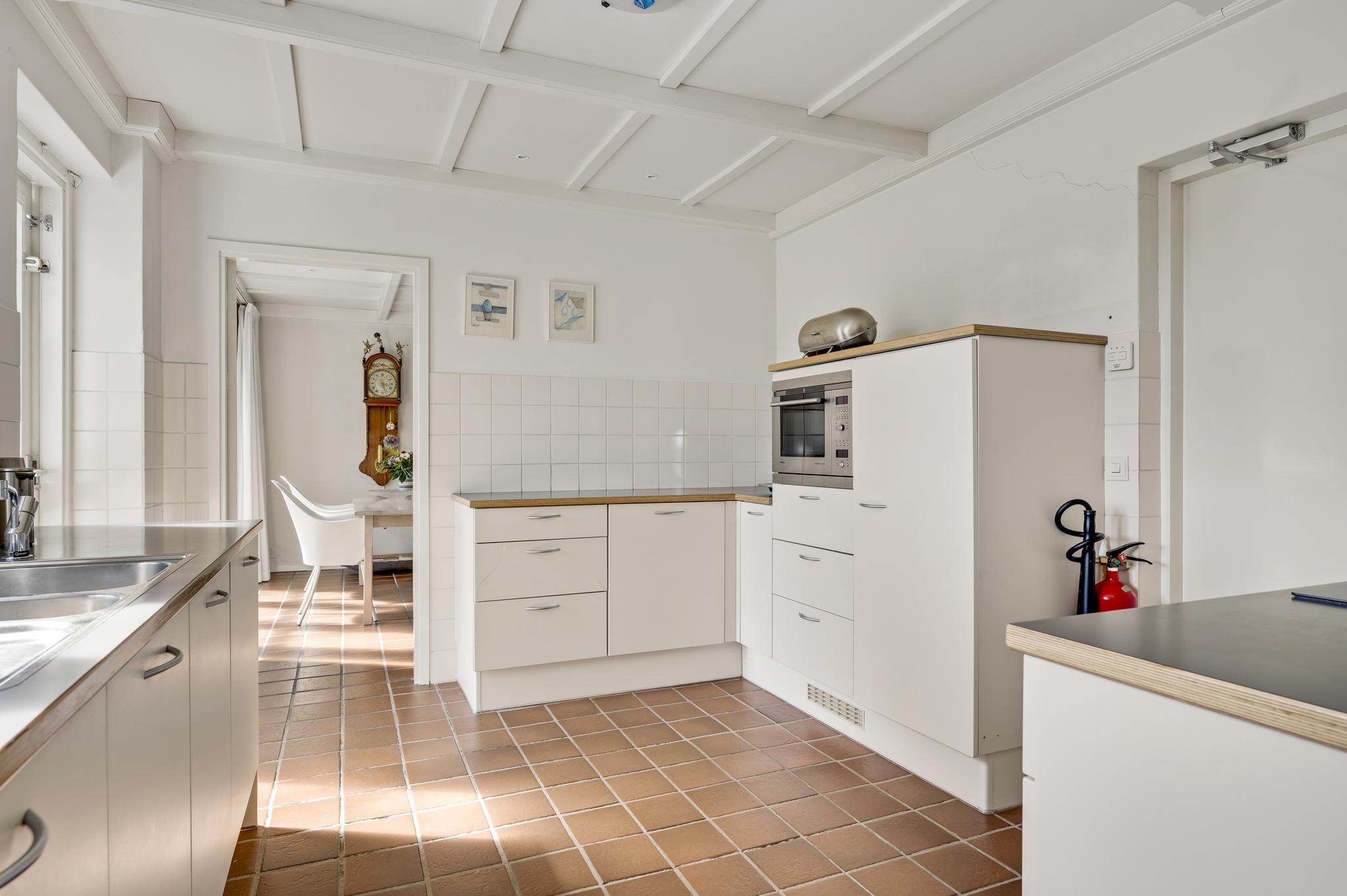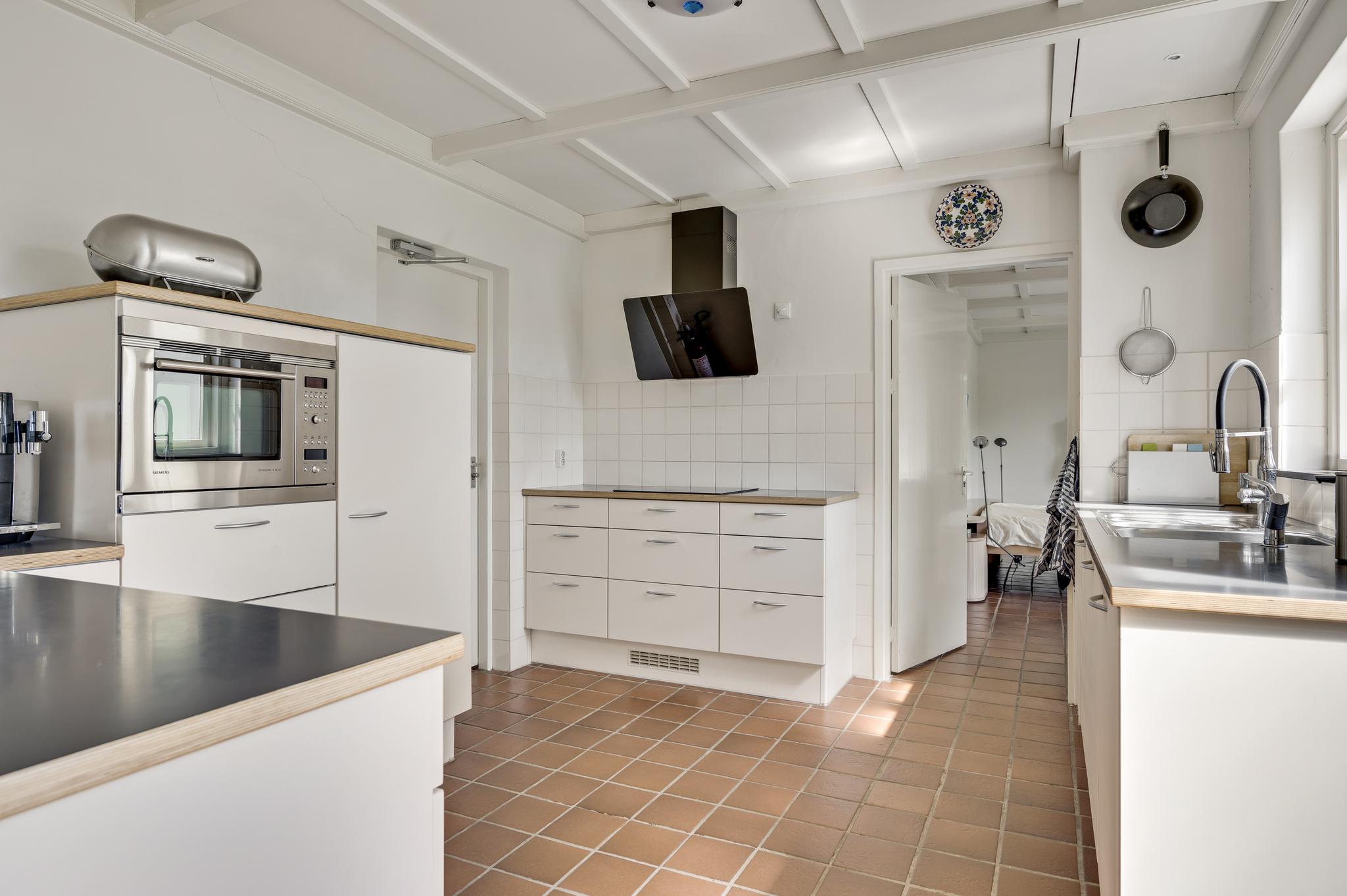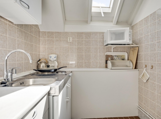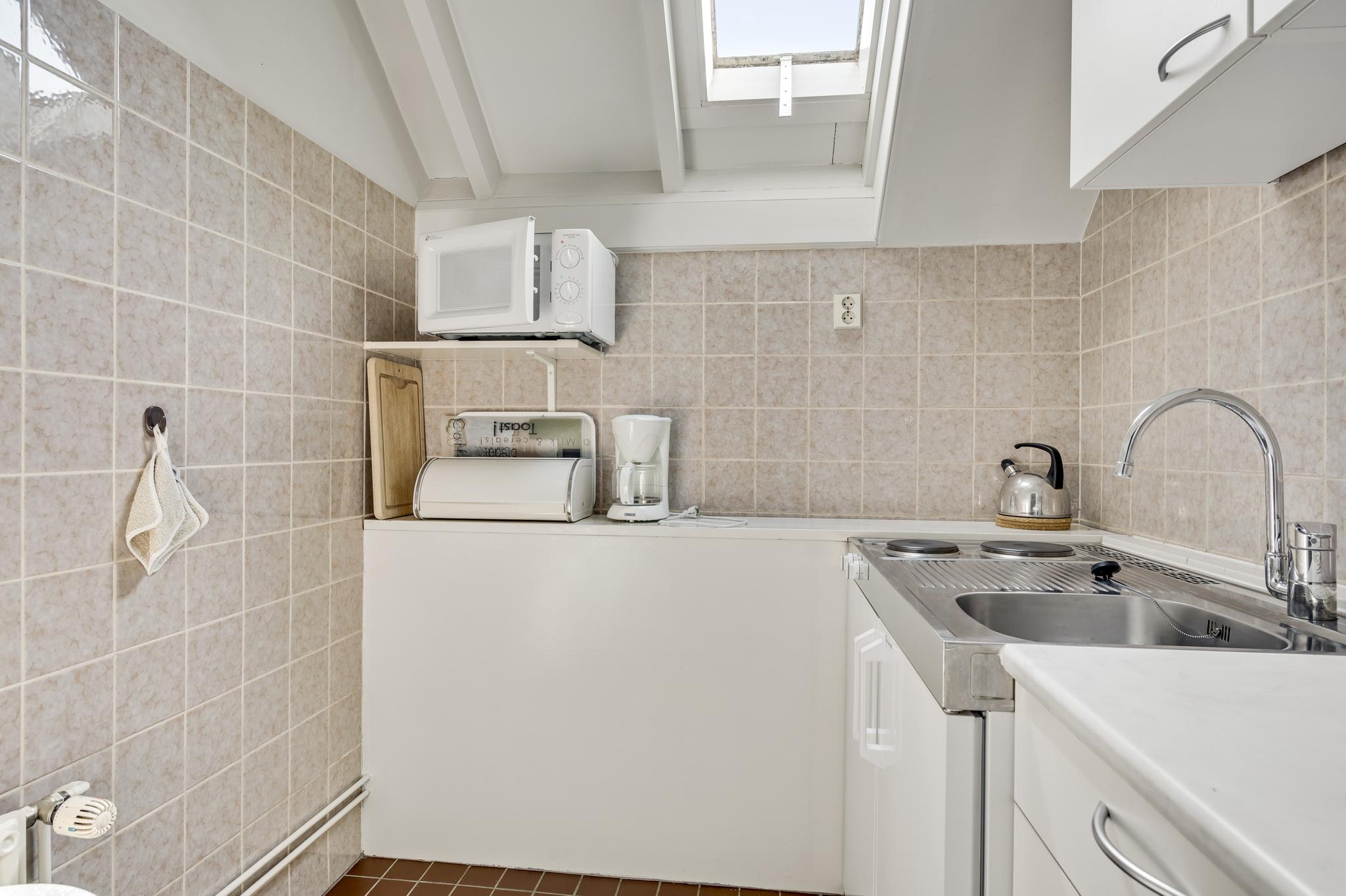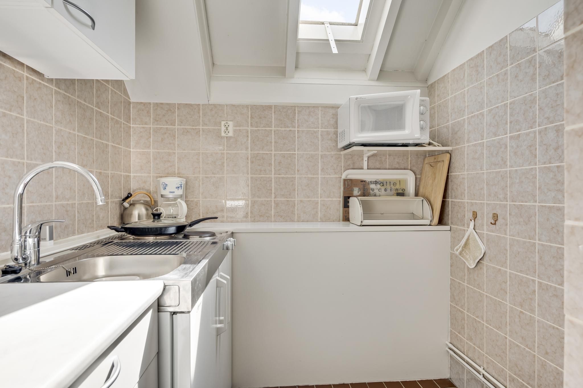 Naast de woonkamer is de keuken (circa 3,82 x 3,20), waar de ruimte optimaal is ingedeeld. Er is een kookgedeelte, een apart spoelgedeelte bij het raam en aan de andere zijde staat een hoekopstelling die deels als koffiecorner in gebruik is. De inductie kookplaat, afzuigkap, vaatwasser, combi-oven, vaatwasser en koelkast zijn ingebouwd.