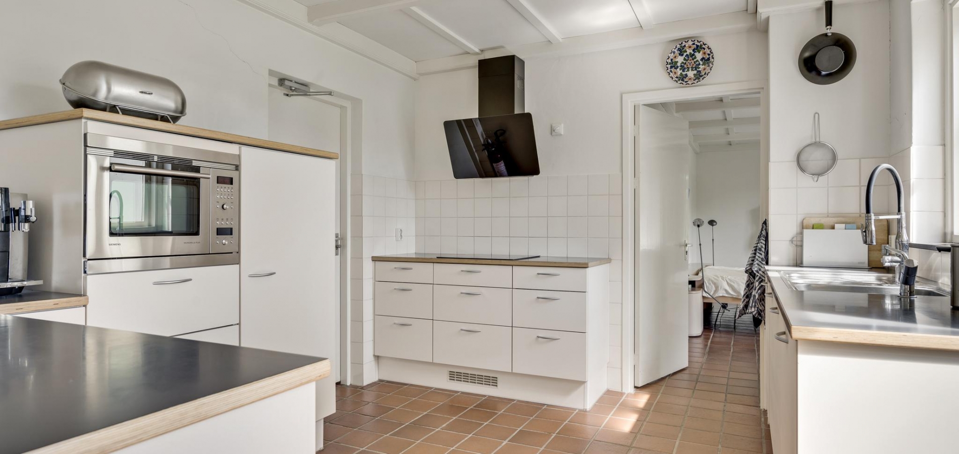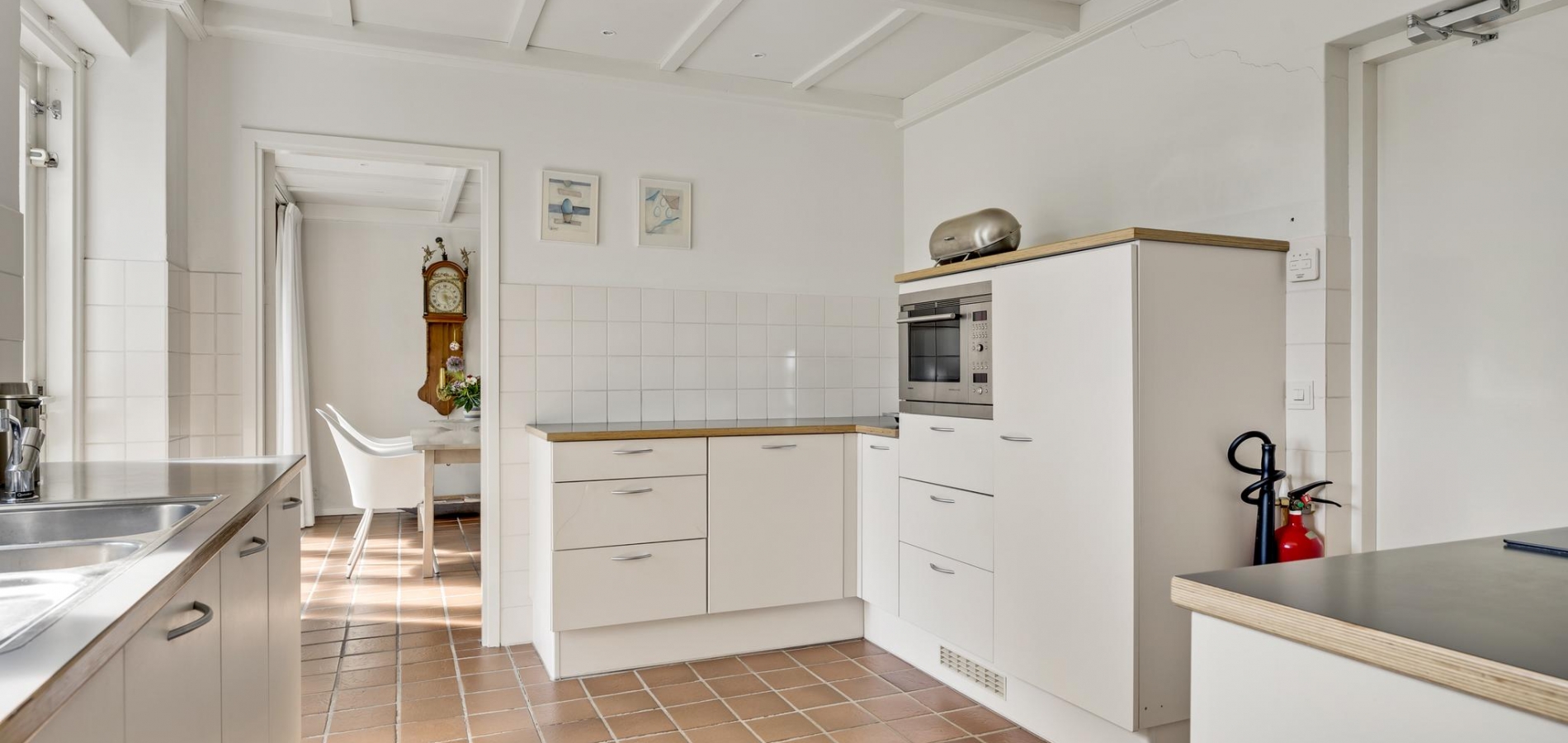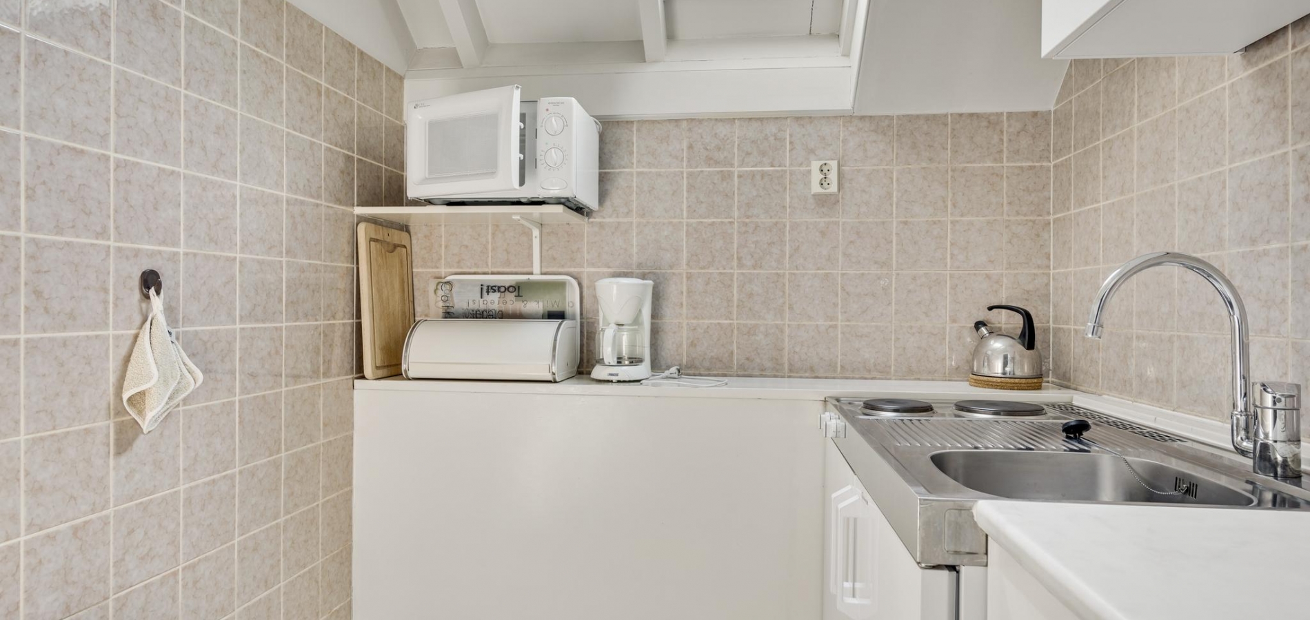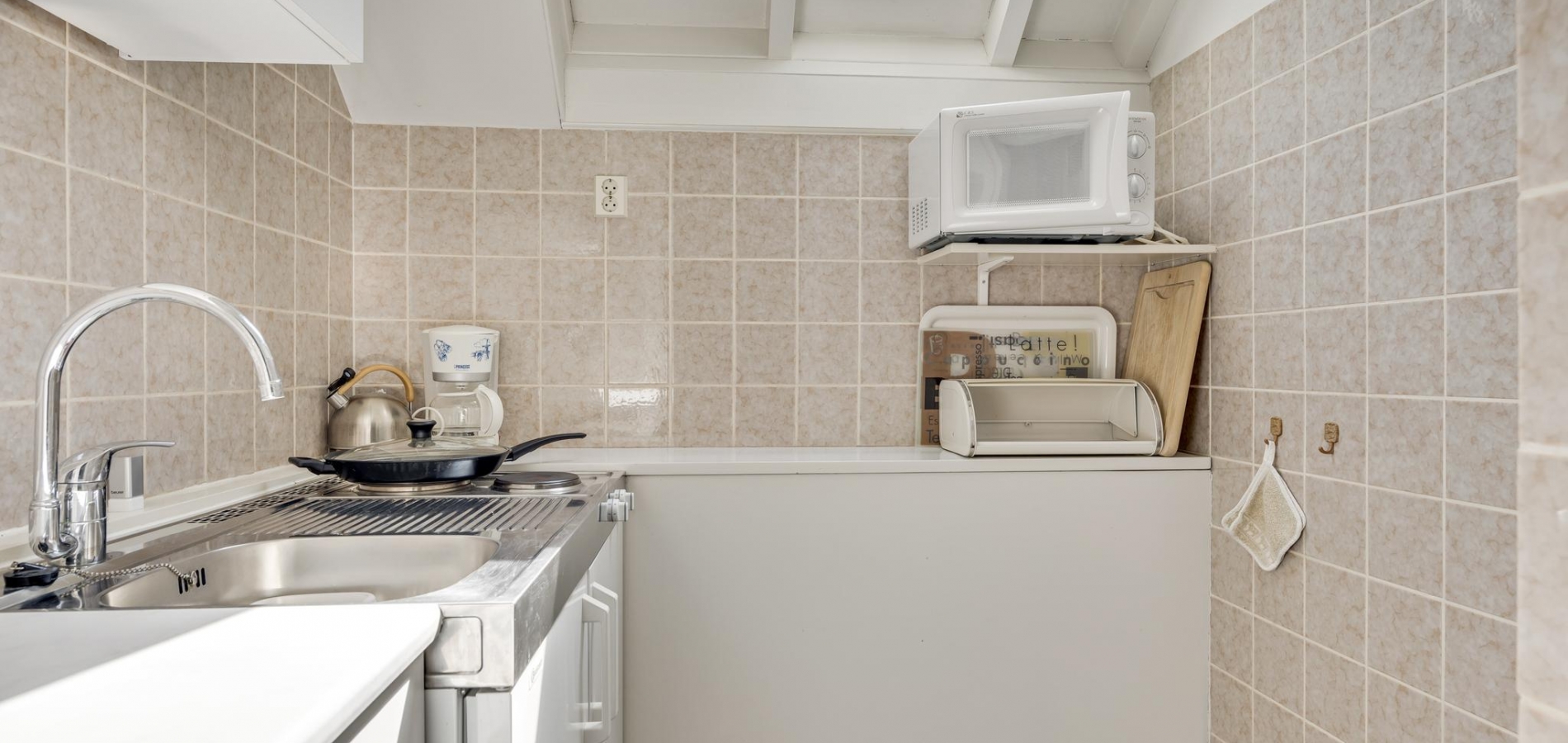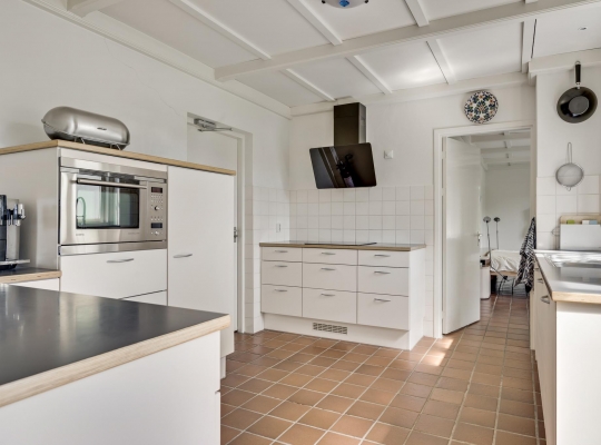 Naast de woonkamer is de keuken (circa 3,82 x 3,20), waar de ruimte optimaal is ingedeeld. Er is een kookgedeelte, een apart spoelgedeelte bij het raam en aan de andere zijde staat een hoekopstelling die deels als koffiecorner in gebruik is. De inductie kookplaat, afzuigkap, vaatwasser, combi-oven, vaatwasser en koelkast zijn ingebouwd.