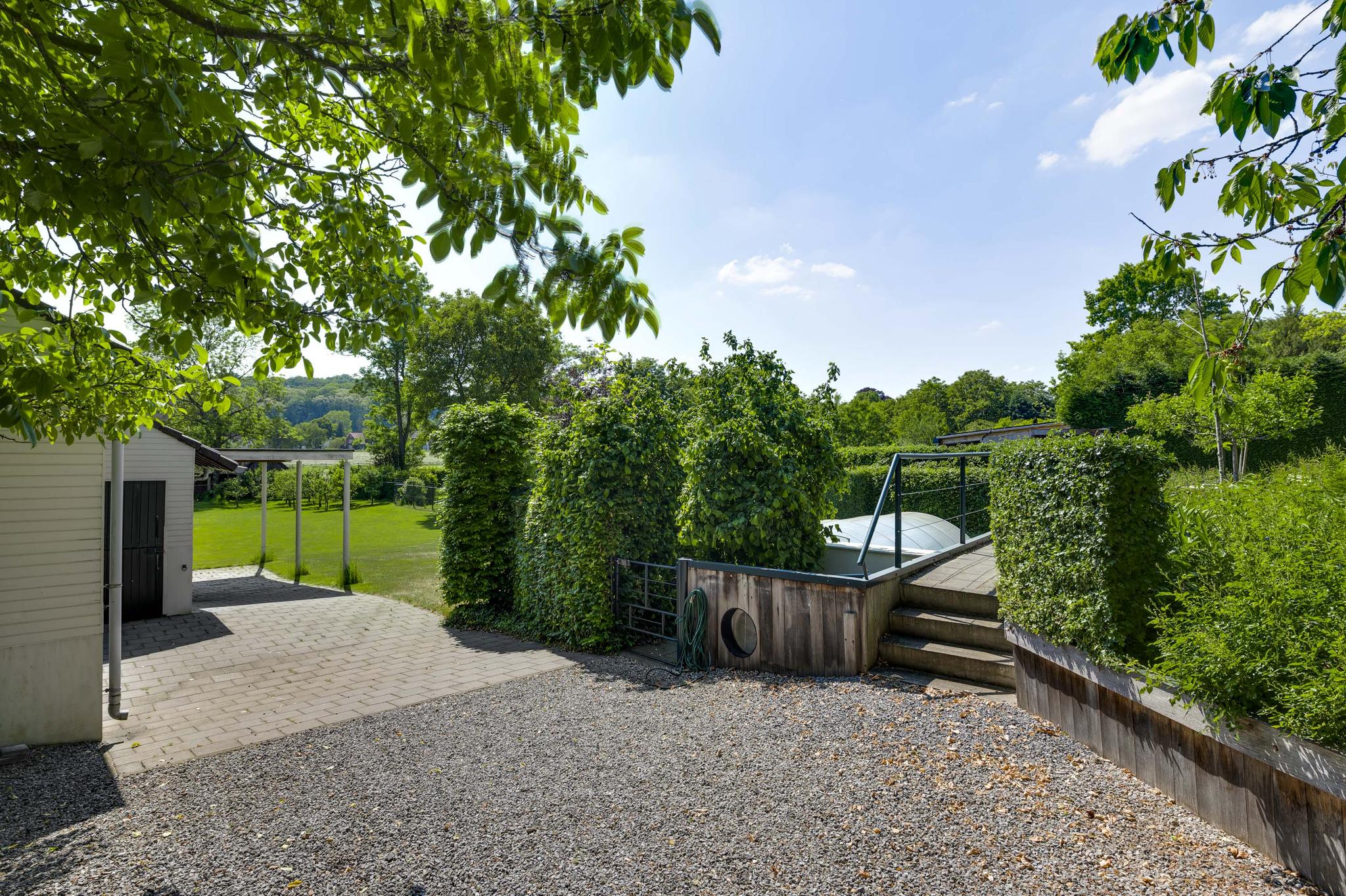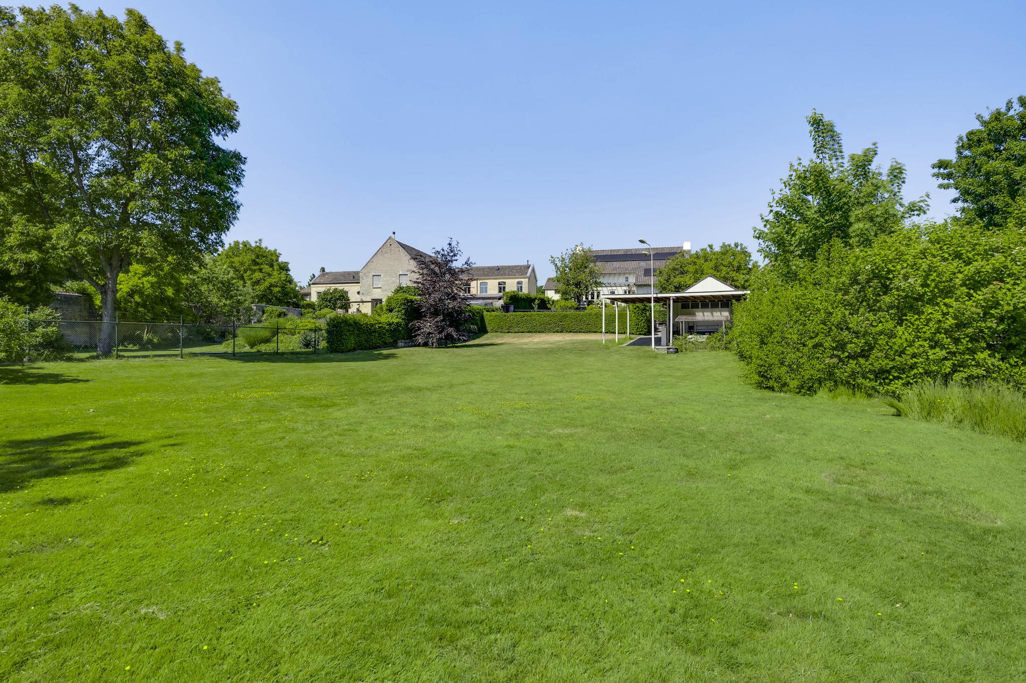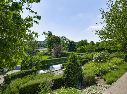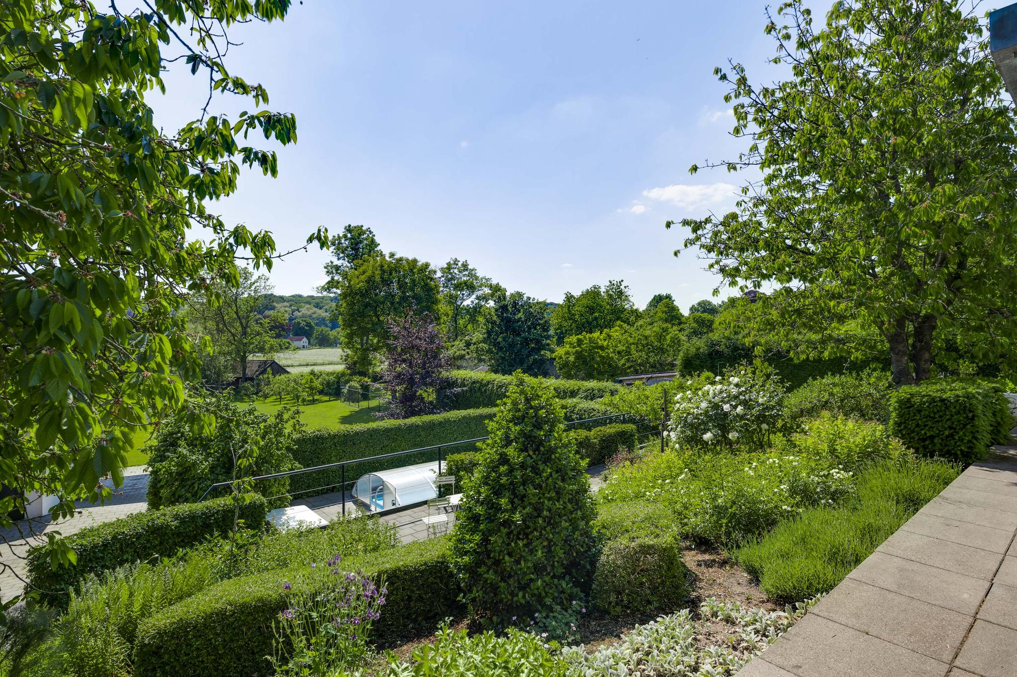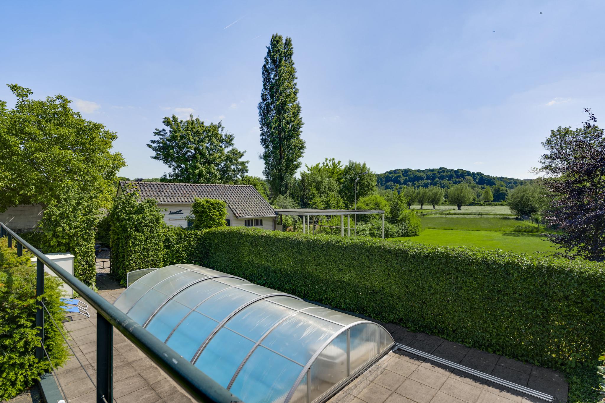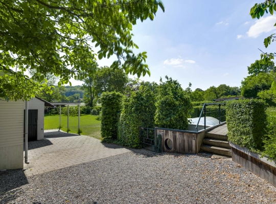 Op begane grondniveau is een groot, overdekt terras met prachtig uitzicht naar de tuin, de huisweide, het Geuldal en de Geulhemmerberg. De tuin is aangelegd in meerdere niveaus, met een zonneterras en een zwembad.