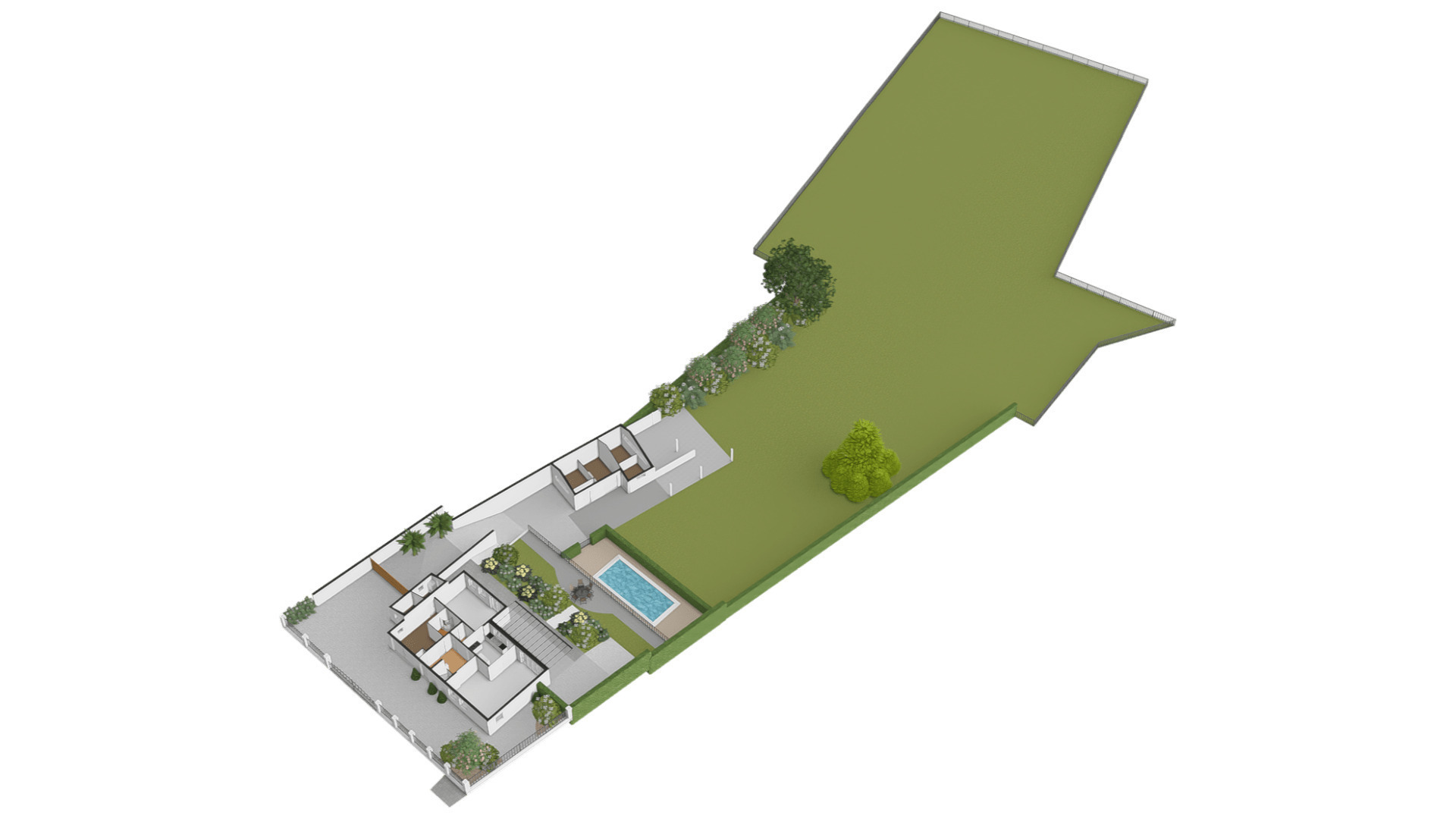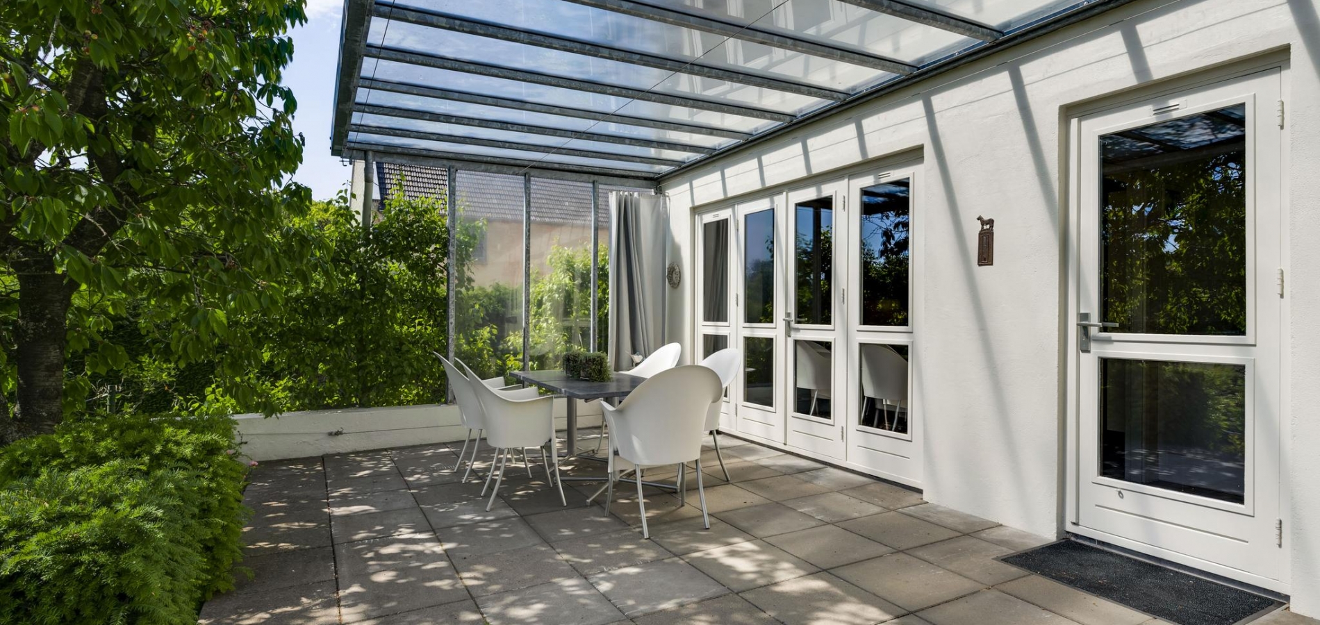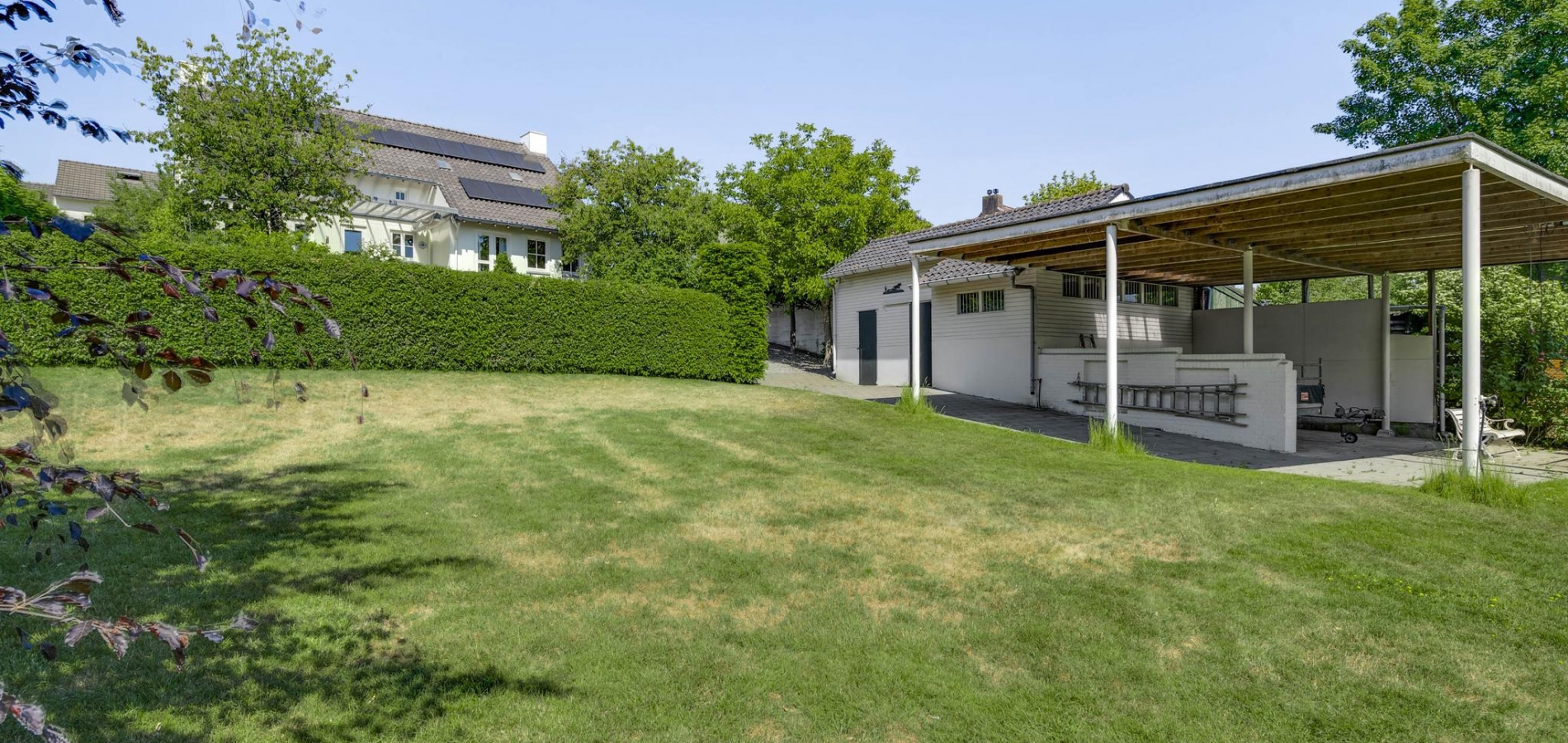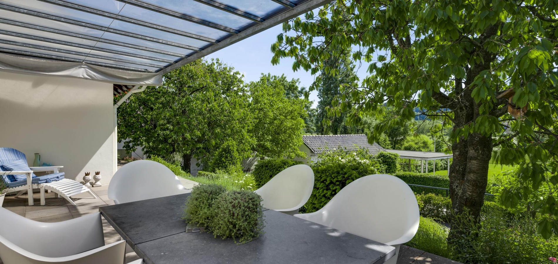 Op begane grondniveau is een groot, overdekt terras met prachtig uitzicht naar de tuin, de huisweide, het Geuldal en de Geulhemmerberg. De tuin is aangelegd in meerdere niveaus, met een zonneterras en een zwembad.