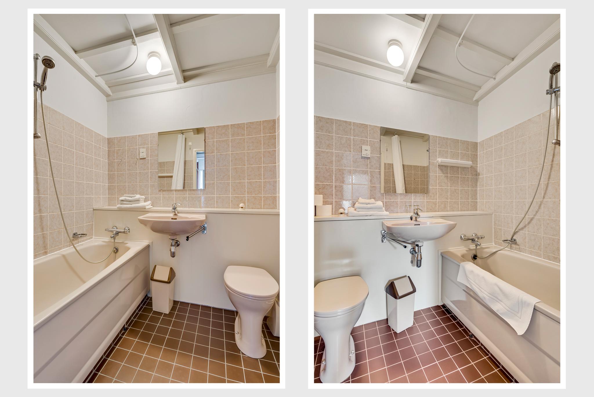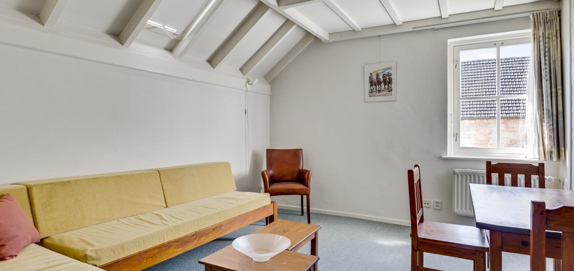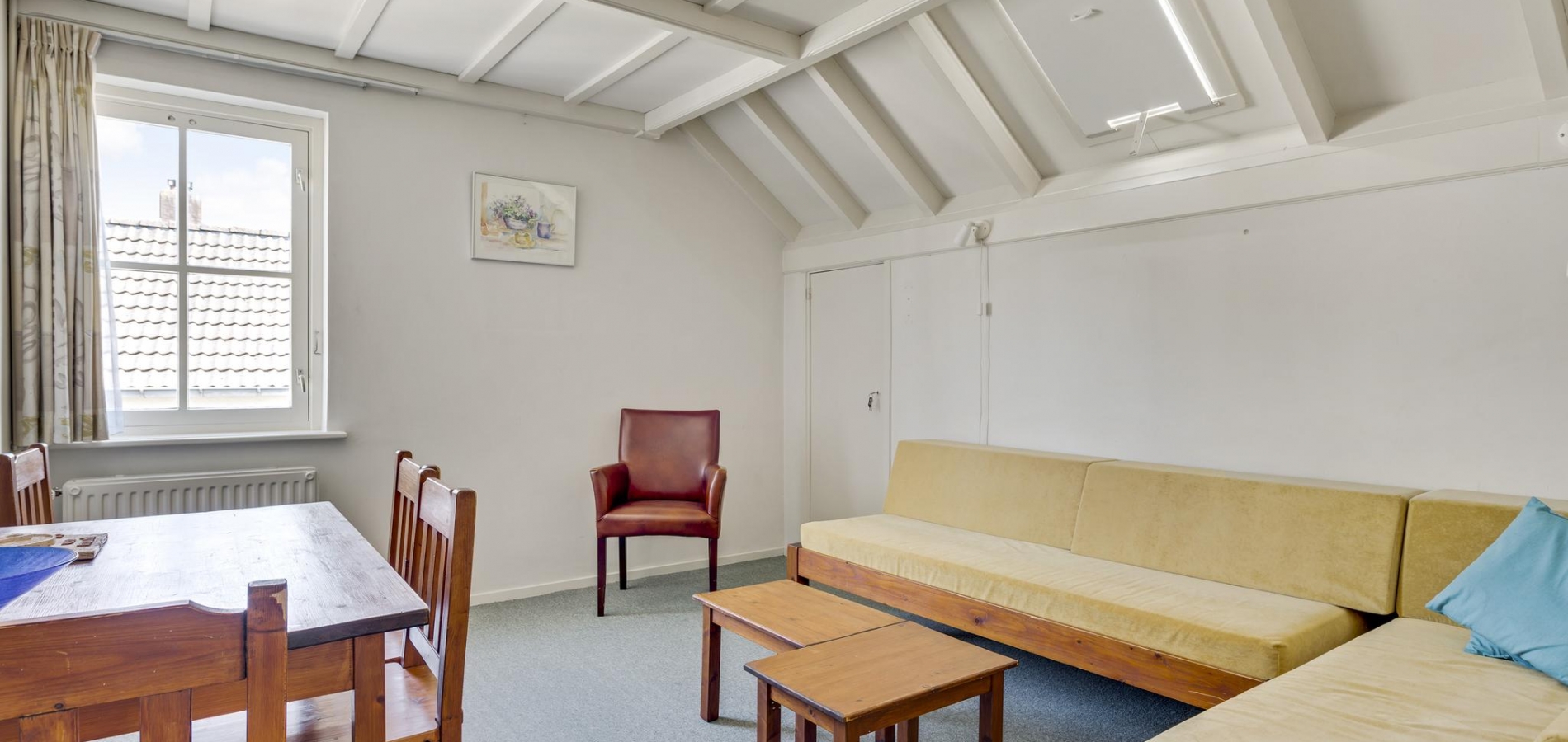 Appartement 1 is aan de rechterzijde van de woning. Vanuit de privéhal gaat u eerst naar slaapkamer II (circa 3,80 x 3,48), en vervolgens naar de naastgelegen badkamer (circa 2,00 x 2,52) met een ligbad, toilet en wastafel. Aan de achterzijde zijn een woon-/slaapkamer (circa 4,10 x 3,50) met dakraam en de keuken met eenvoudig keukenblok.