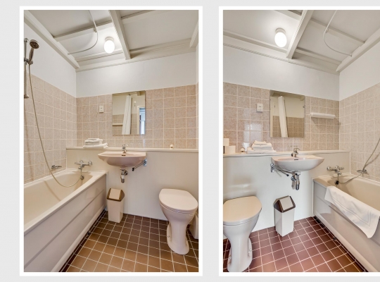 Alle voorzieningen om gelijkvloers te wonen zijn op de begane grond, maar boven zijn nog twee slaapkamers, twee badkamers, twee woonkamers en twee keukens, waarbij elke keuken een eigen koelkast heeft.. In feite zijn het twee appartementen, elk met een eigen toegang vanaf de overloop. Ook is er een berging van circa 2,03 x 1,26), te bereiken vanaf de overloop.