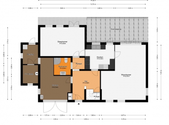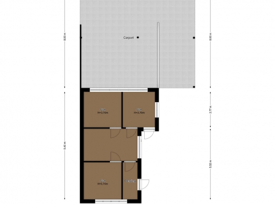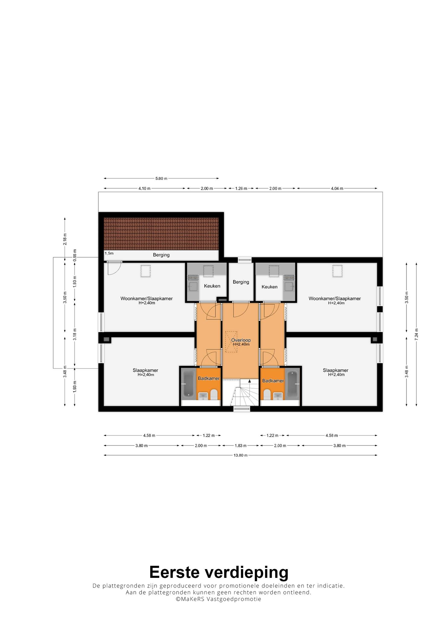 Appartement 2, aan de linkerzijde van de woning, heeft een identieke indeling. Het verschil met appartement 1 is dat er aan de achterzijde een berging (circa 5,82 x 0,55) is, te bereiken vanuit de woon-/slaapkamer.