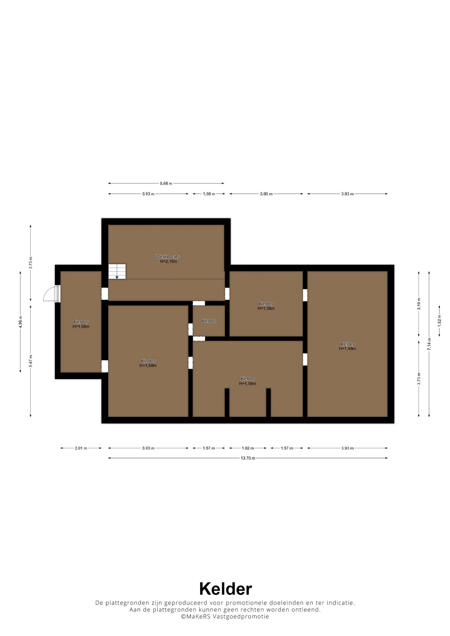 Wat u aan de buitenzijde nauwelijks ziet, is het ruime souterrain met vijf kelderruimtes en een werkplaats. De kelder aan de linkerzijde heeft een buitendeur en de plafondhoogte in de kelderruimtes varieert van circa 1,48 tot 1,67 meter. Aan de achterzijde is de werkplaats van circa 5,68 x 3,78), met een plafondhoogte van circa 2,15 meter.